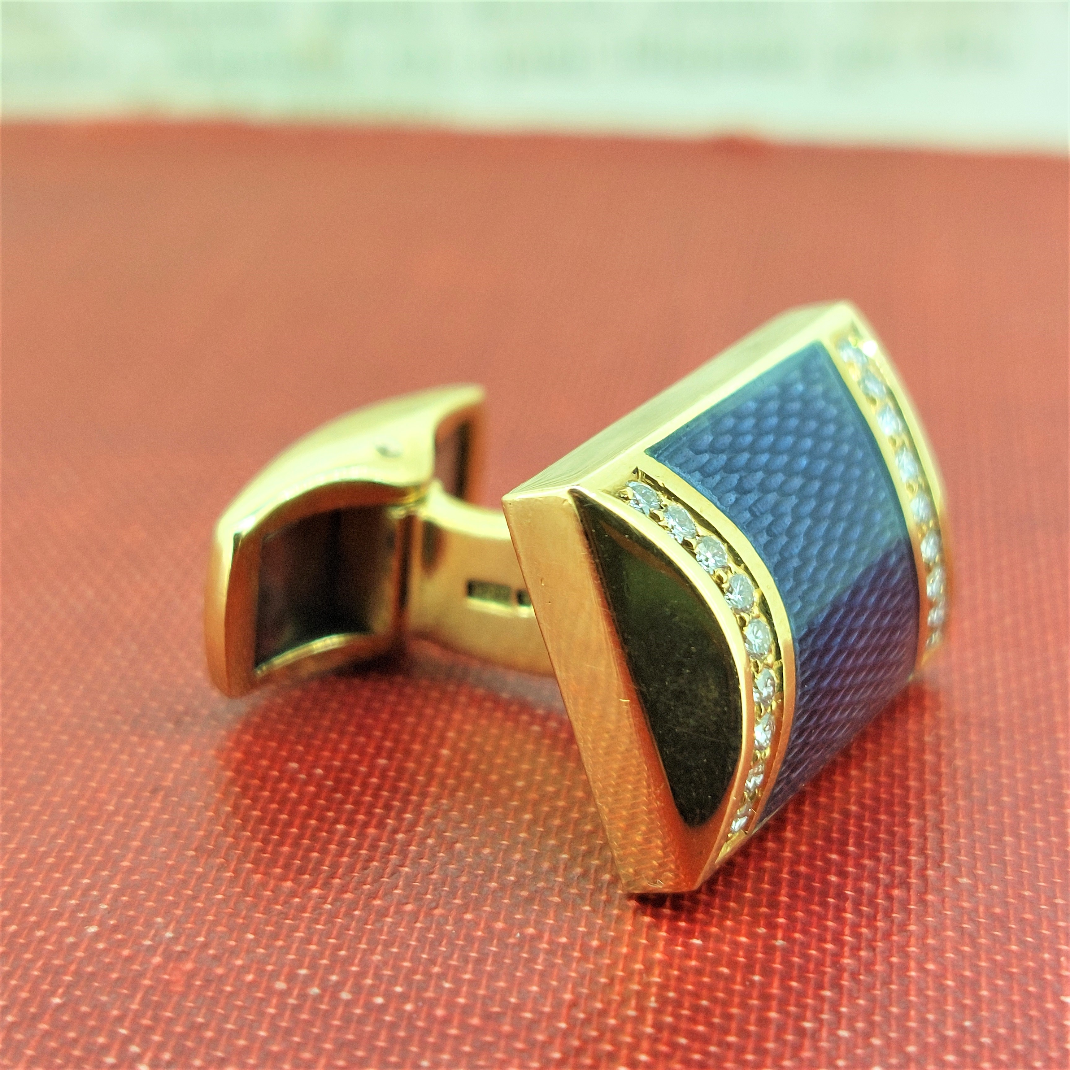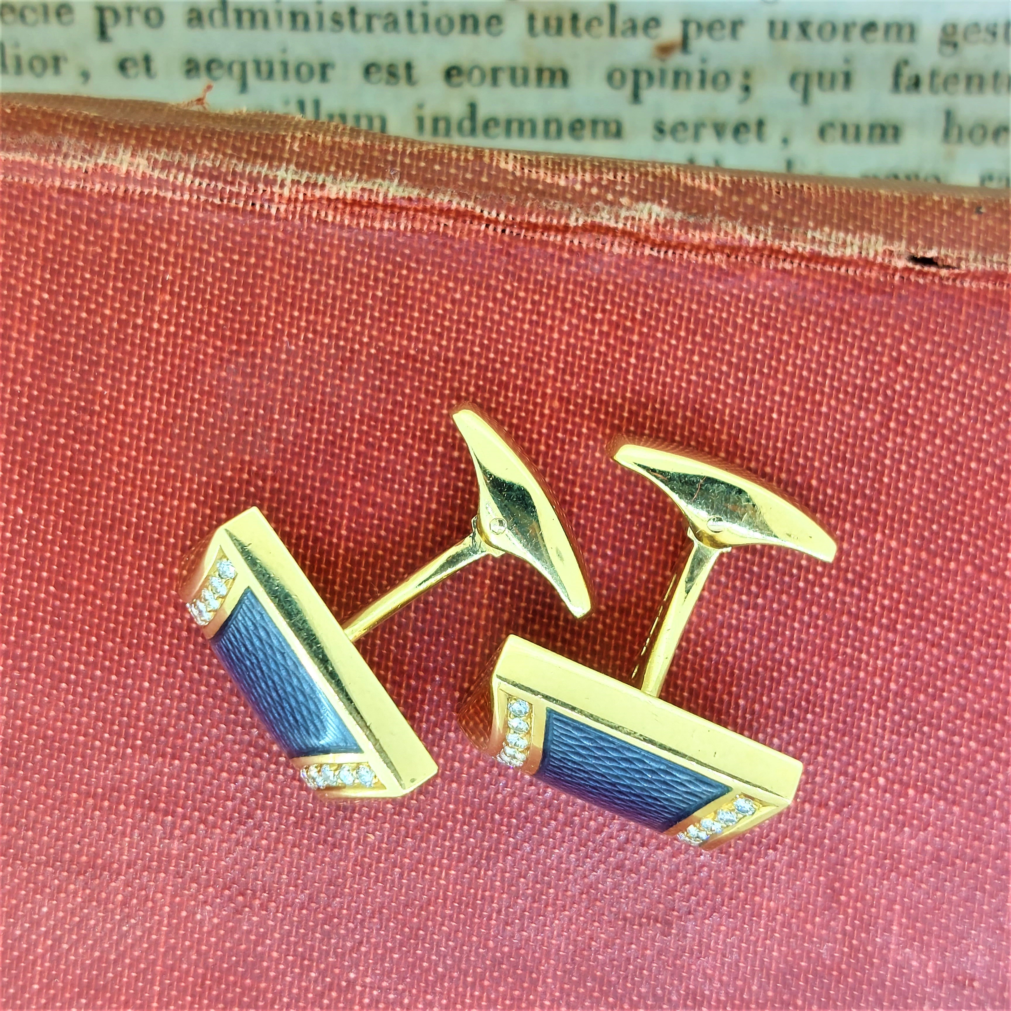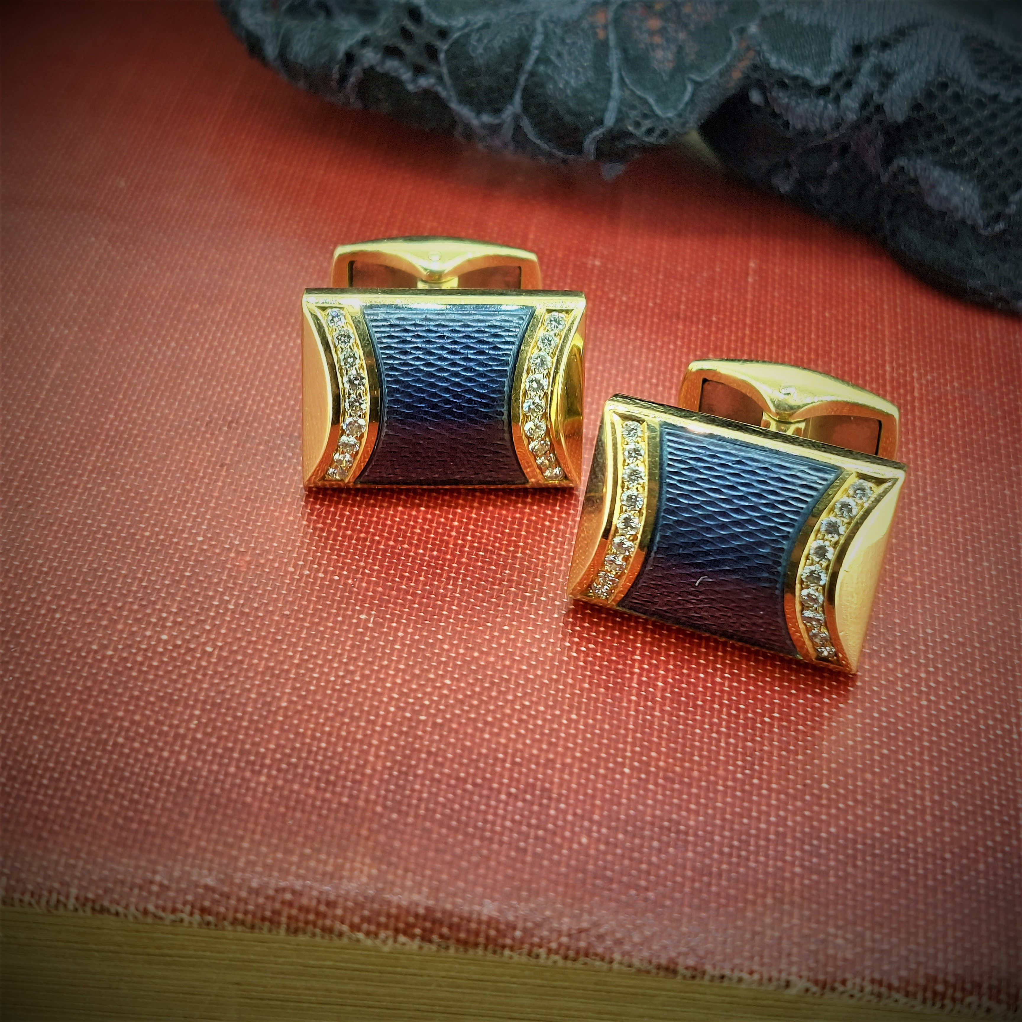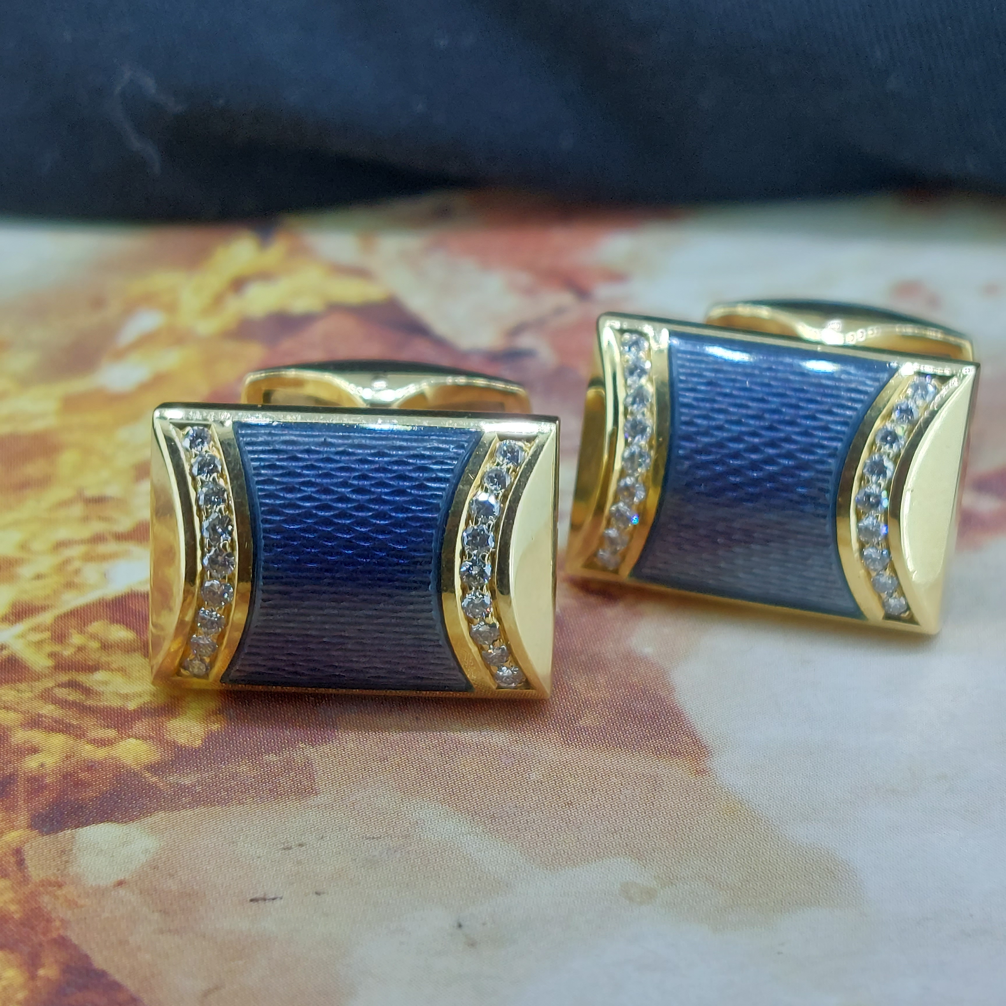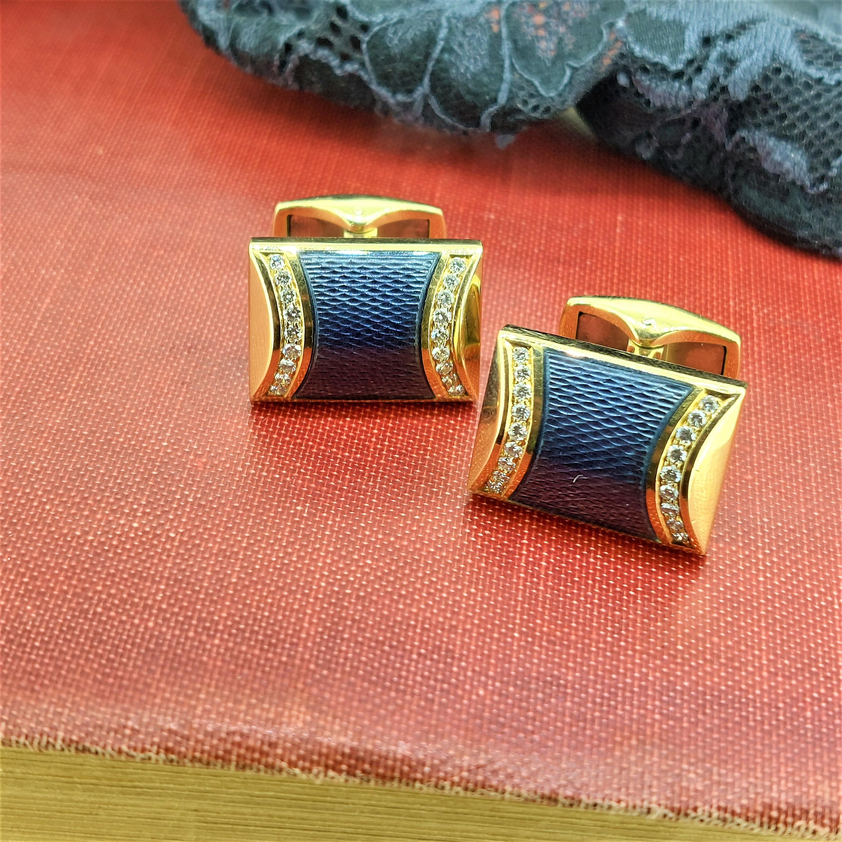 They feature central textured two-tone blue enamel with a smooth curved graduation inset with round brilliant cut diamonds. They're bound to bring attention to your cuff for all the right reasons.