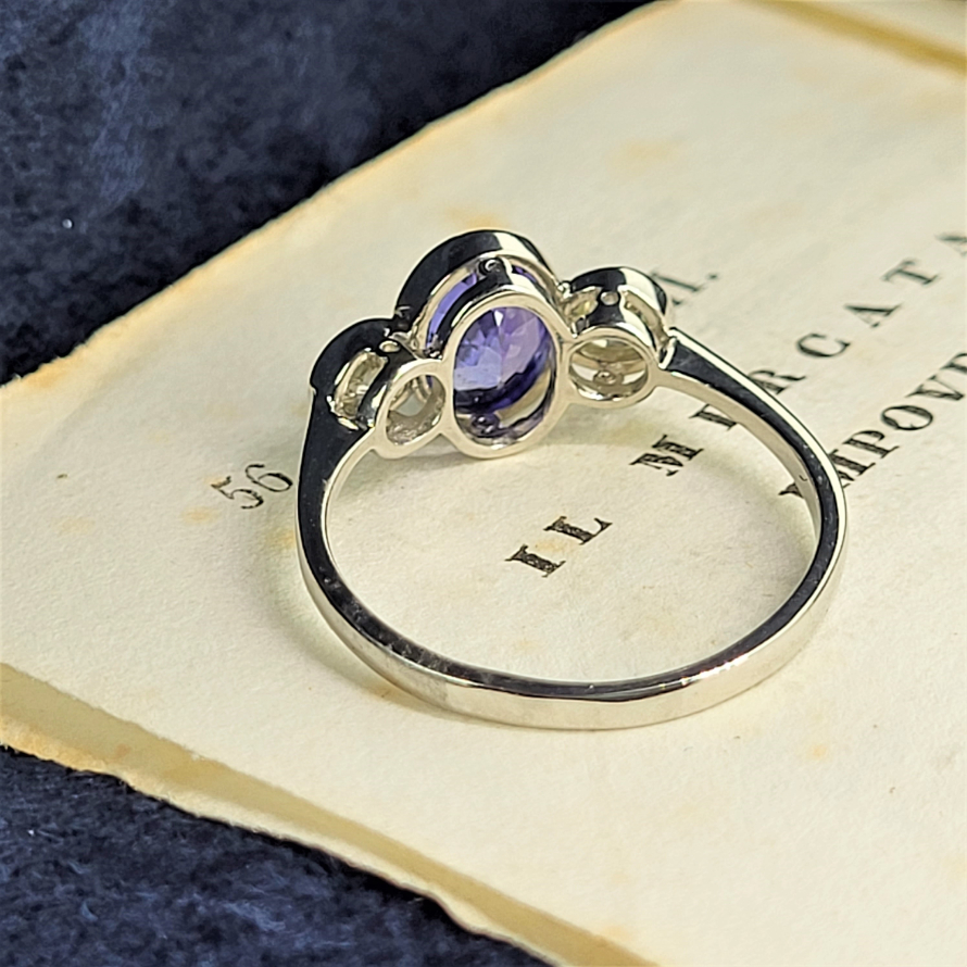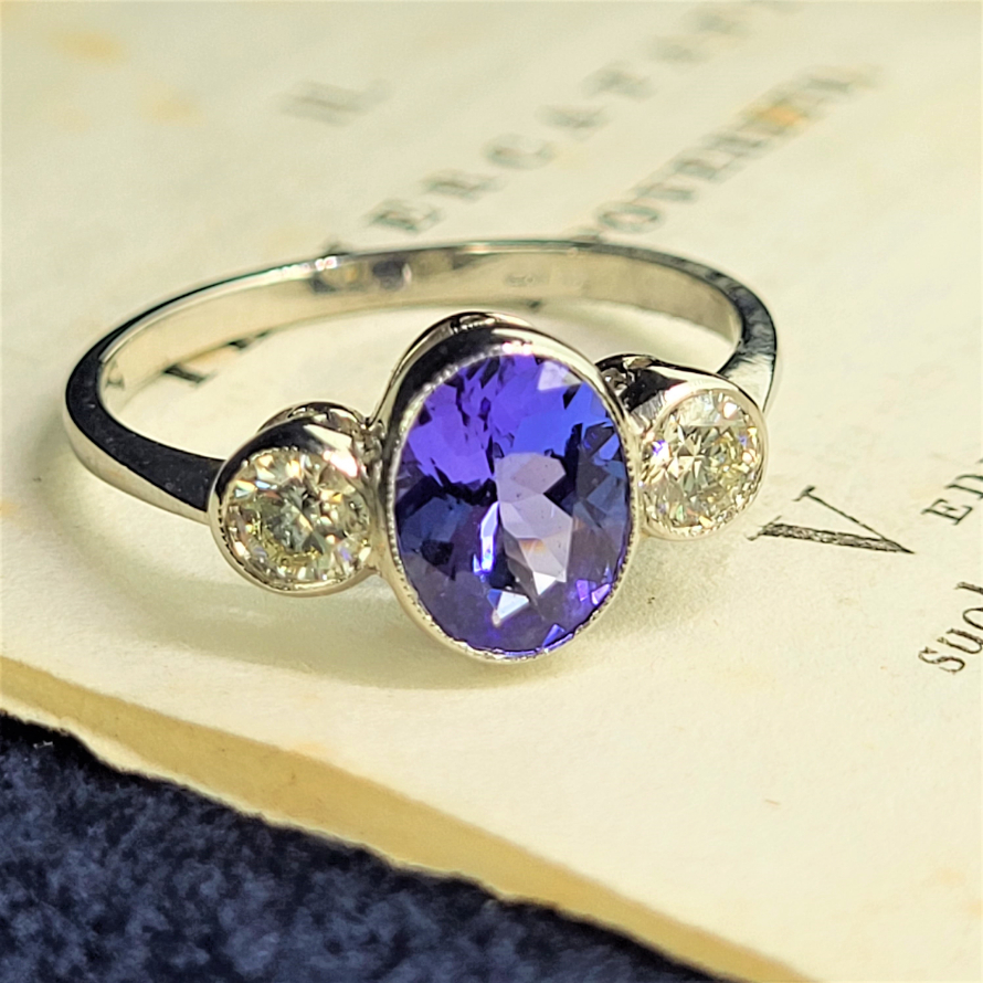Perfect enchantment this pretty trilogy ring really captures the heart. The central Tanzanite is the main draw weighing 1.80ct with a fabulous azure. On its shoulders sit two brilliantly sparkly 0.20ct diamonds all rub-over set in 18ct white gold. The total diamond weight is 0.40ct and the ring is currently size N and can be sized.