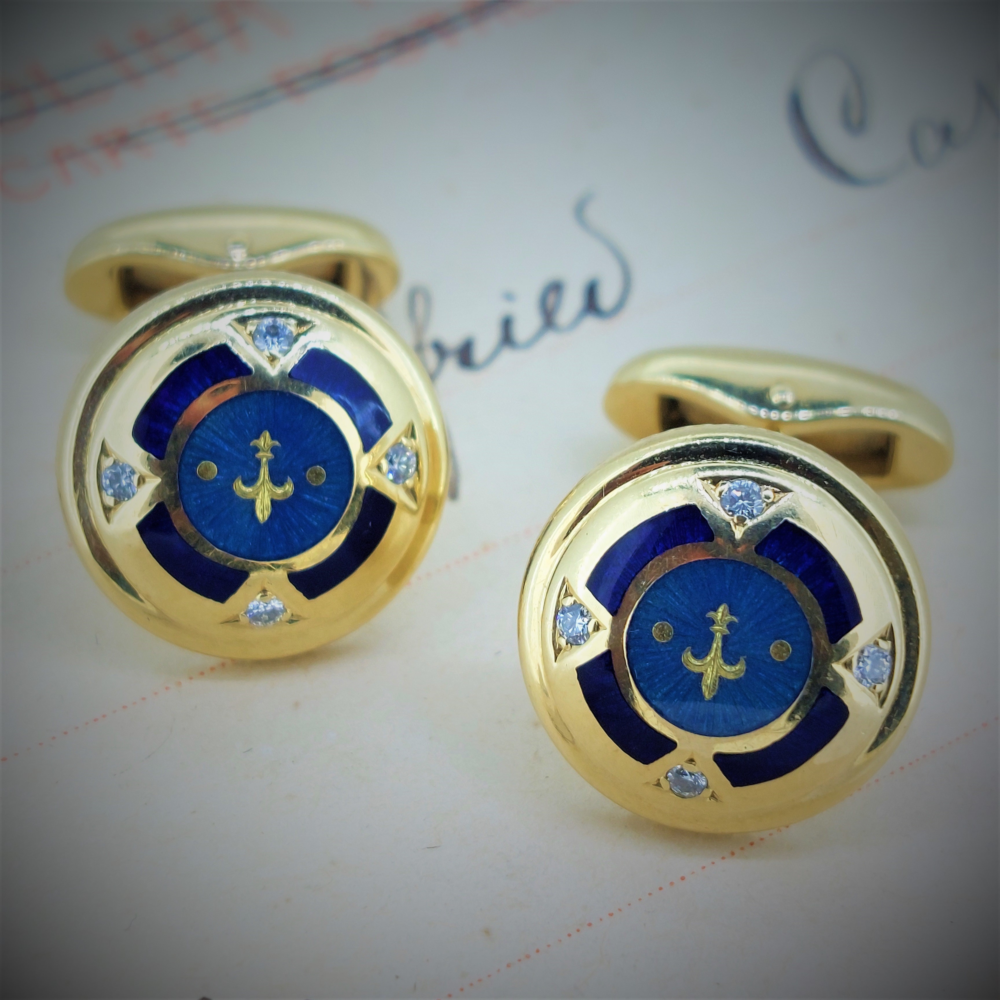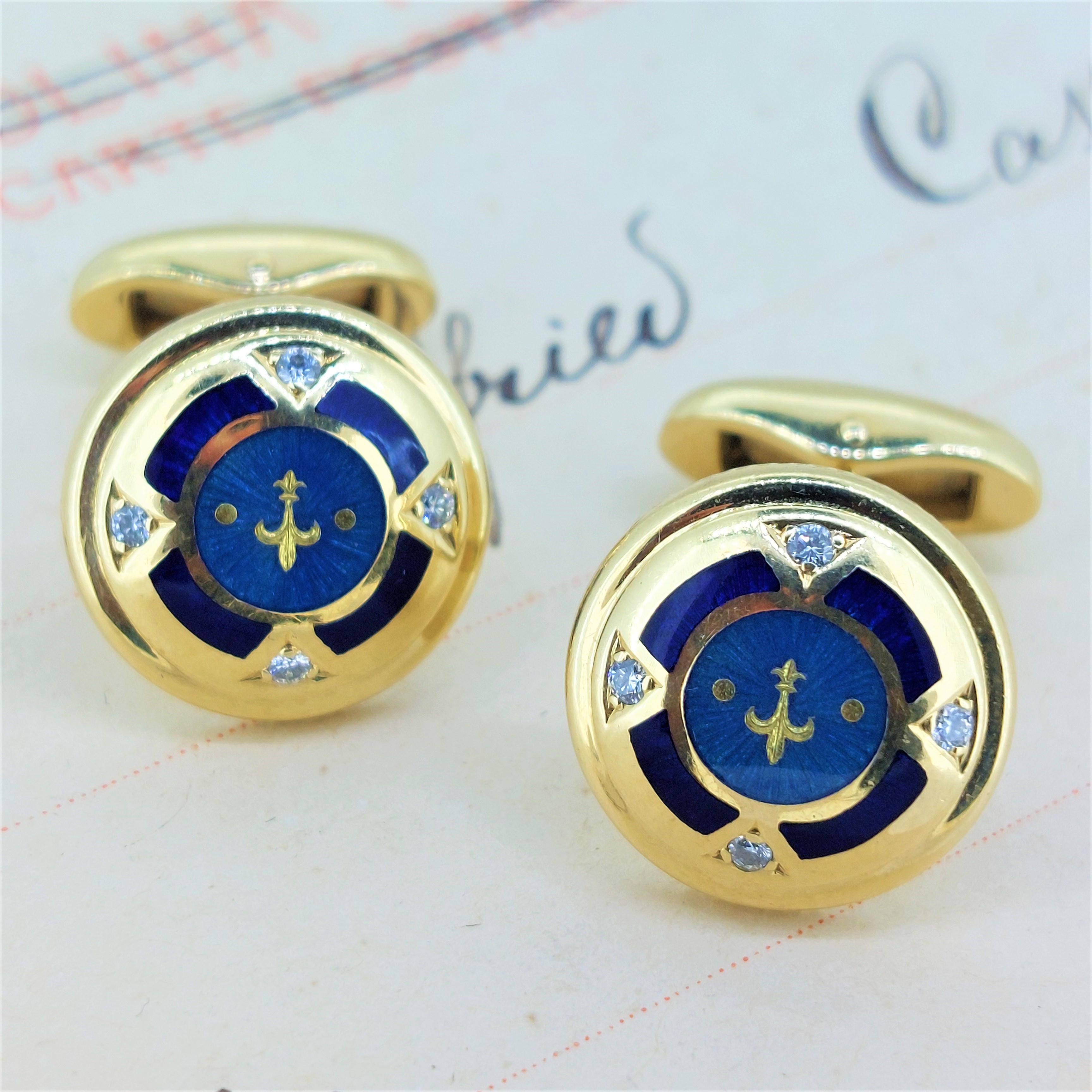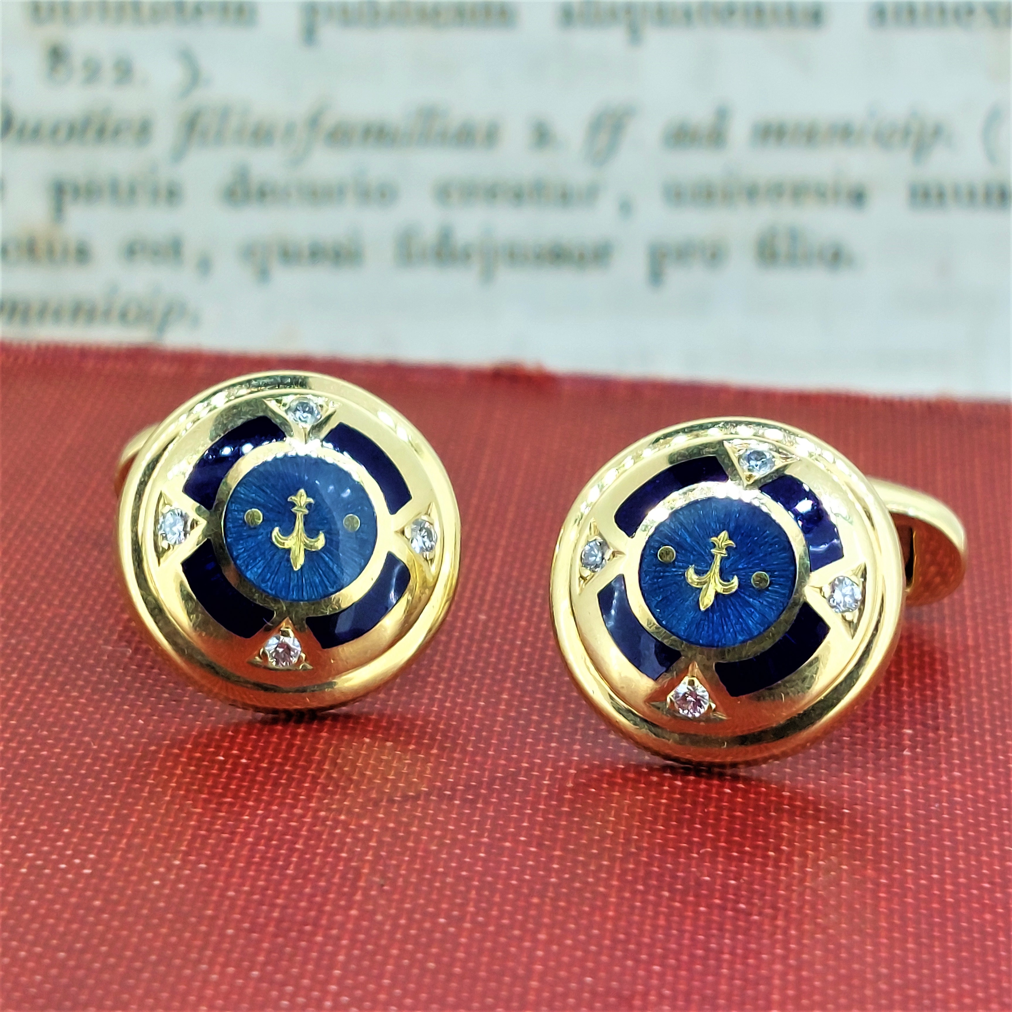 These divine Cufflinks centre a fleur-de-lis and blue guilloche enamel decoration bordered, accented by four full cut diamonds.