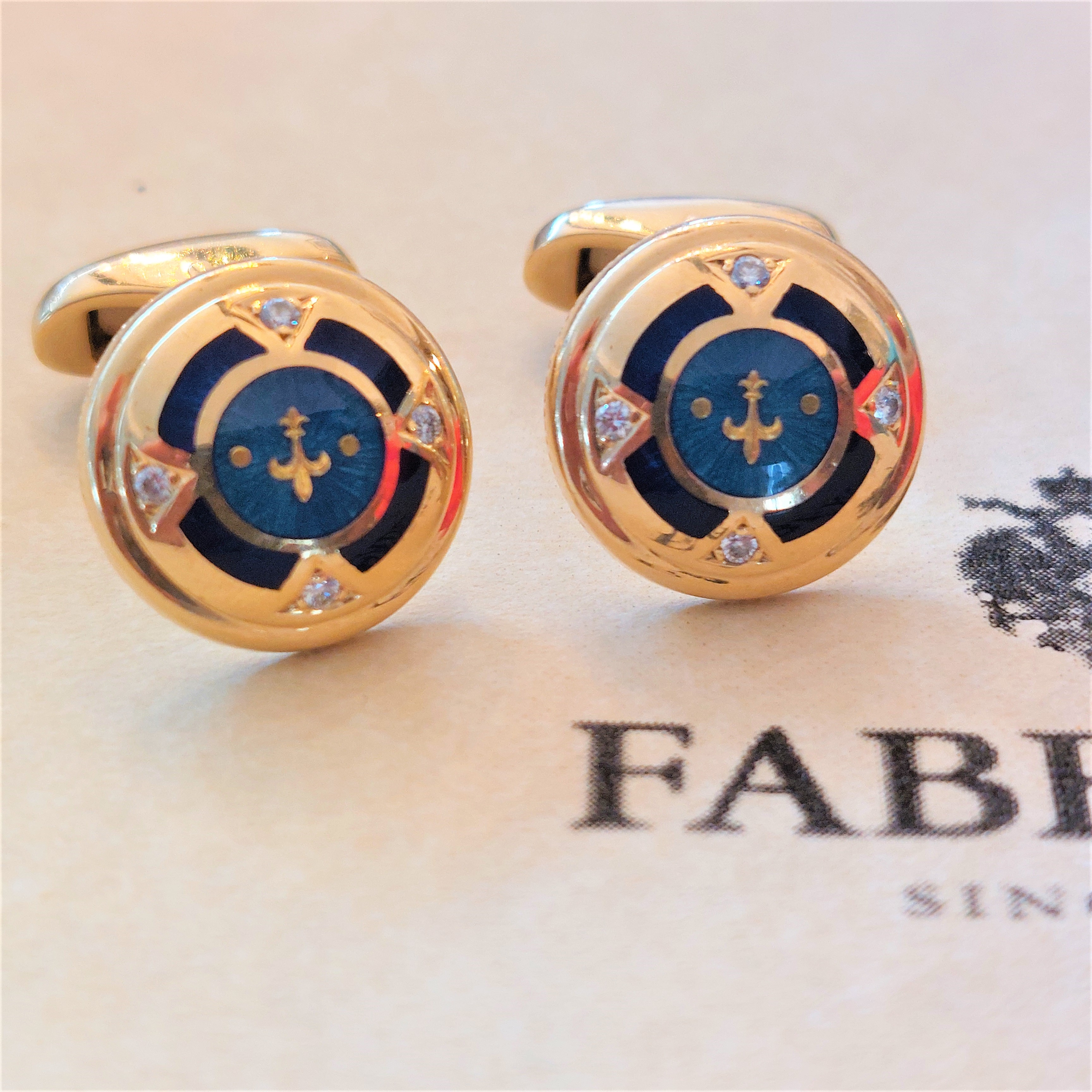 From The House of Faberge! These Cufflinks are perfection. 18ct gold, Diamond and enamel in immaculate condition with the Victor Mayel mark.