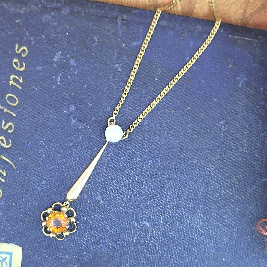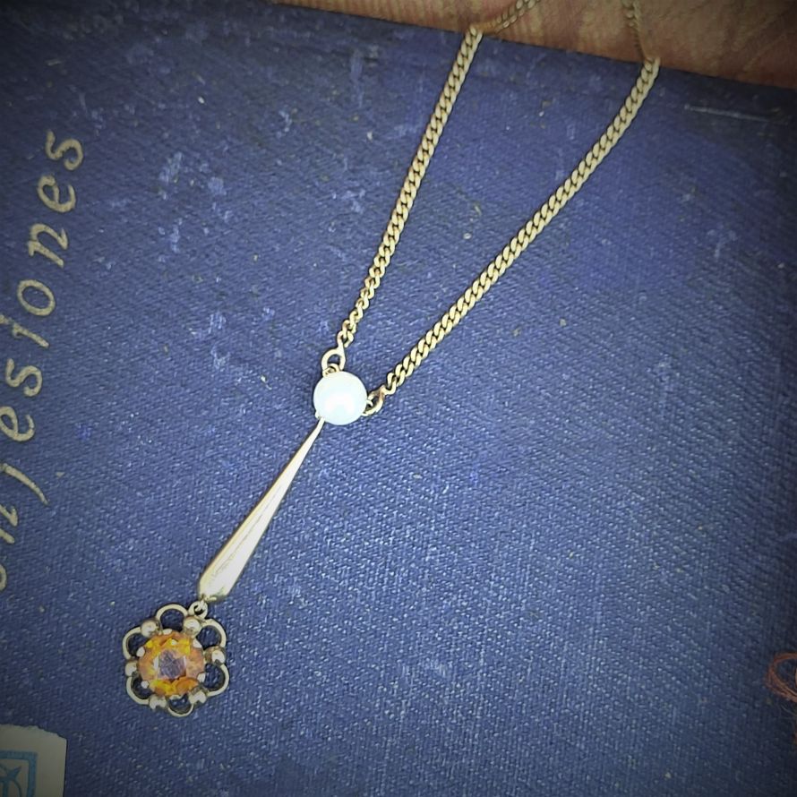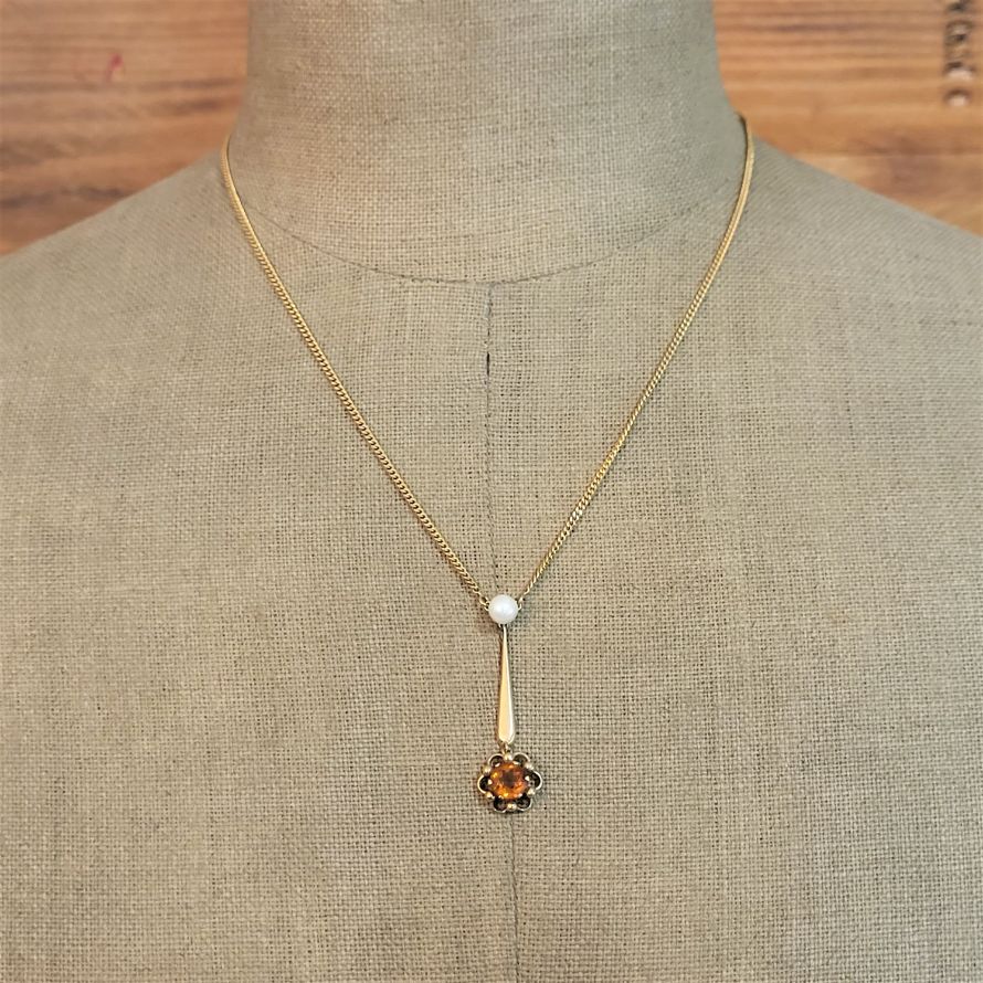 So simple and oh so lovely. A traditional 9ct 18 inch curb chain boasts a delightful pearl and tourmaline drop pendant separated by a solid bar. The pendant falls 1.5 inches and the necklace weighs 6 grams.