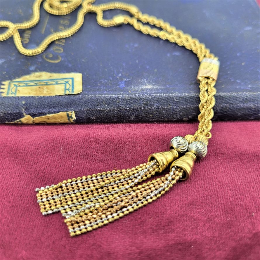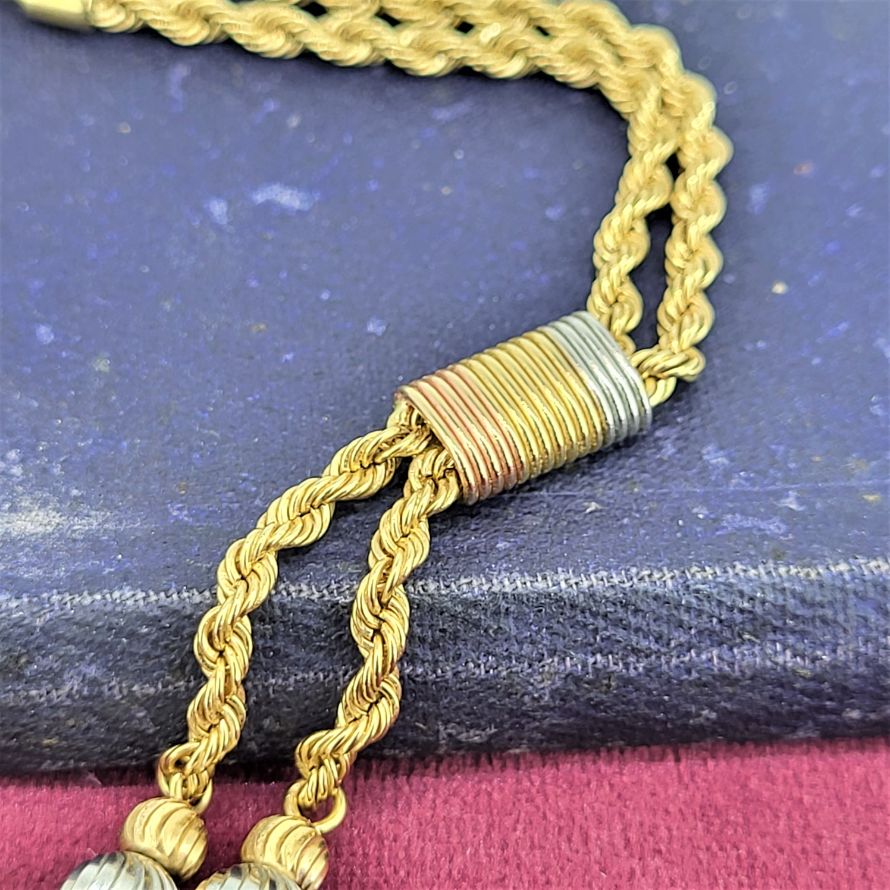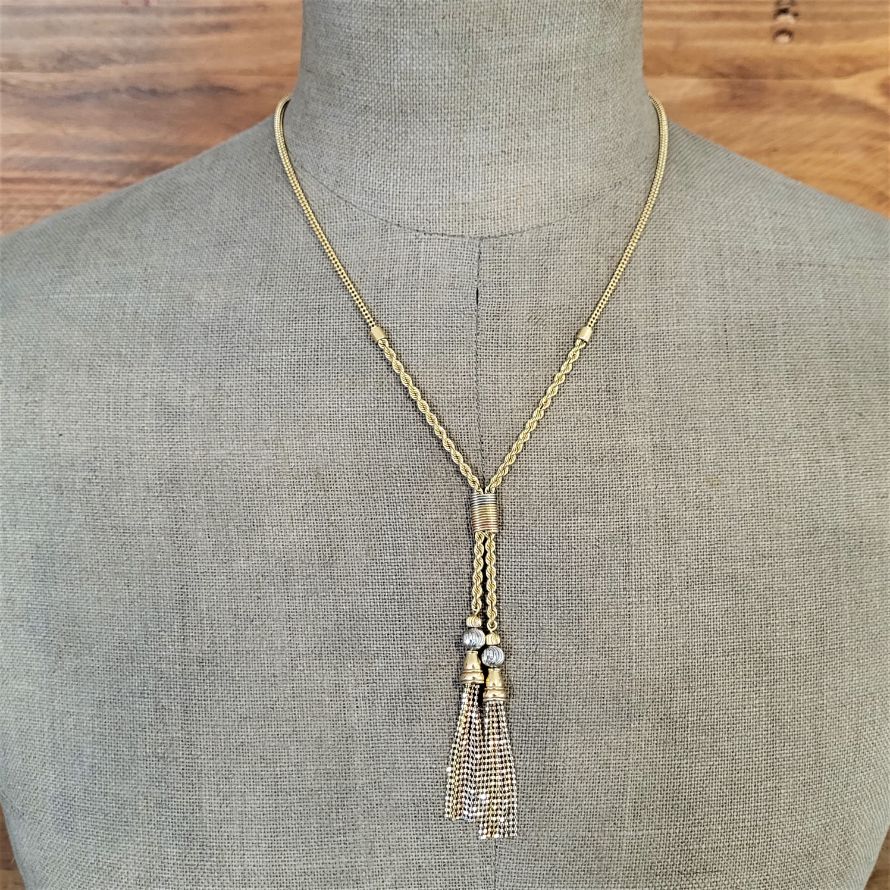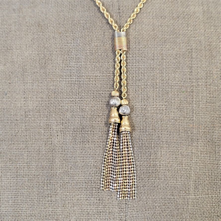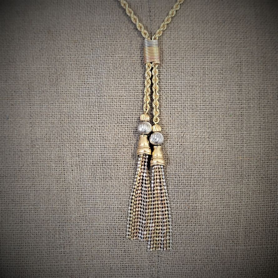 The chain is the traditional 18 inch length and the tassels hang 3.5 inches. There are traces of Yellow, White and Rose Gold in this Necklace adding to its versatility.