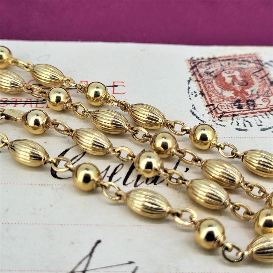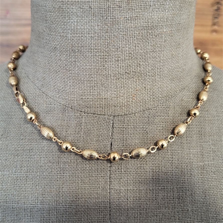 The necklaces features ball links and a unique cylindrical design. It is hallmarked 9ct and weighs 13.5 grams.
