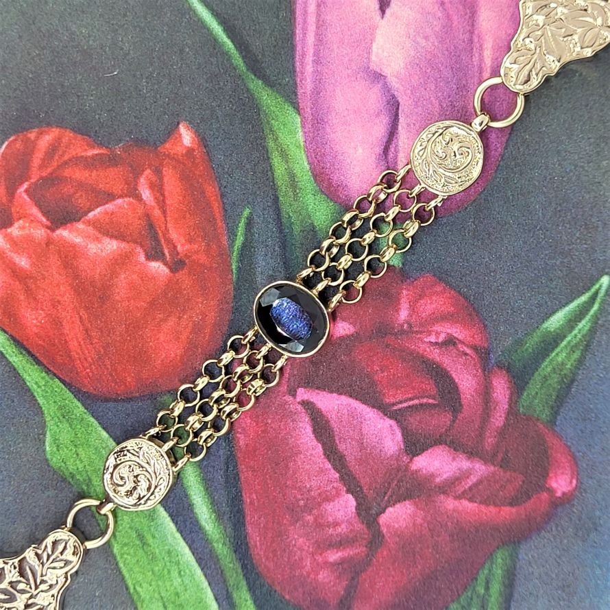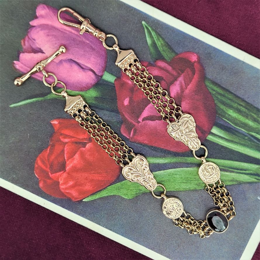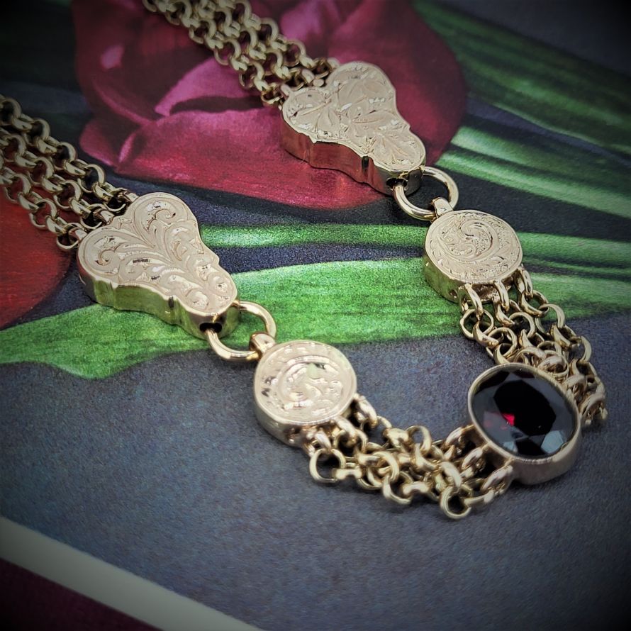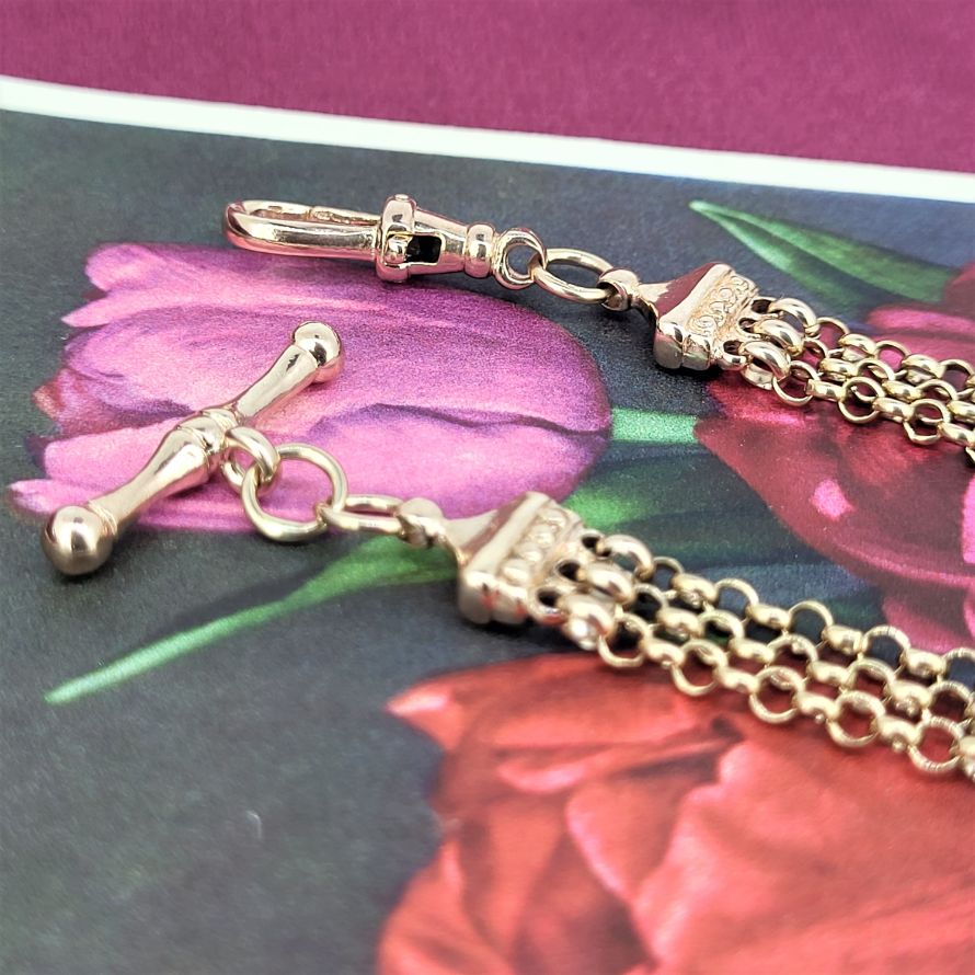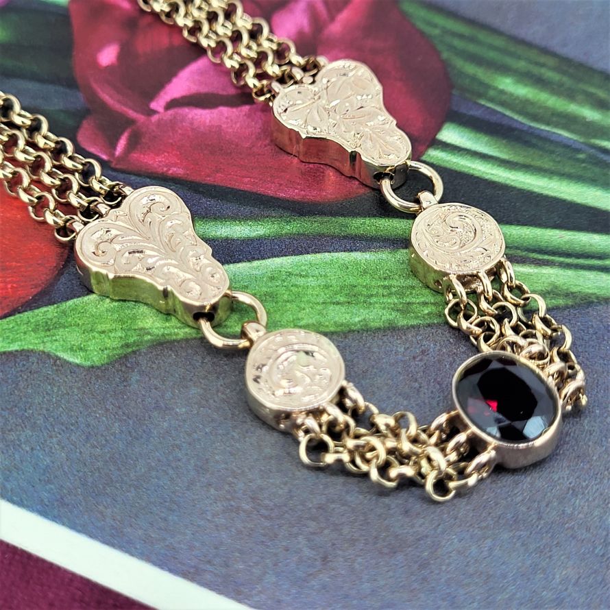 A gorgeous antique bracelet crafted in rose gold with paste. The bracelets style is distinctive and beautifully engraved hollow plates are connected with intricate belcher links. The bracelet also boasts a rose gold t-bar and is secured with a swivel catch. Measuring 20.5cm in length and weighing 22.4 grams its a really lovely piece.