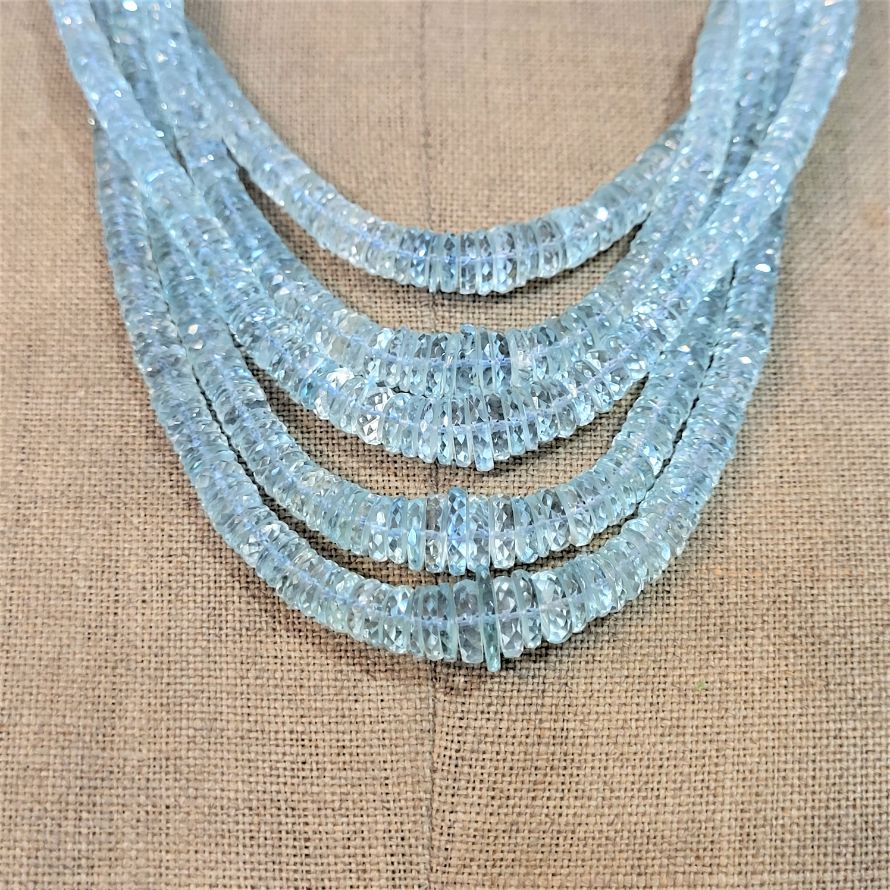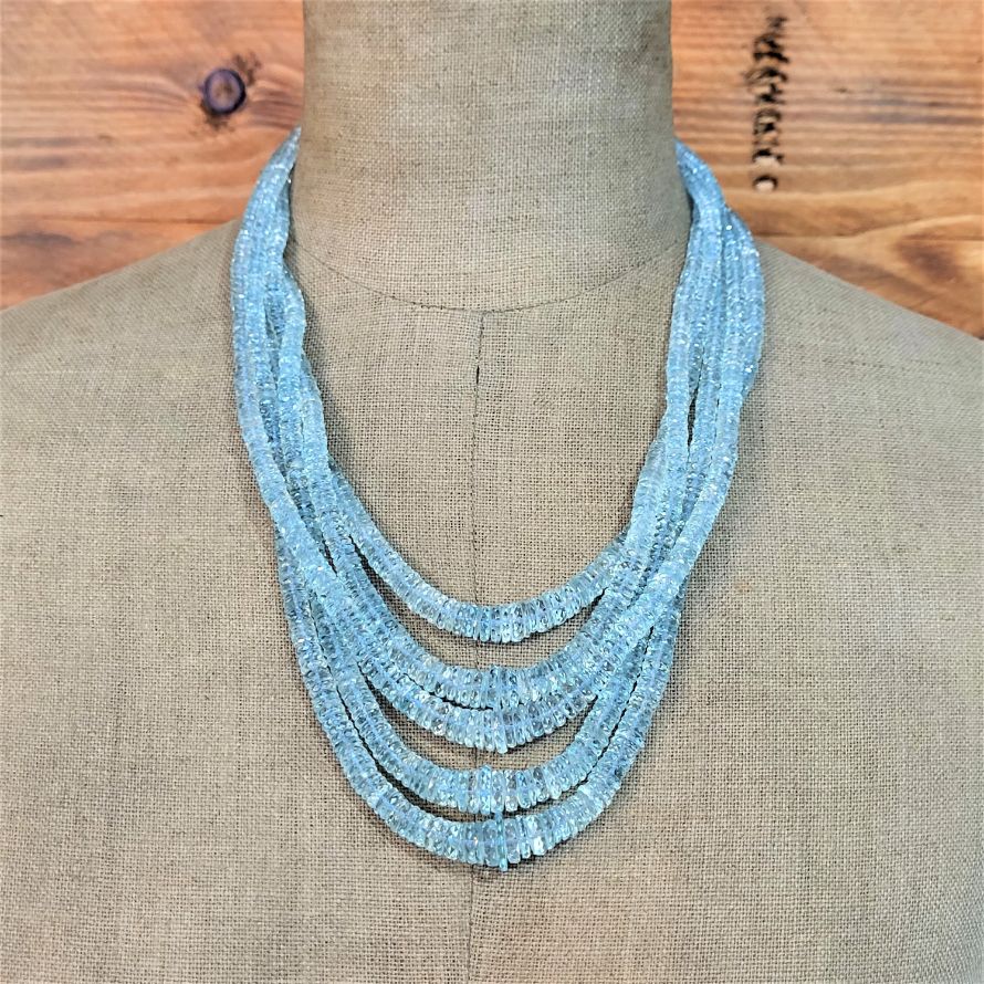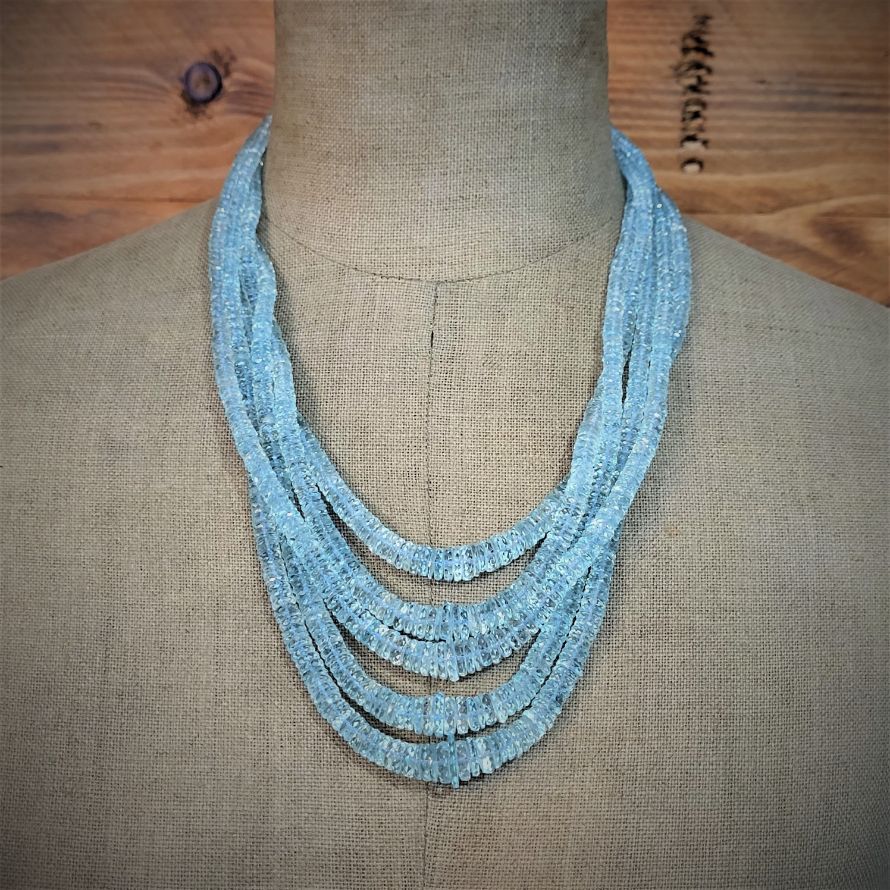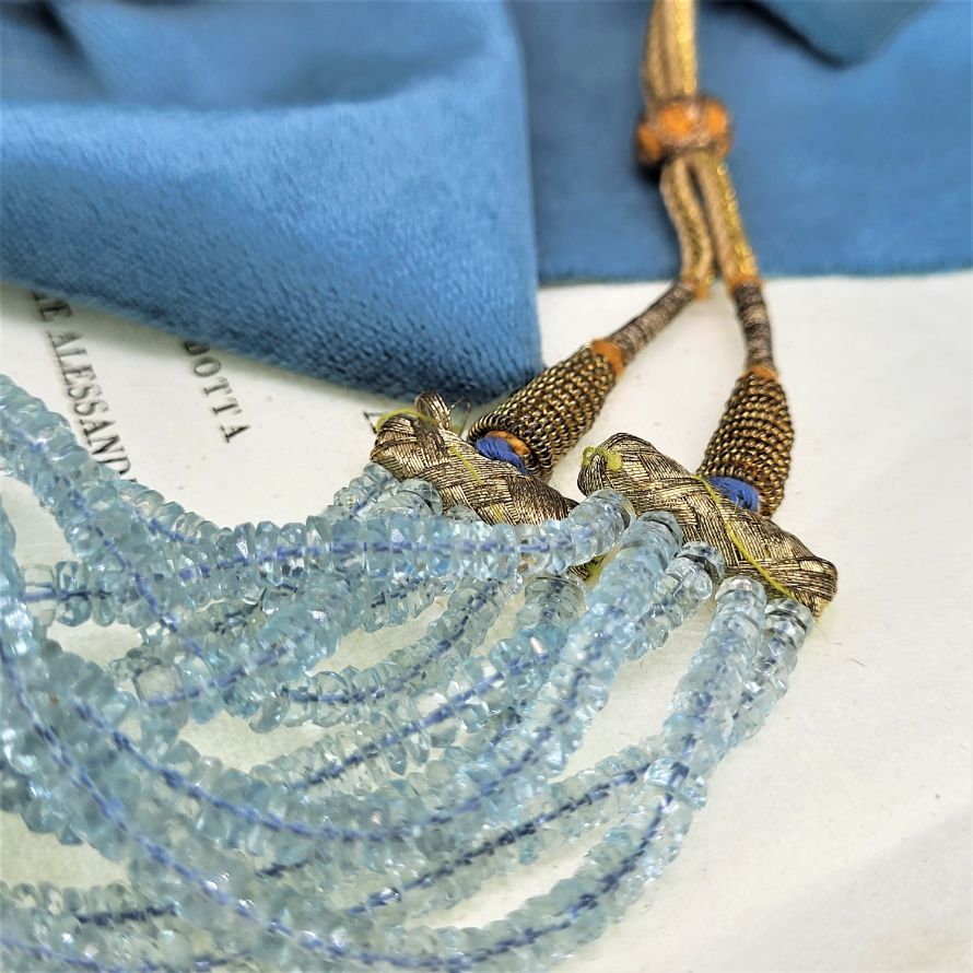 Oh how we love this! Comprising five strands of graduated aquamarine beads bound together by gold thread and an adjustable knot. We estimate over 600 carats of aquamarine in total!! Packing a punch with a weight of 136 grams you'll not be fooled if someone tries to swipe this one from your neck!