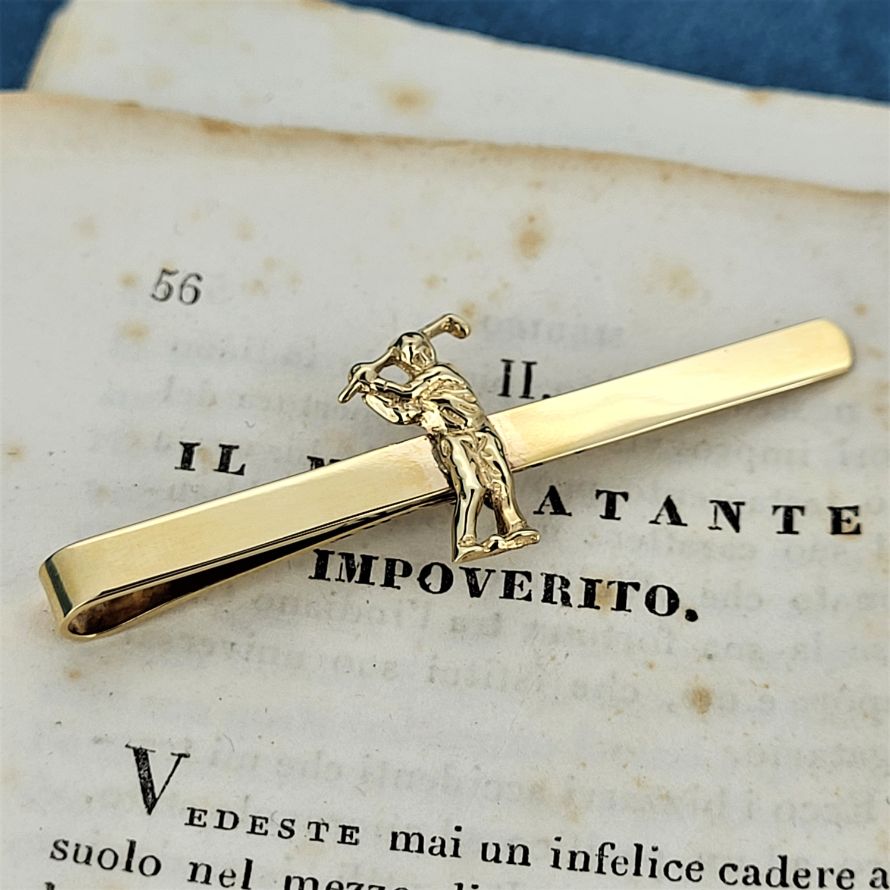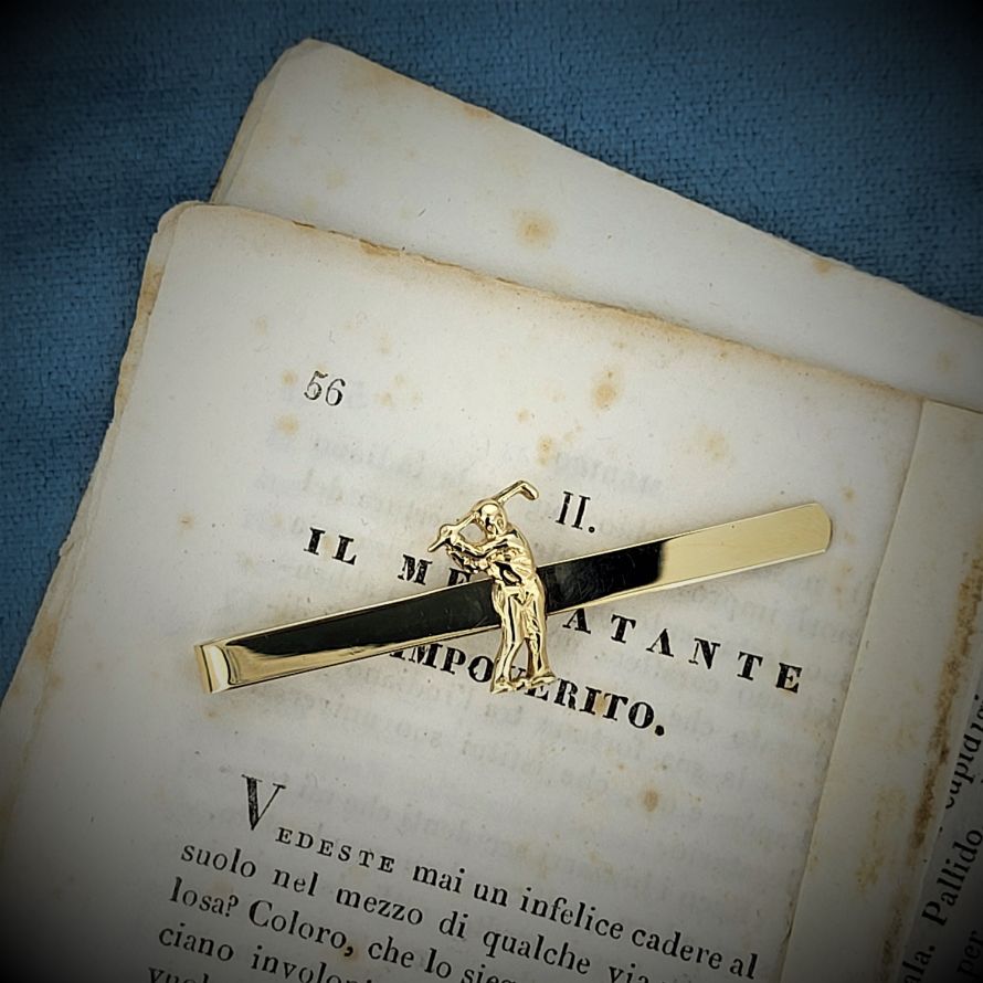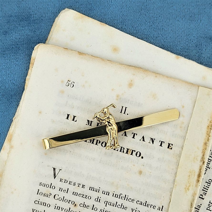 Need to buy a gift for a golf lover? Look no further. A 4mm tie clip with a golfer in the center made from 9ct gold is the perfect accessory for the Captain's luncheon! Fully hallmarked, weighing 2.6 grams and stretching to 52mm.