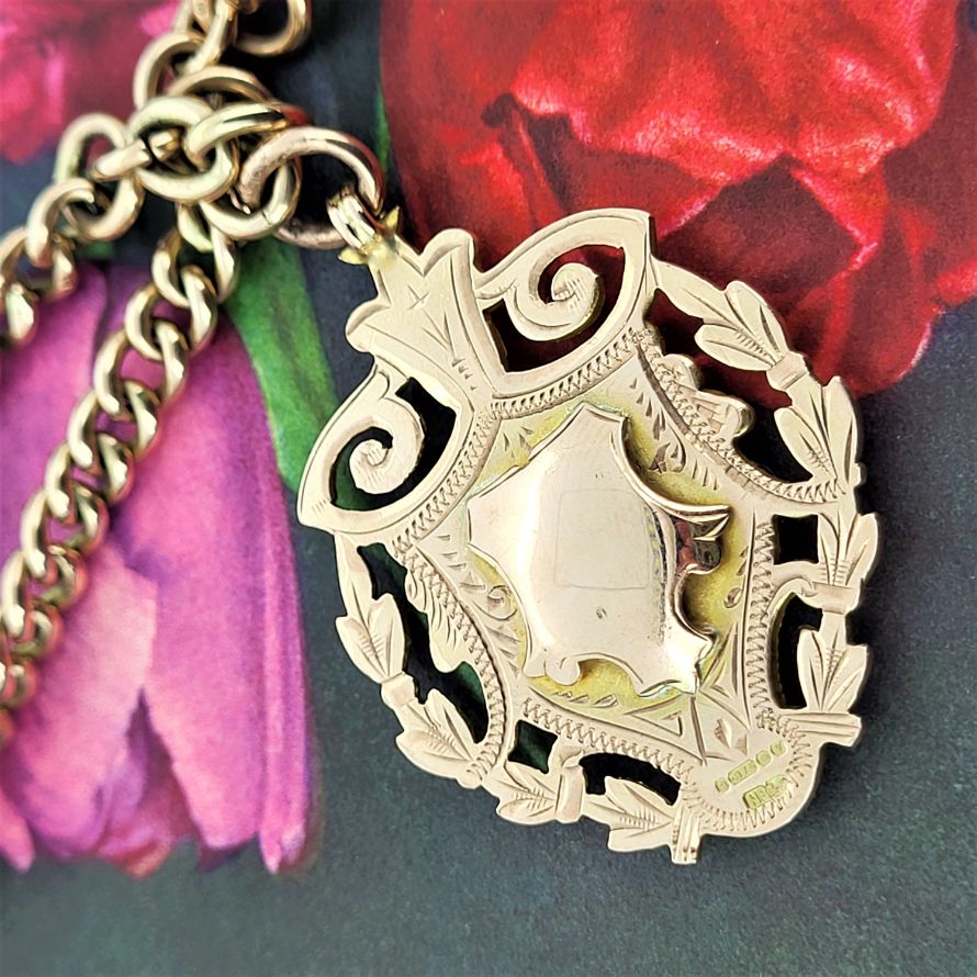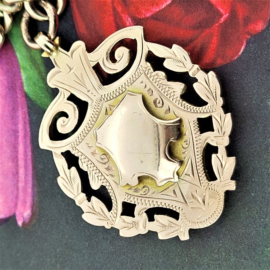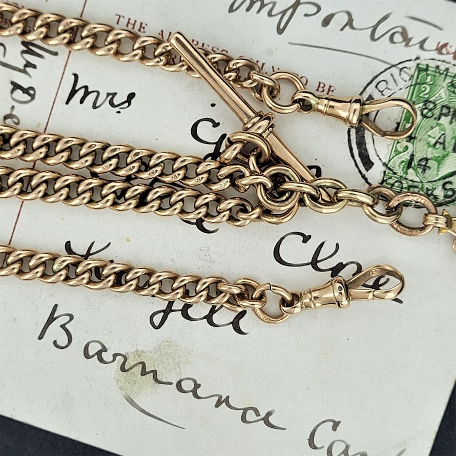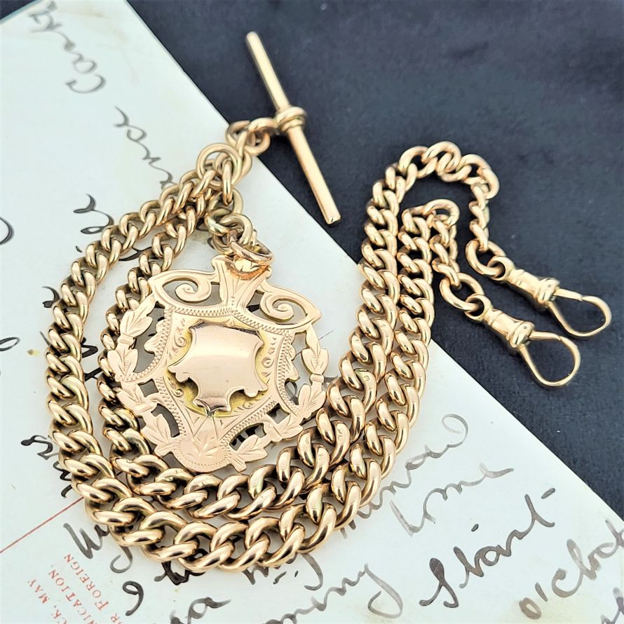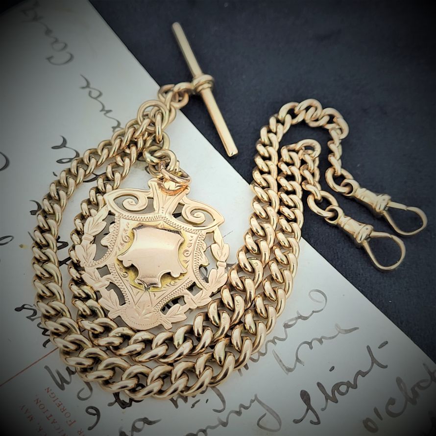A beautiful graduated rose gold double albert chain with swivel clasps, t-bar and shield fob. This would originally have been worn across the waistcoat with the 't' bar through the button hole and the two graduated chains spread across the pockets to each side, the medal suspended beneath. Quite the statement!