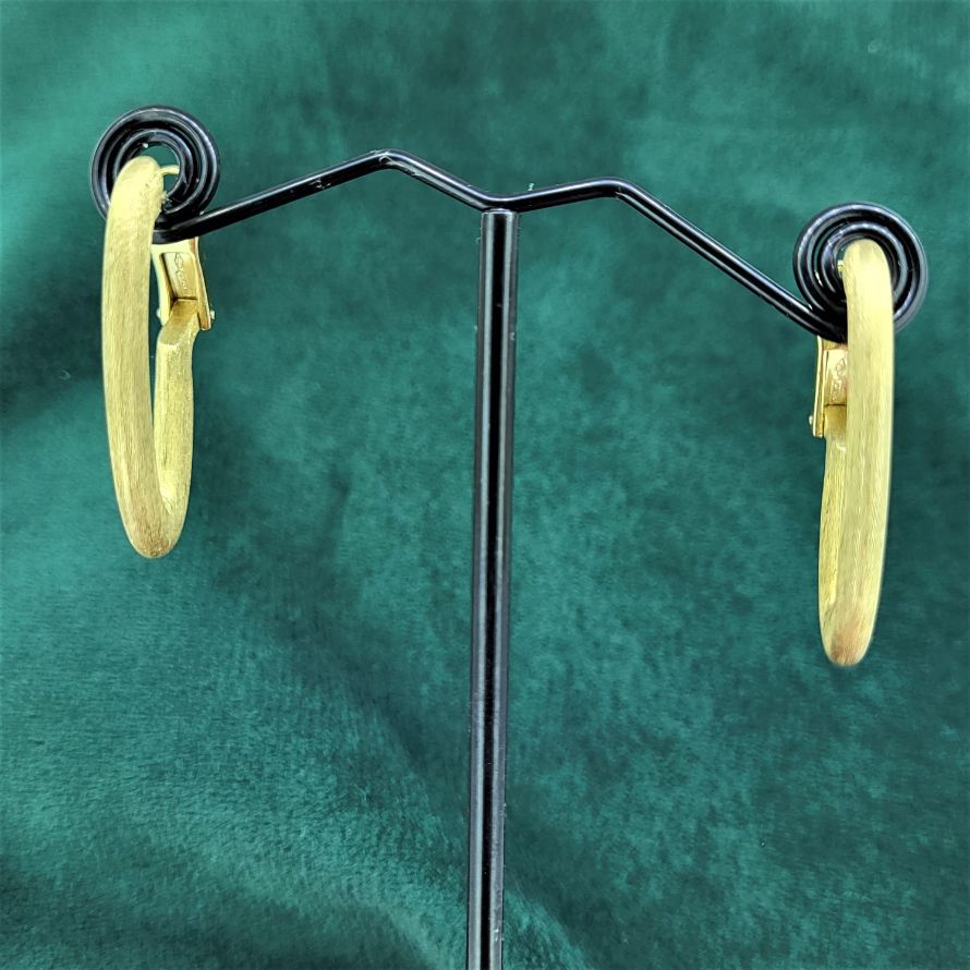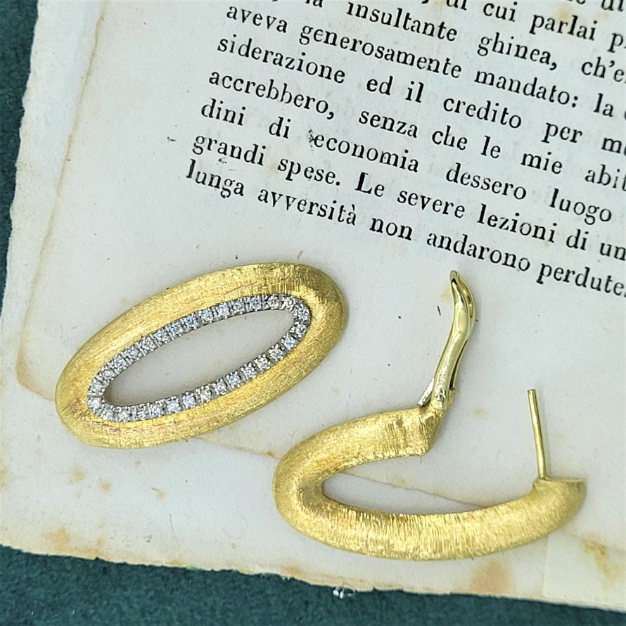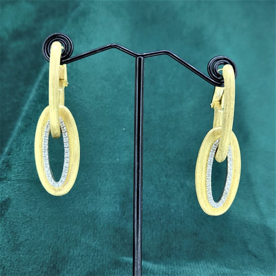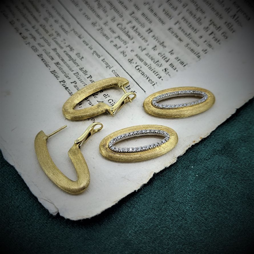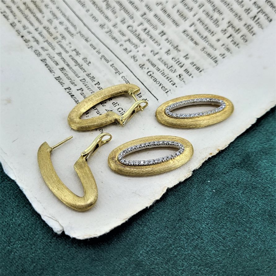 Drop earrings in a brushed and slightly frosted finish here you have two sets of earrings in one. For everyday wear you have a traditional oval loop, 3mm in diameter and 3cm long. And then for the bling factor you can attach a further loop, with the exact same dimensions but bordered with a row of individually set diamonds. The diamonds are set in white gold claws so the contrast is fab. Where do you think they were made? Italy, of course!