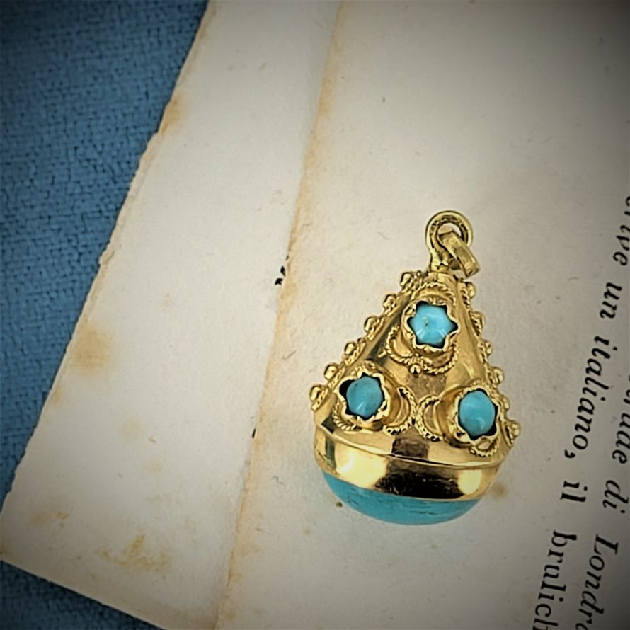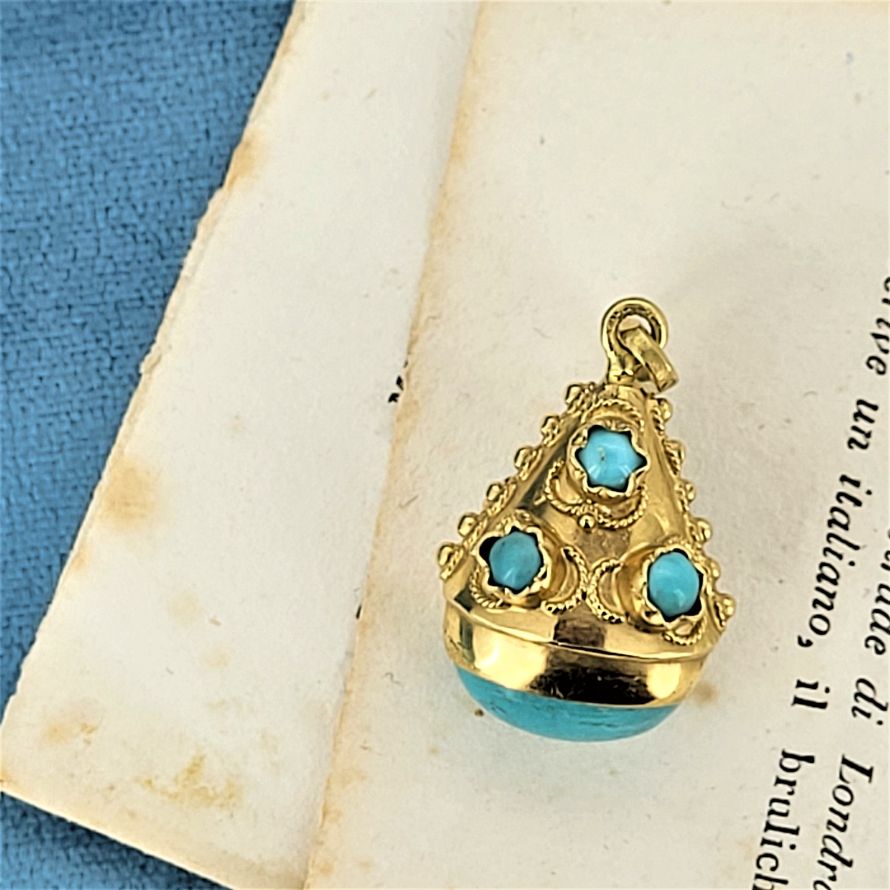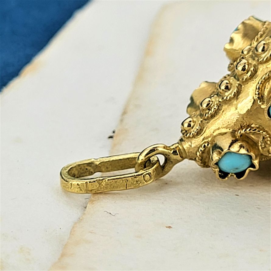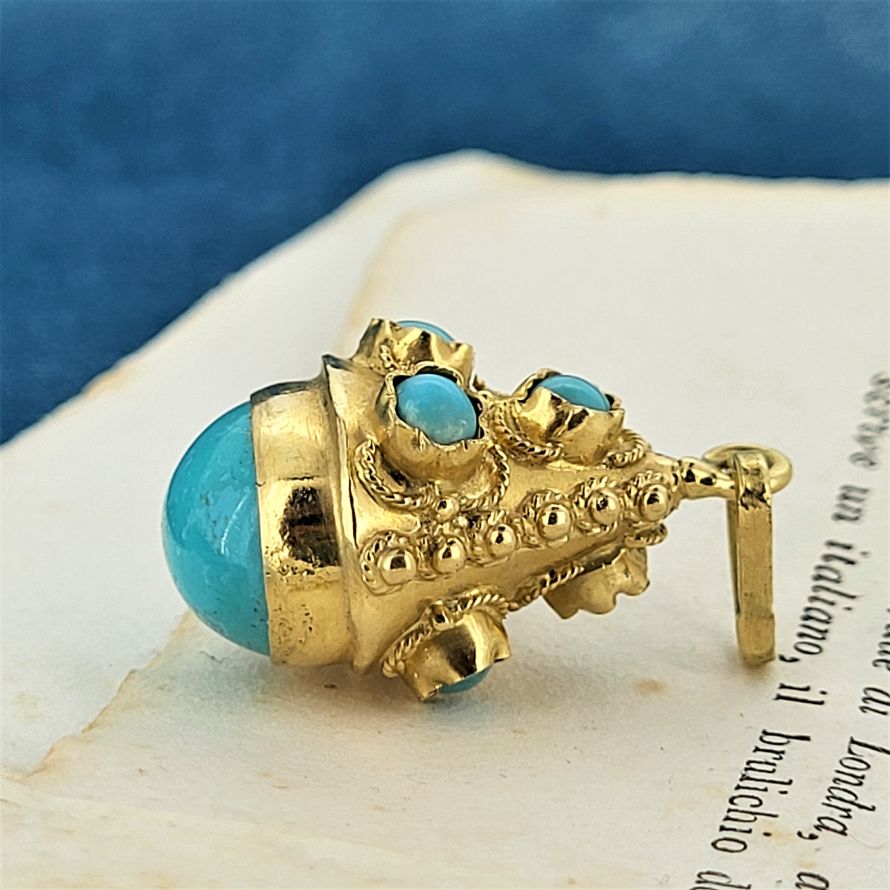 Made in Italy and inspired by the Etruscan jewellery popular during the Roman empire this revival charm pendant has been beautifully preserved. Crafted from 18ct gold this charm pendant hosts turquoise beautifully scattered with a larger cabochon turquoise at its center. The gold surfaces are enhanced with wire and beading. These types of ornamental gold surfaces are typical of the Etruscan era. Measuring 25mm (not including the bail) this is a beautiful charm that can be worn on a necklace or a bracelet. Weighs 6 grams and stamped in 18ct.