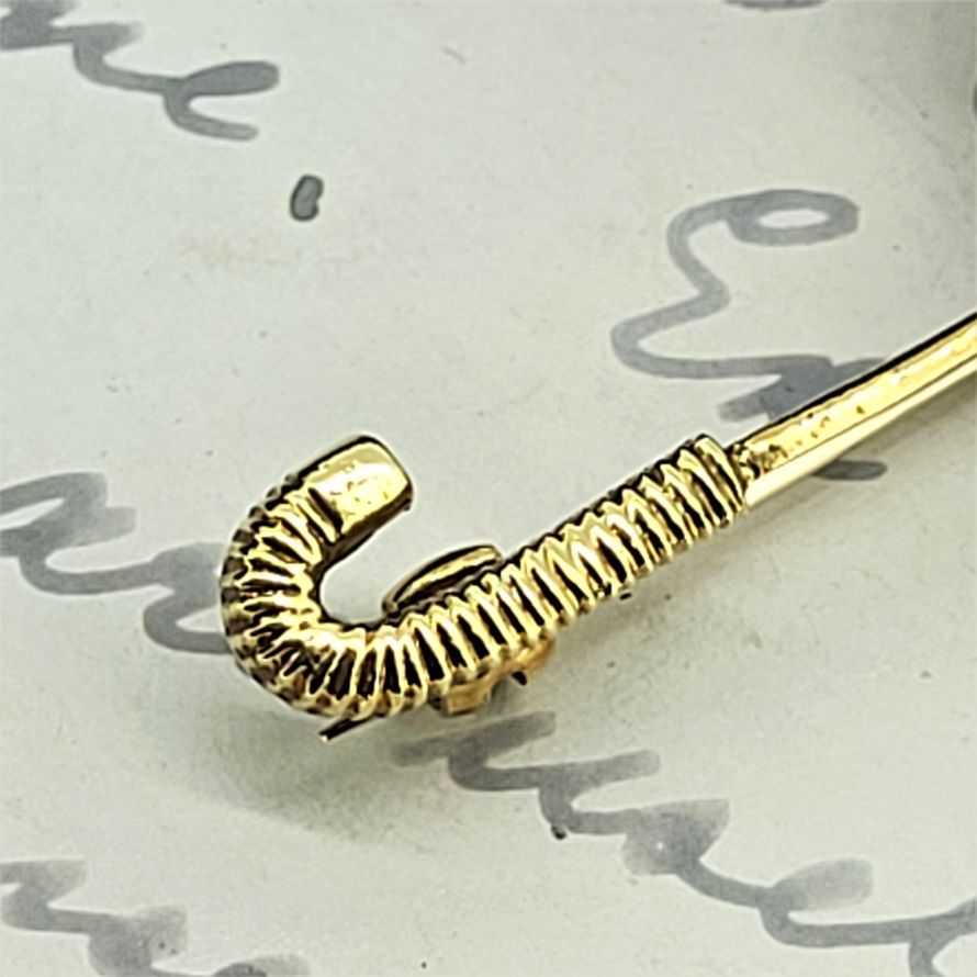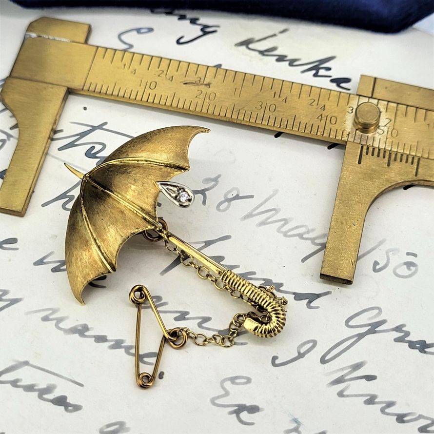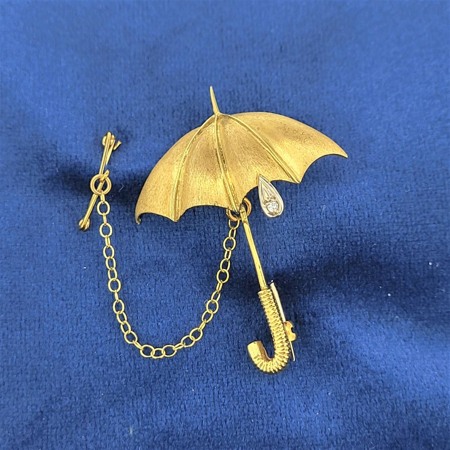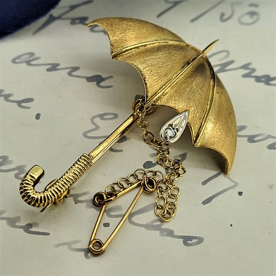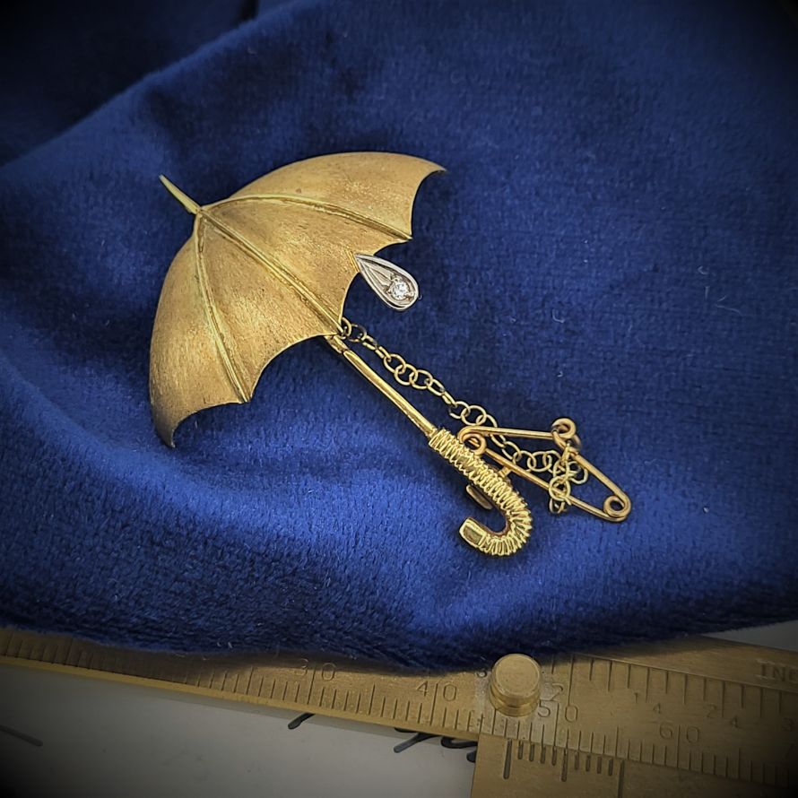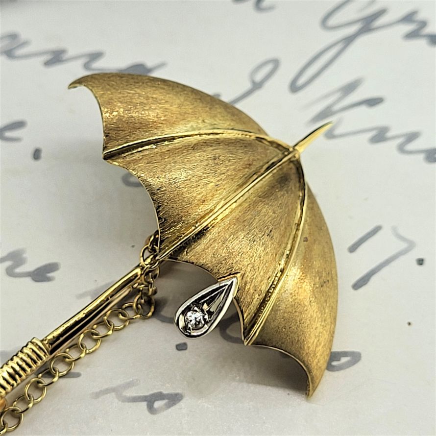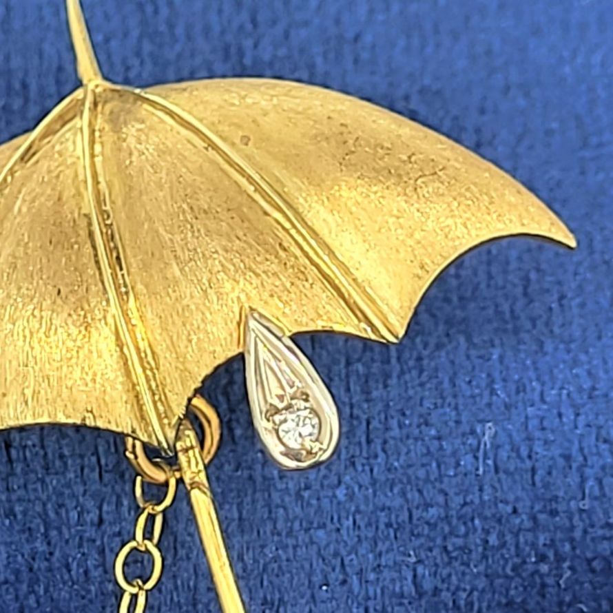 Originally produced by Mappin & Webb this umbrella brooch is exquisite. Beautifully crafted in 18ct yellow gold with a diamond rain drop suspended from the canopy set in white gold. The canopy is a brushed matt effect, the shaft is polished and the handle has ridges. All come together to form a beautiful accessory that is absolutely sure to dress up any lapel regardless of the weather. Weighing 6.8 grams and measuring 45mm by 35mm we are in love!