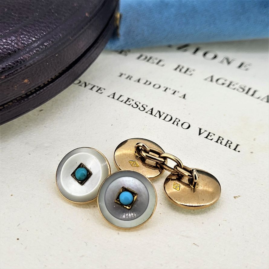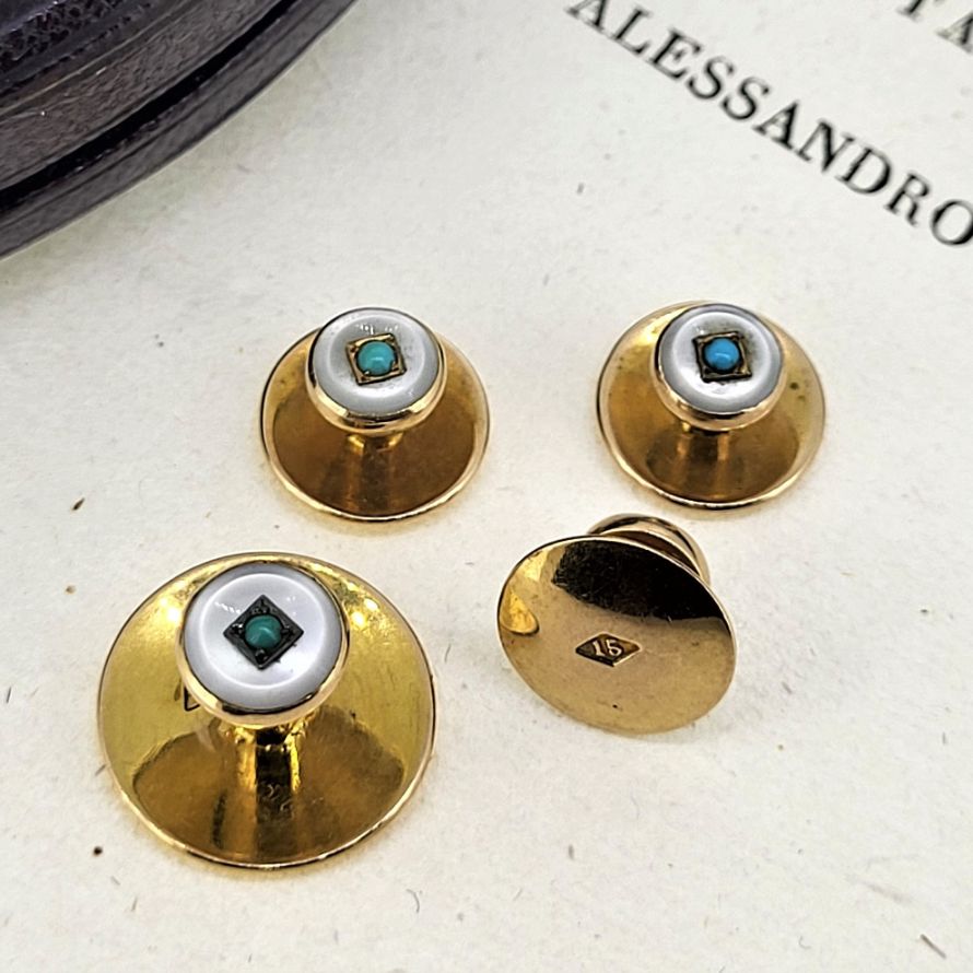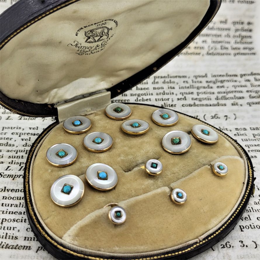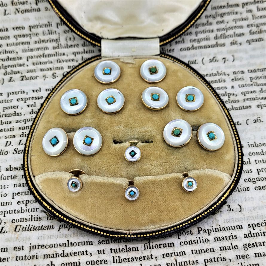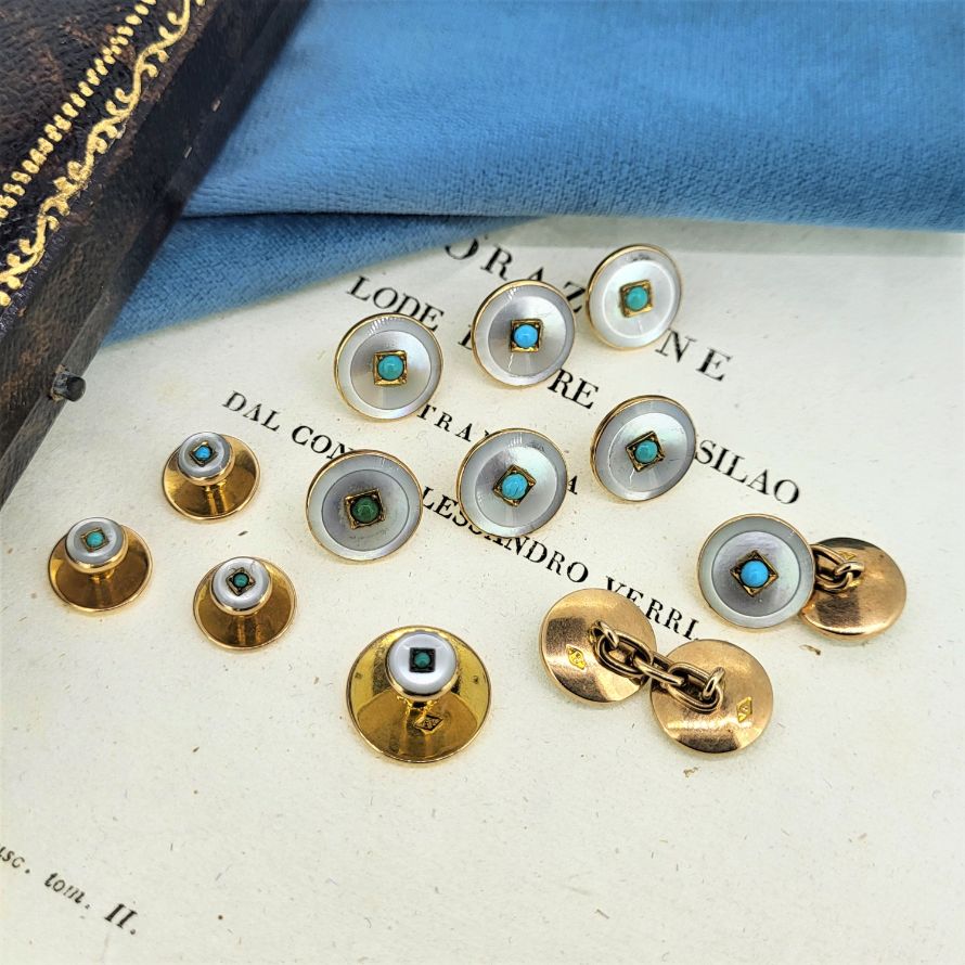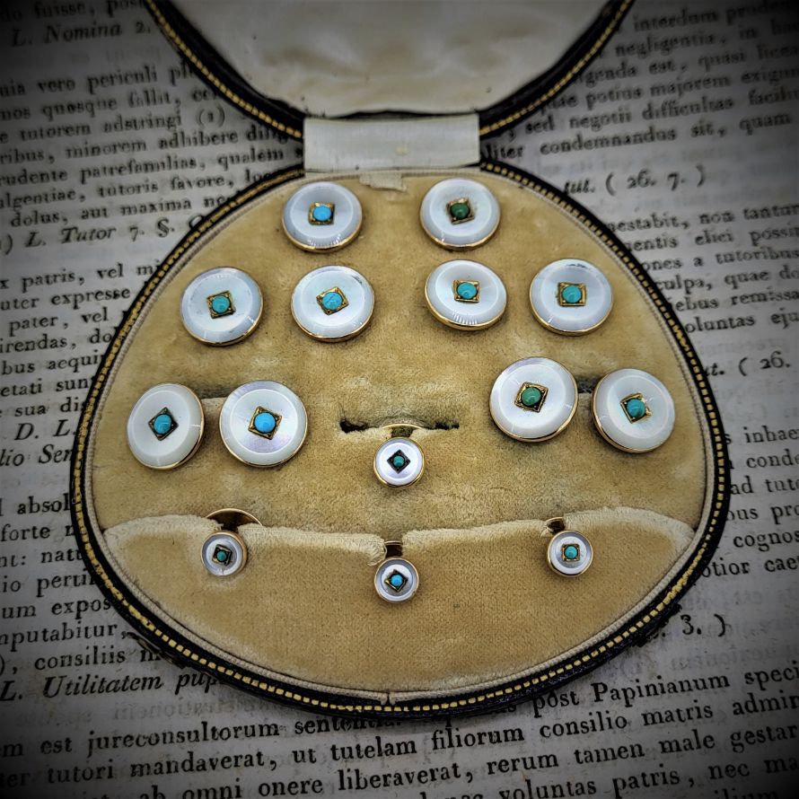This set is exquisite. Featuring cufflinks, six button studs, three collar studs and a tie pin. It is near impossible to find a 12 piece set now, they're usually only manufactured on a commission basis.