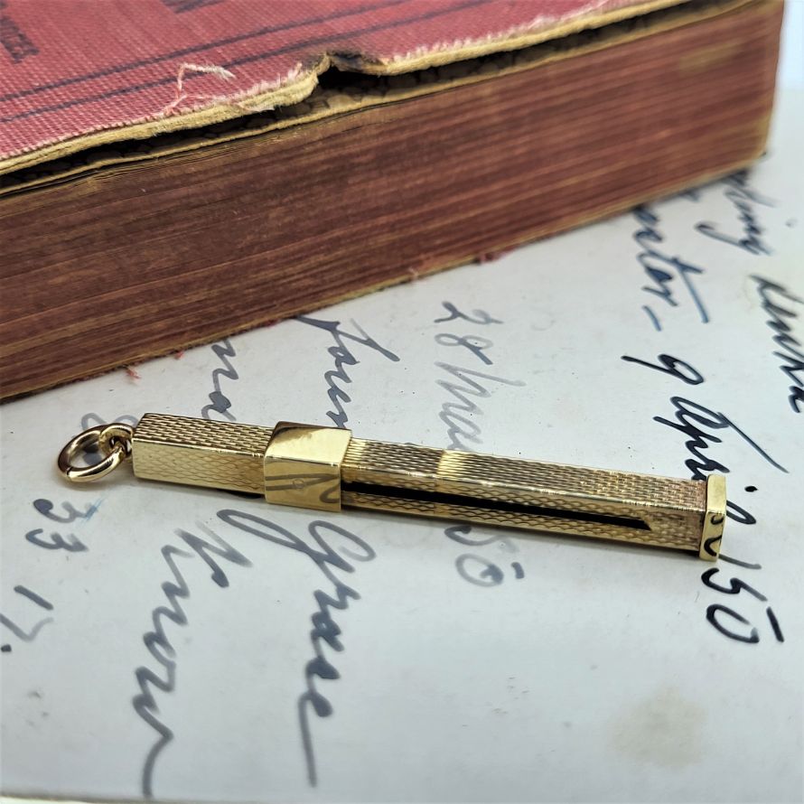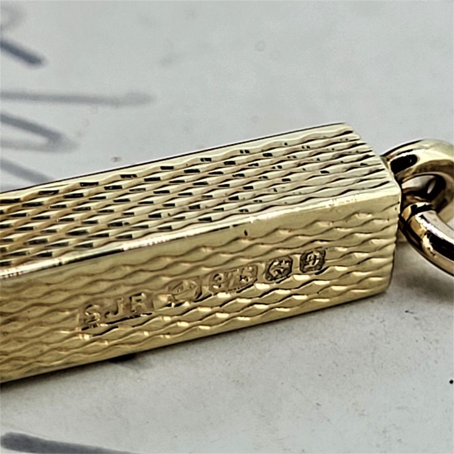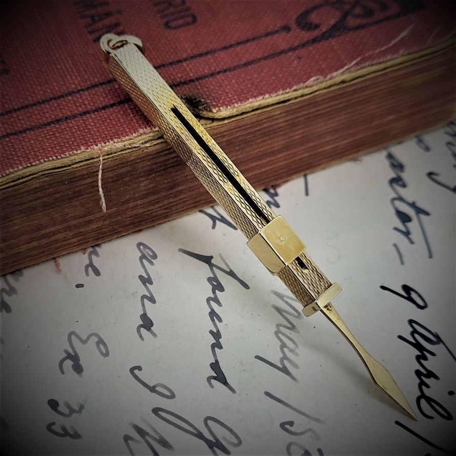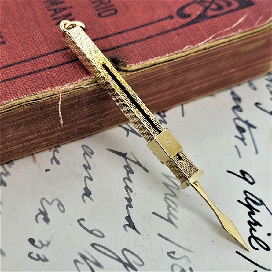 Made in 1978 by SJ Rose & Son and hallmarked in Birmingham this is a beautifully kept vintage 9ct gold toothpick. It has a width of 4mm and extends from 45mm to 62mm. Complete with bail so can be worn on a necklace and fully utilised. It has to better than reaching for those wooden toothpicks that break and inevitably make matters of the teeth worse! Weighing 3.7 grams.