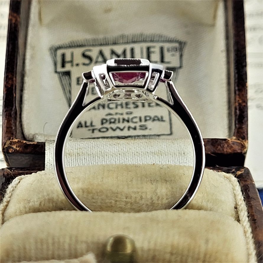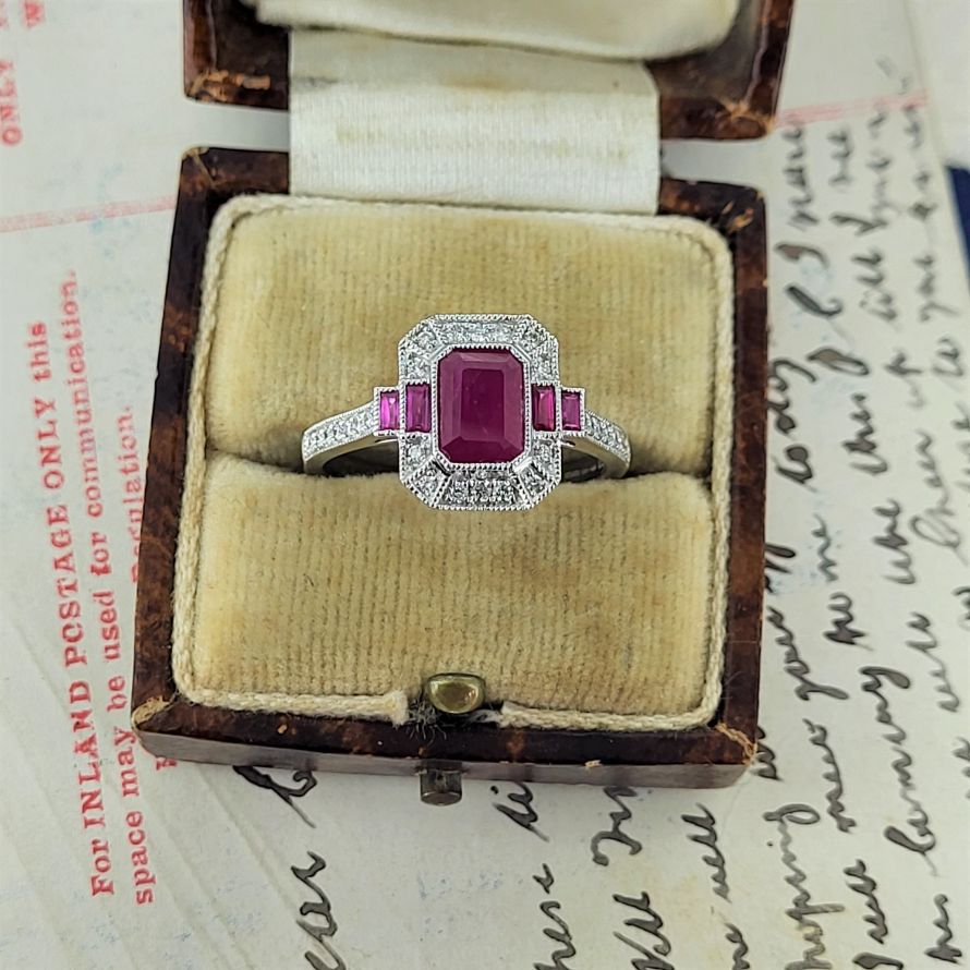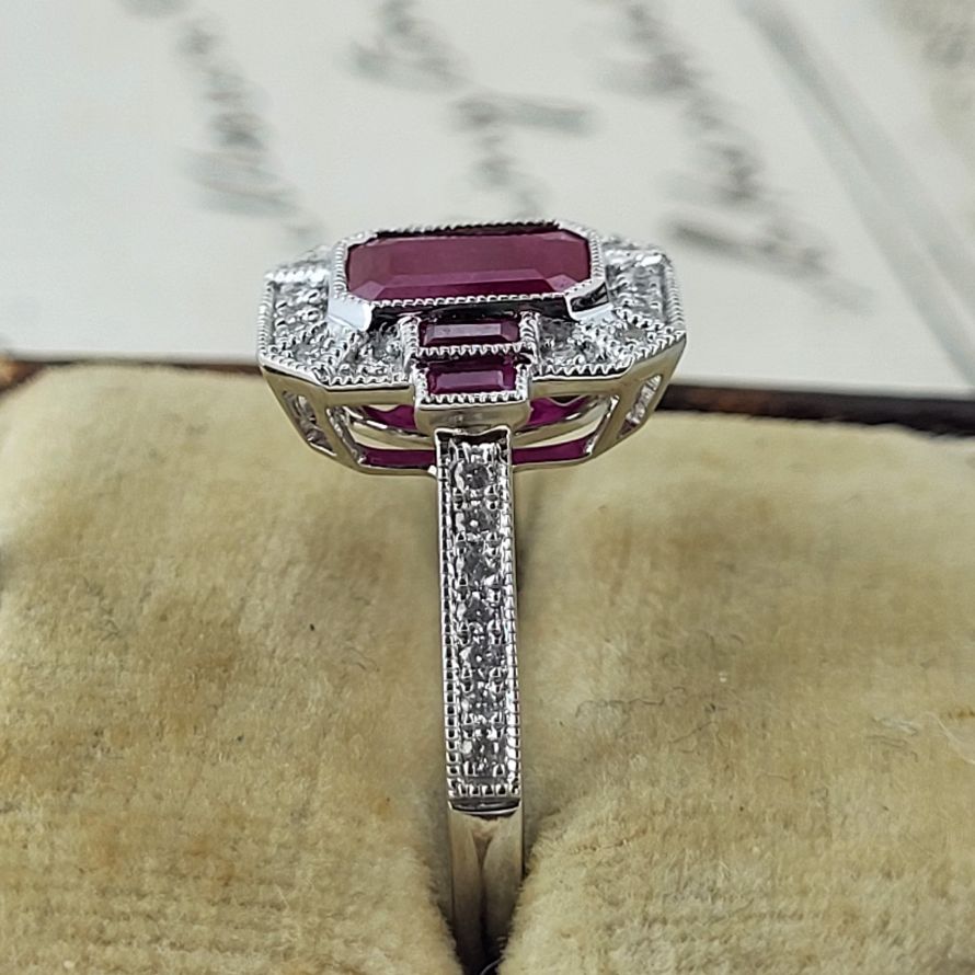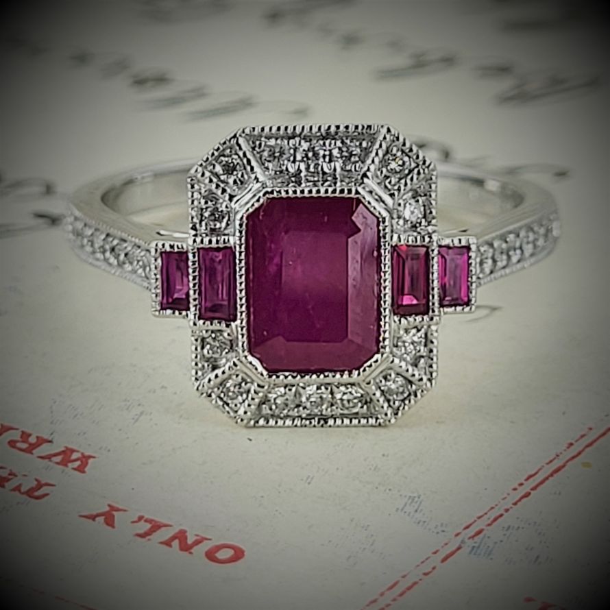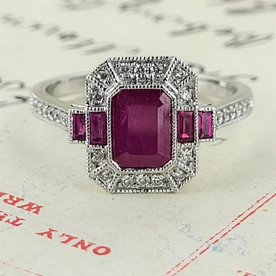 Emerald cut rubies and round brilliant cut diamonds dazzle, all set in 18ct white gold with a beautiful diamond set shank. The central ruby is 5mm by 8mm and there is in excess of 1.40ct of rubies in total. The round brilliant cut diamonds total 0.20ct.
