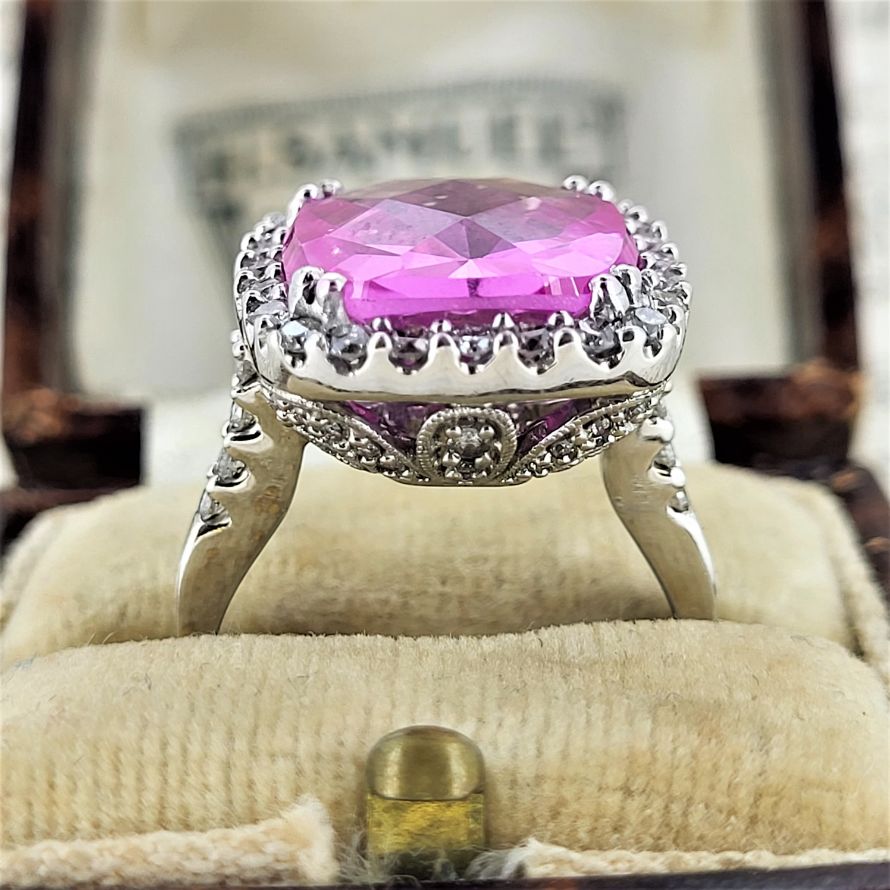 The pink sapphire is double claw set and surrounded by 24 round brilliant cut diamonds. The head is so fabulously detailed with fancy scroll work under the grain set bezel and an additional 46 further diamonds.