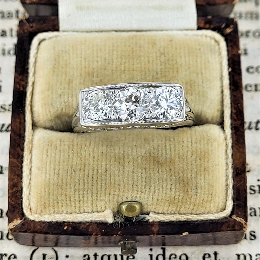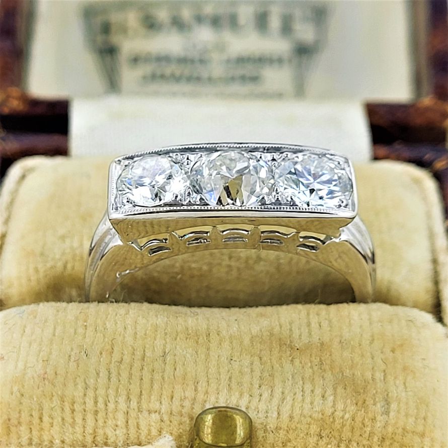 This ring was most probably commissioned by an individual who had inherited some wonderfully sparkly Old European Cut diamonds. The brief to the goldsmith would have been a simple one: a chunky, three stone ring that will protect the diamonds but showcase their brilliance. And the goldsmith delivered.