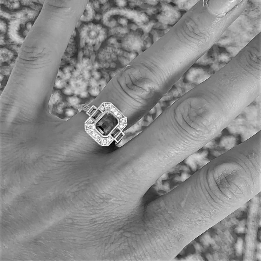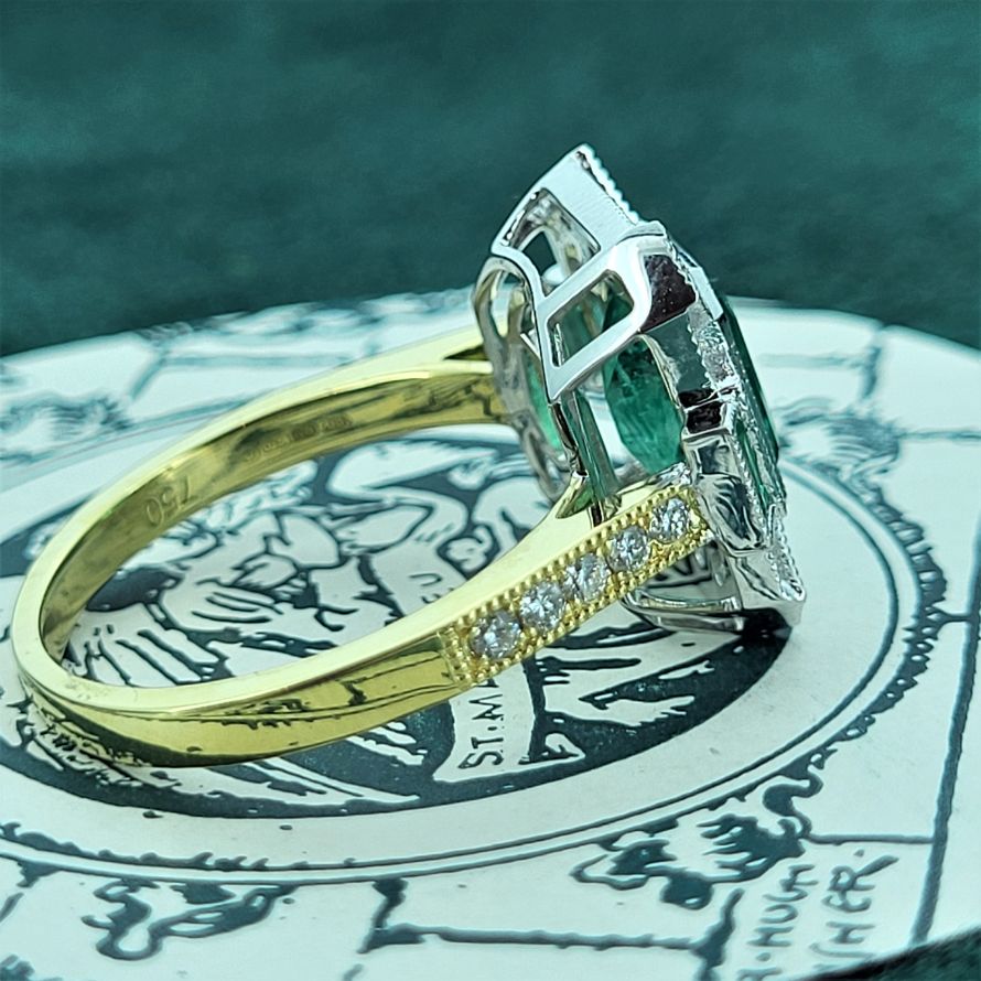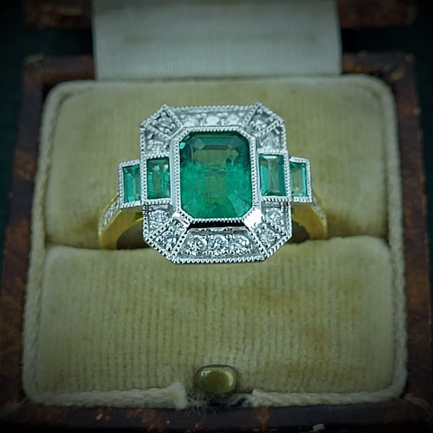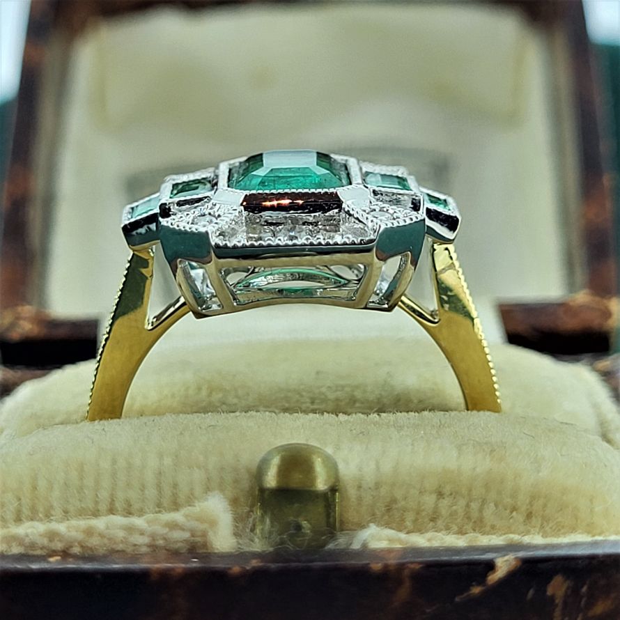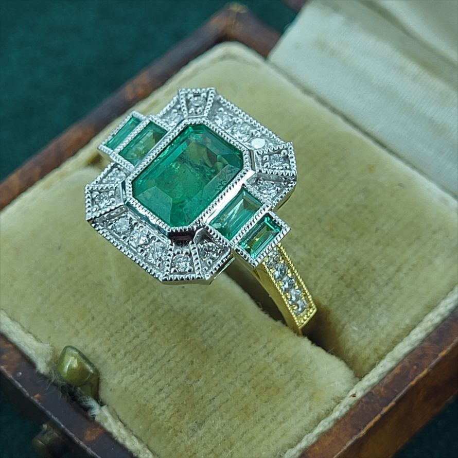 A fabulous art deco inspired emerald and diamond ring set in 18ct gold. With an excess of 2 carats of emeralds, all emerald cut with the typical art deco step design. And 0.50ct of round brilliant cut diamonds including a diamond set yellow gold shank.