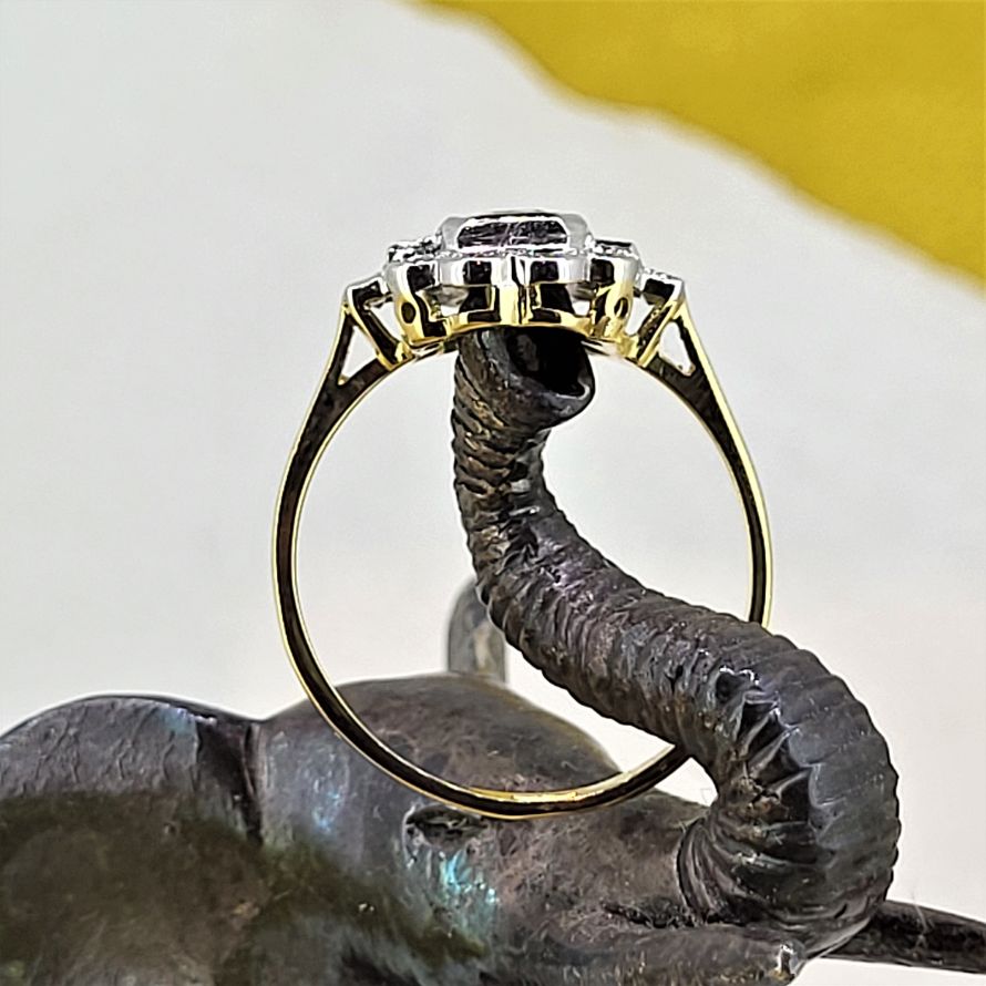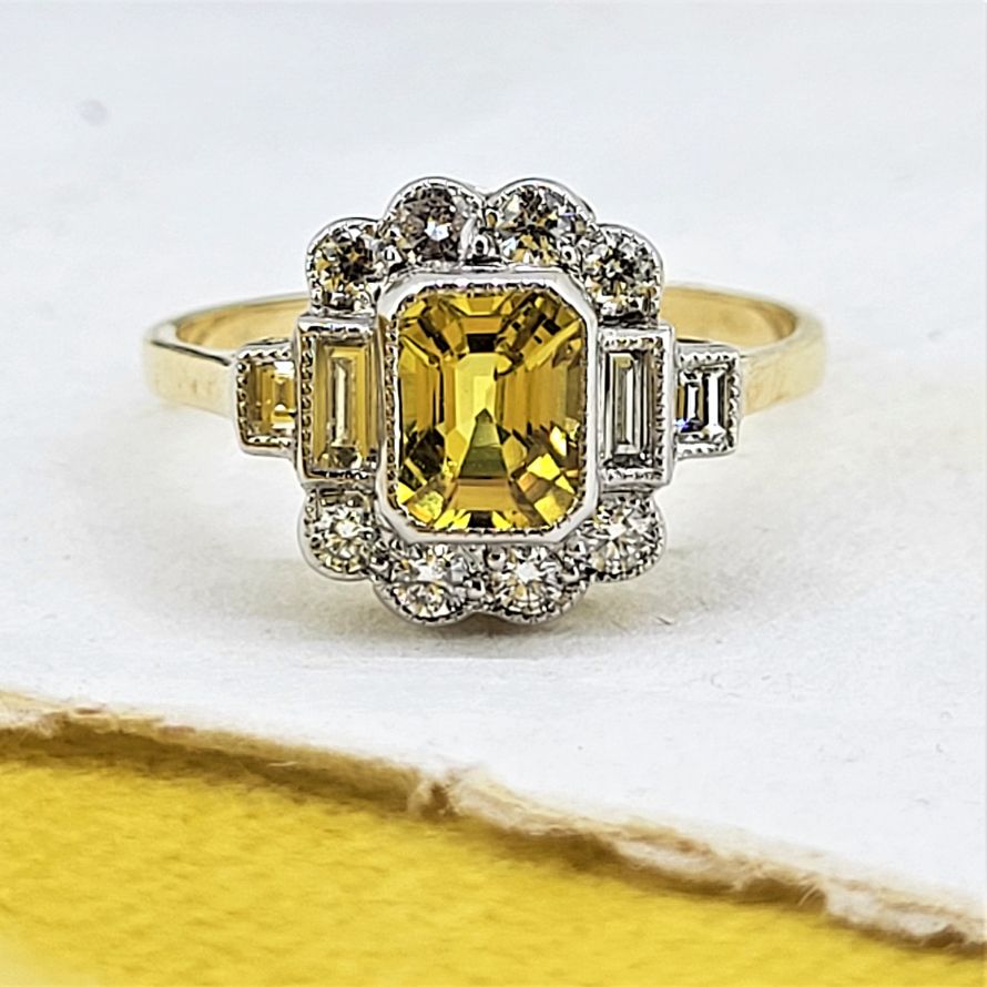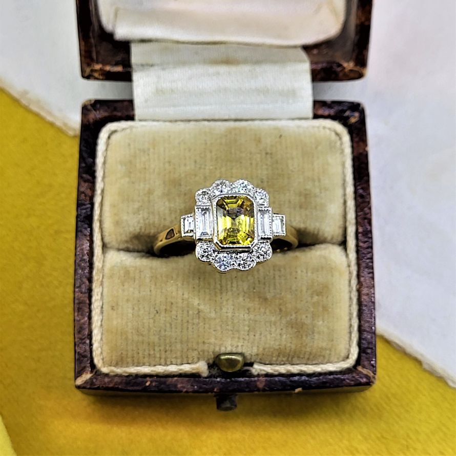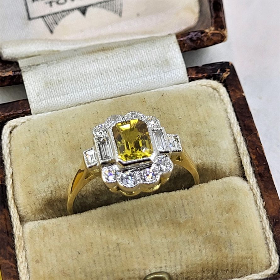 We find citrines so striking and this one is no exception. A traditional cluster with some beautifully set and fabulously sparkly baguette cut diamonds to the side to create the art deco look. Bringing two fabulous traditions together.