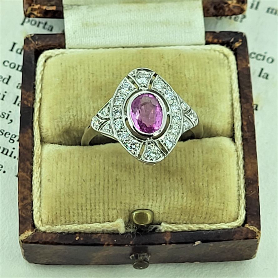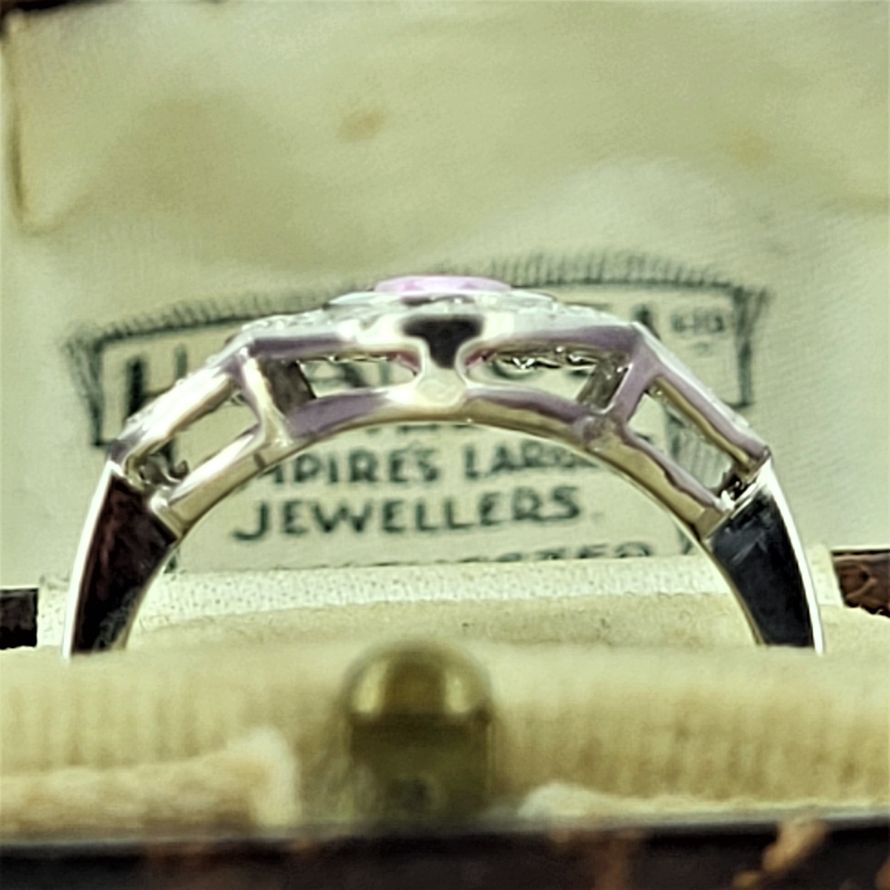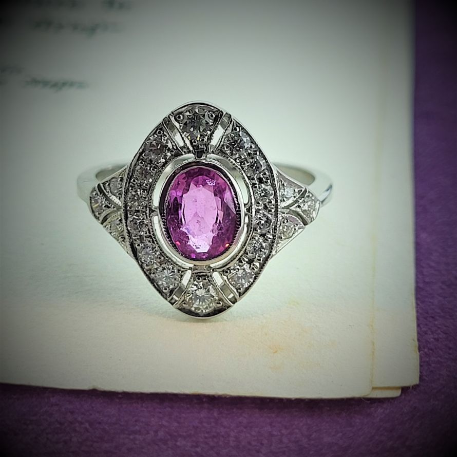 We believe this ring to have been crafted in the 1950s and there remains a feint 18ct mark in the shank. Pink Sapphires were not a hugely popular gemstone choice then and this is a lovely example. Its design resembles that of something from the 1920s but without the straight lines of the art deco period.The size of the ring is significant - the span is almost 2cm all adorned with sparkly round brilliant cut Diamonds surrounding the central Pink sSpphire. The Pink Sapphire itself is oval cut, measuring 7mm by 5mm and weighing an estimated 0.84ct. The ring is size N 1/2 but can be sized to fit.All photography is done in-house. These images are not enhanced or airbrushed — what you see is exactly the item you will receive.