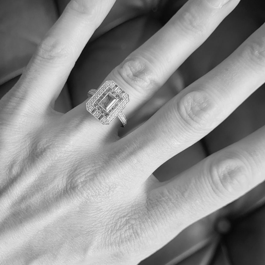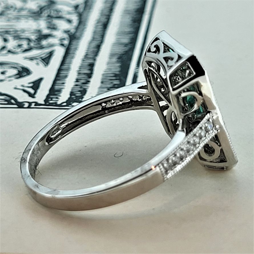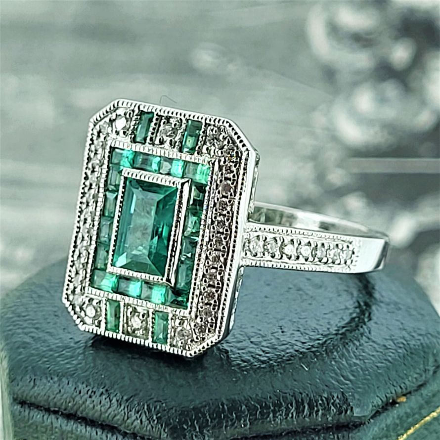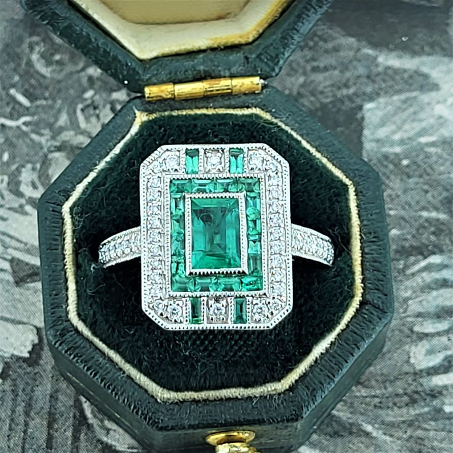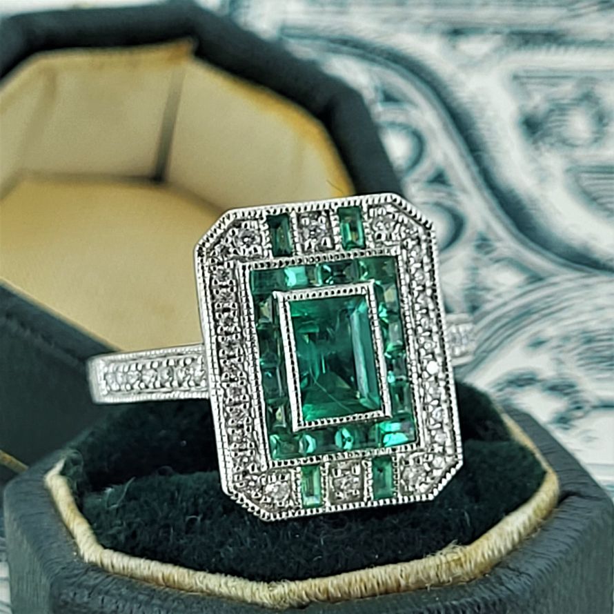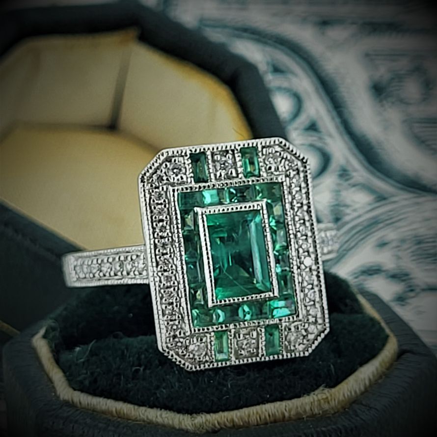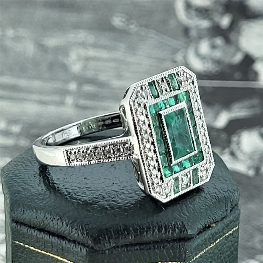Boasting over 0.80ct of Baguette Cut Emeralds designed to showcase the 6mm by 4mm central draw and over 0.30ct of round brilliant cut Diamonds running around the edges and into the shank this ring has an awful lot to offer.All individually set in 18ct White Gold complimented by a milled edge.This ring is currently size O but can be sized to fit. It can also be ordered in a variety of different sizes and coloured gemstone. So, if you have an enquiry please do get in touch!All photography is done in-house. These images are not enhanced or airbrushed — what you see is exactly the item you will receive.