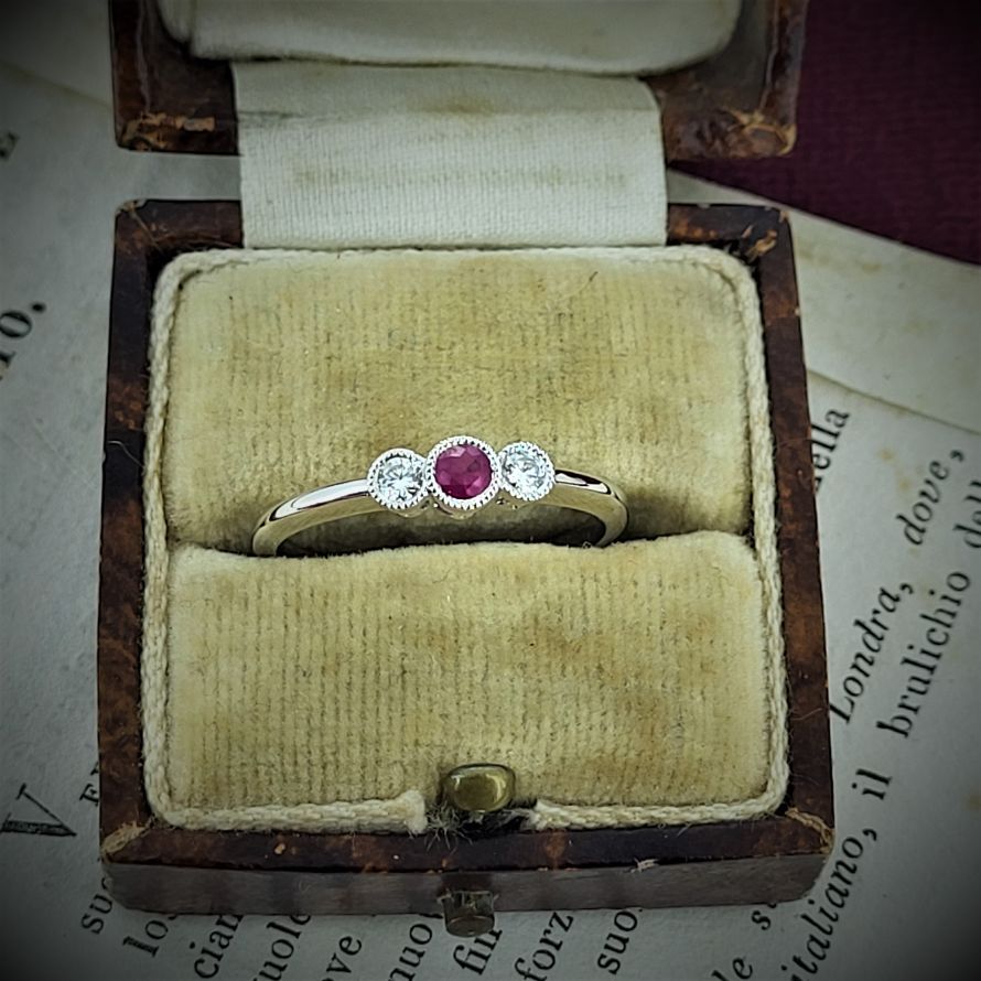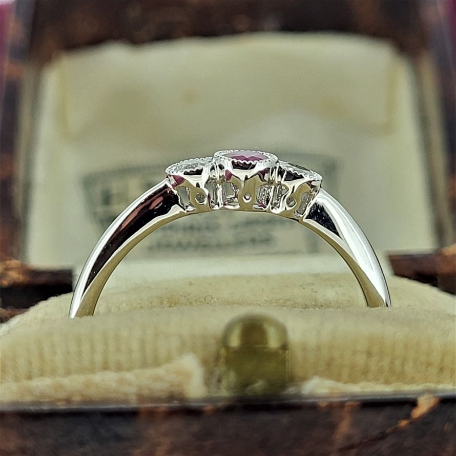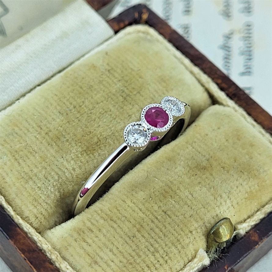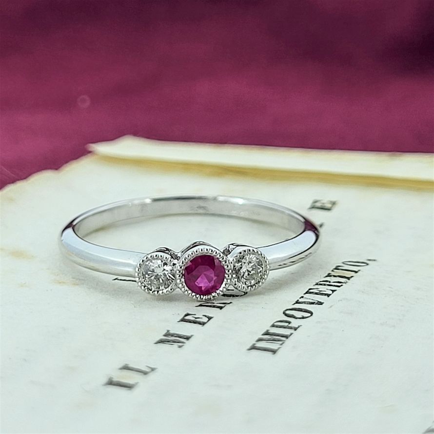Set in 18ct white gold this is a lovely piece, wonderfully crafted each stone is individually channel set with milled edges which add to the definition.The round ruby weighs 0.20ct and the total diamond weight is 0.15ct.The ring is crafted from 18ct white gold and weighs 2.1grams.Currently size O but can be sized to fit. This ring is also available to order in yellow gold and in both emerald and sapphire. Please enquire if you have any questions.All photography is done in-house. These images are not enhanced or airbrushed — what you see is exactly the item you will receive.