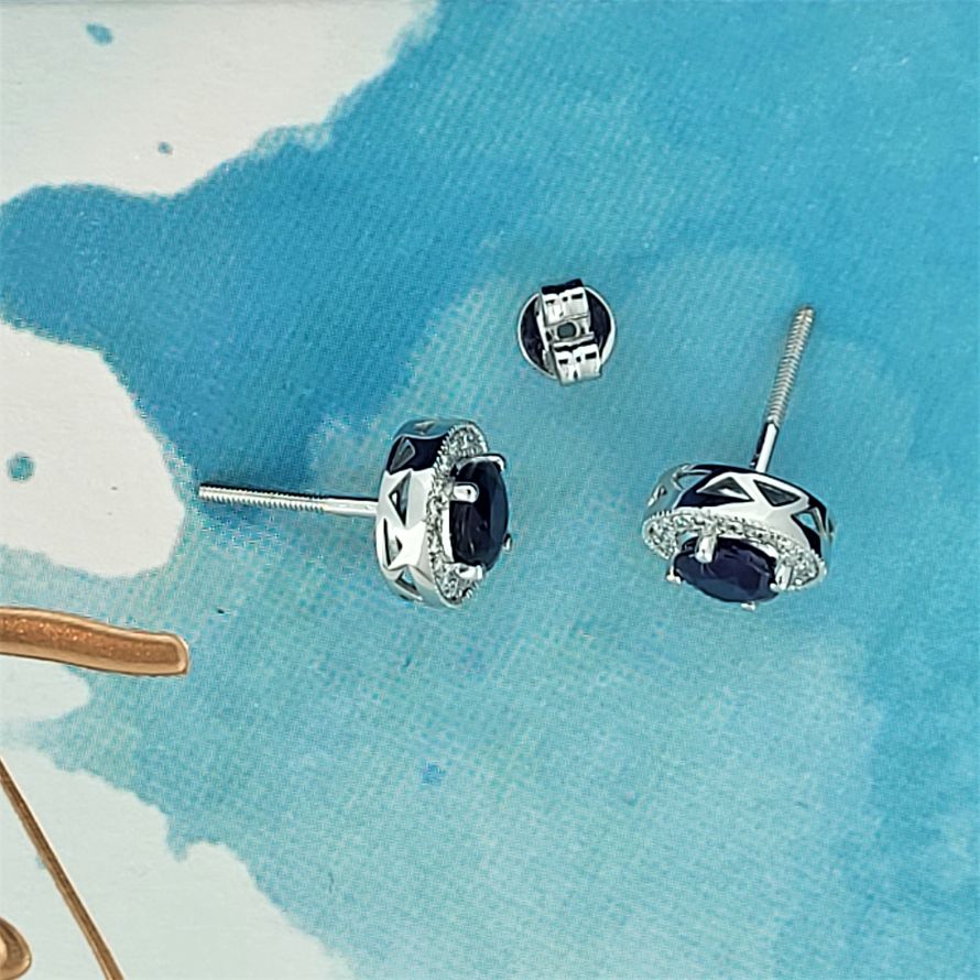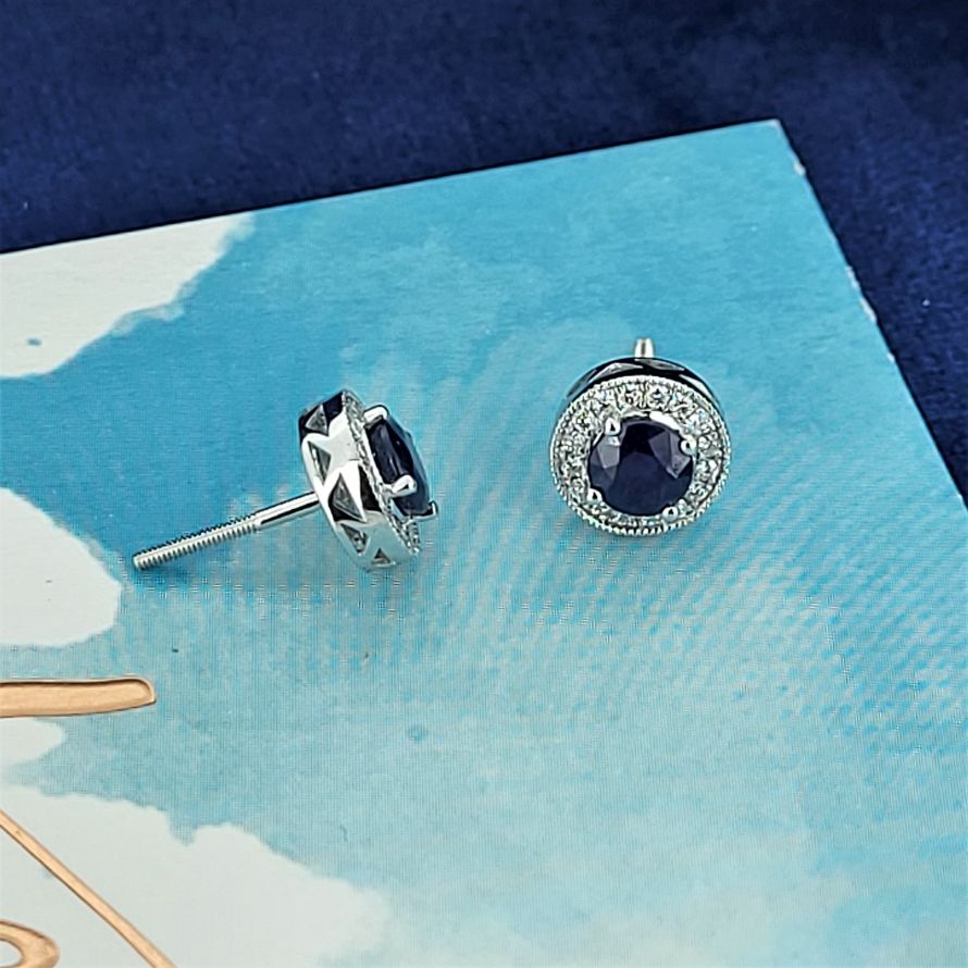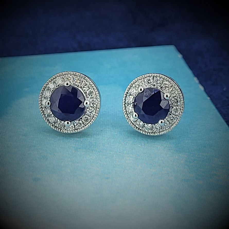 A gorgeous pair of sapphire and diamond stud earrings crafted in 18ct White Gold. The stud itself has an 8.5mm diameter so spans the width of a 2ct plus diamond stud earring. The central sapphire measures 5mm and the total sapphire weight is 1.40ct. Each sapphire is surrounded by individually set round brilliant cut diamonds giving a total diamond weight of 0.30ct. They are a lovely piece, a must have for any jewellery box! Also available in yellow gold and with your choice of either emeralds or rubies!