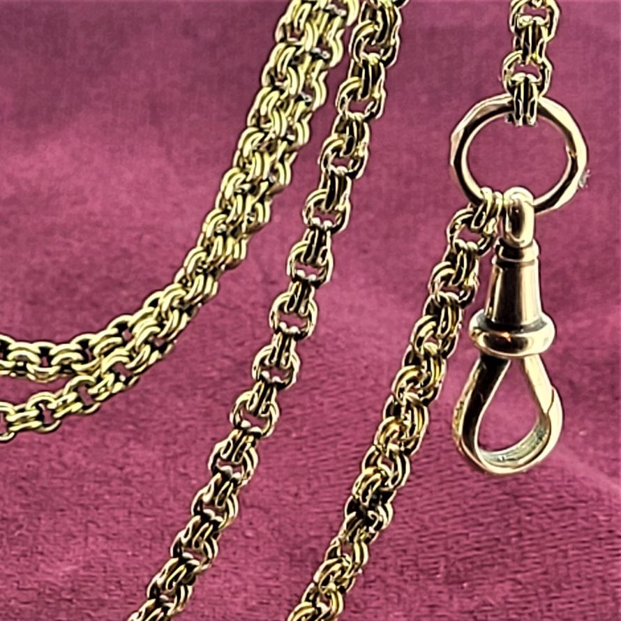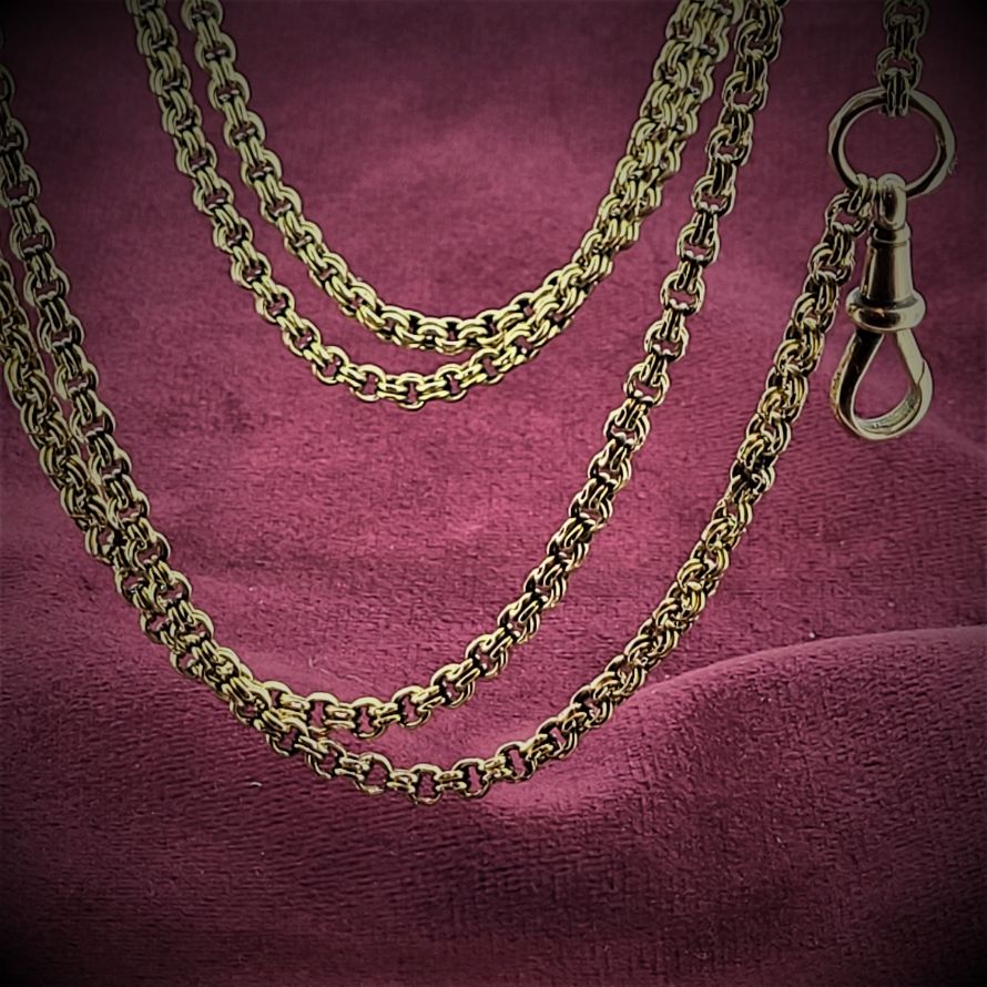 Absolutely delighted to present this original Victorian longuard (or muff chain) chain crafted from 9ct yellow gold. It is rare to be able to offer such a piece in the €1000 range and for that we must thank its intricate hollow belcher link. We must not be dismissive of its weight though as at 25.7 grams this is still a substantial piece.
