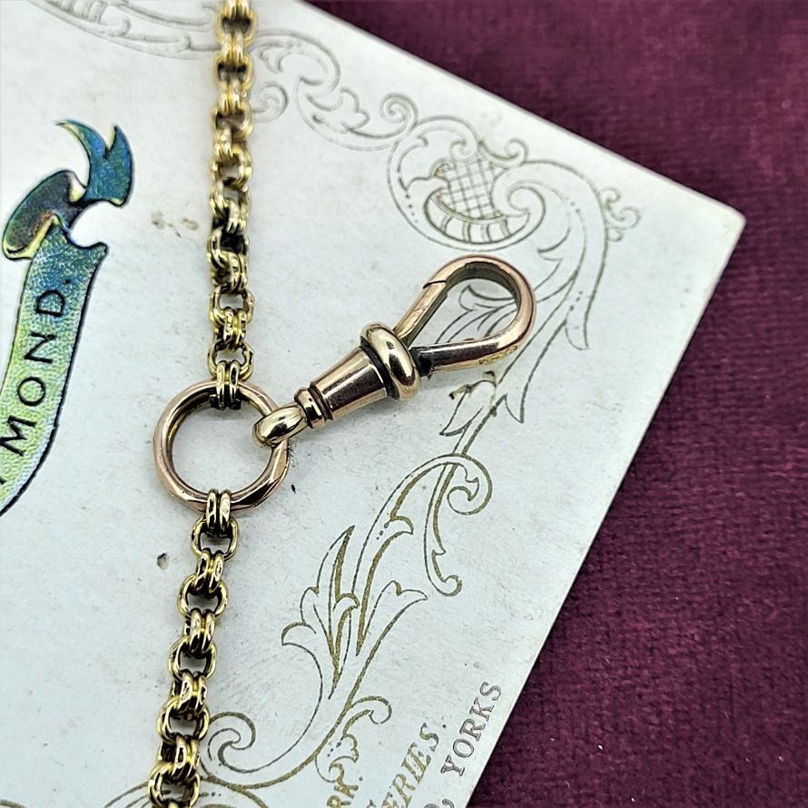 The metal itself tests above 9ct gold on an XRF analyser and this is illustrated by its rich yellow hue. The swivel and bolt ring have a somewhat rose tint and the swivel is stamped 9ct. Despite the slight mismatch in the colour between the swivel and the chain we decided to leave the chain in its original form, the difference only adding to the charm. They could of course be changed on request.