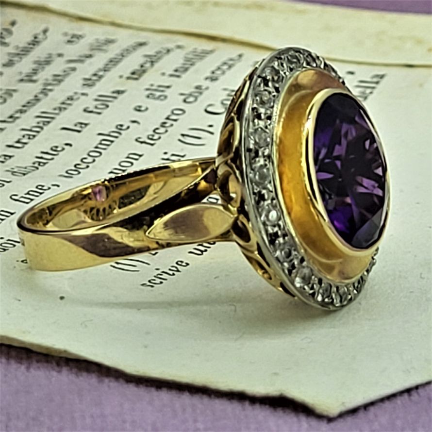 The amethyst measures 12mm and is circa 4.8ct of wonderful, lustrous purple delight! The amethyst is channel set with 18ct yellow gold elevated slightly above a 2mm yellow gold surround. The outer surround is filled with beautiful round brilliant cut diamonds, 19 of them in total, each measuring 2mm.