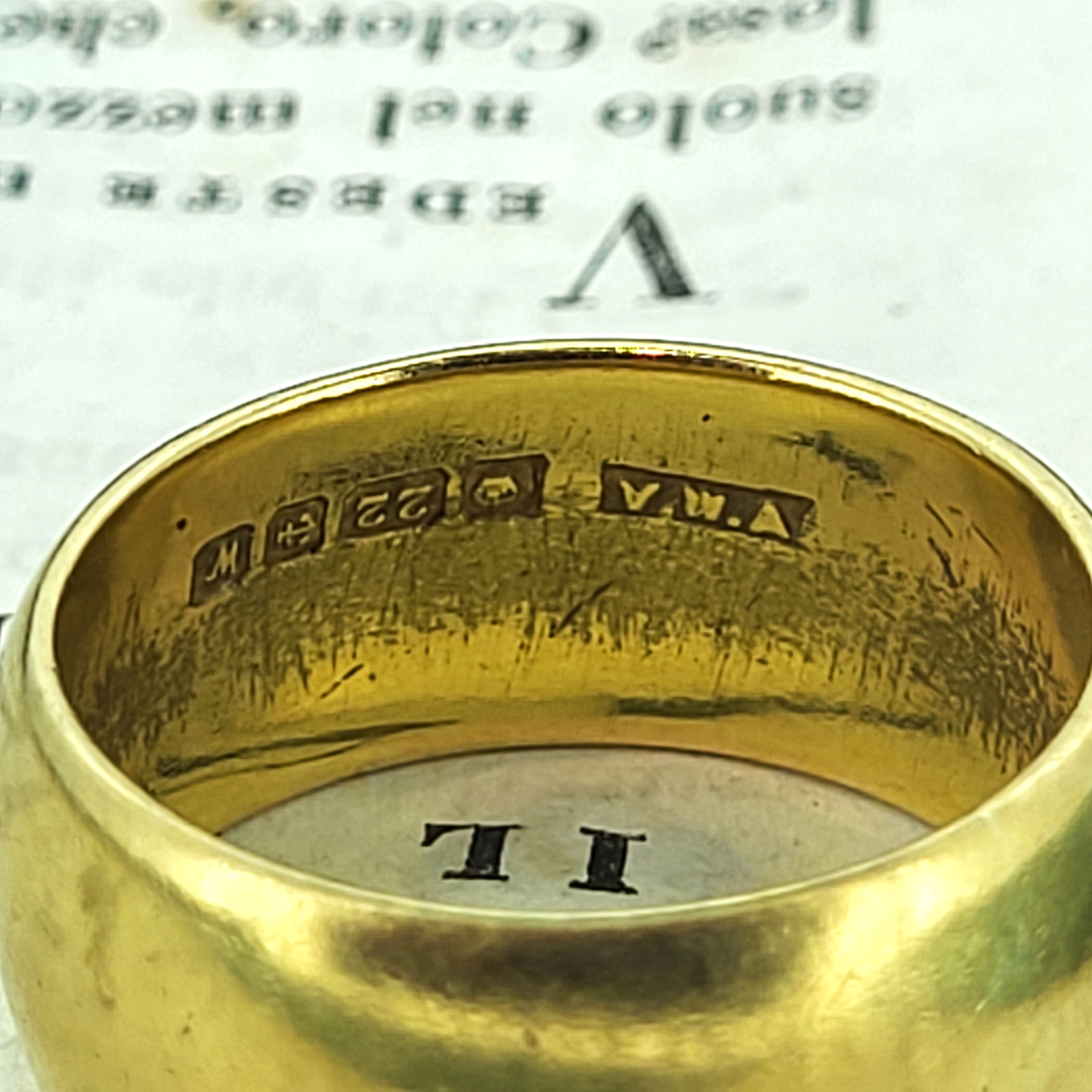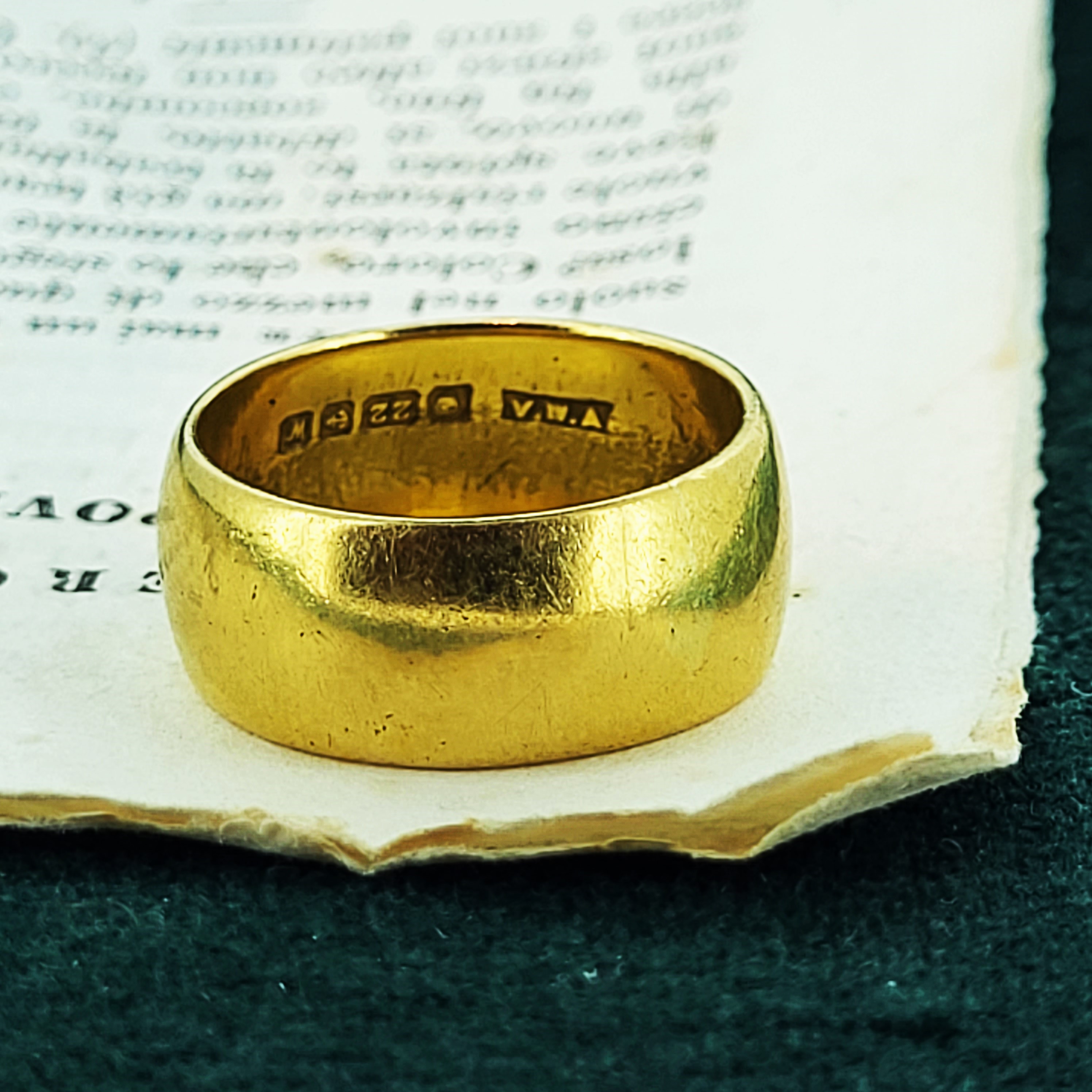 For those who are looking for the perfect, ethical wedding ring this could be for you! This wedding ring is crafted from 22ct Gold and measures 8.5mm across the top. It is a Light Weight D-Shape profile and the ring was fully hallmarked in Birmingham by V.W.A, dated between 1971 - 1972.
