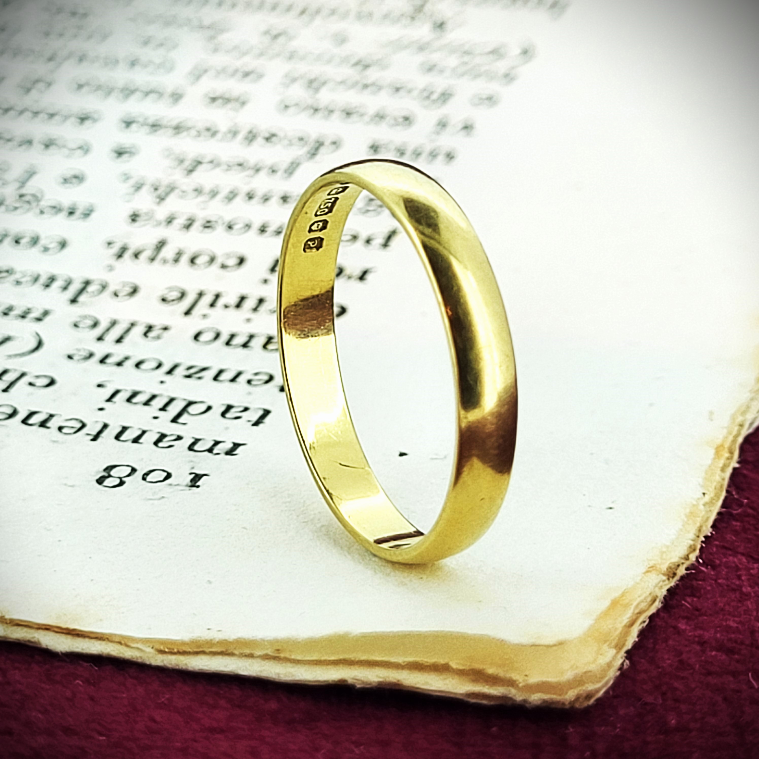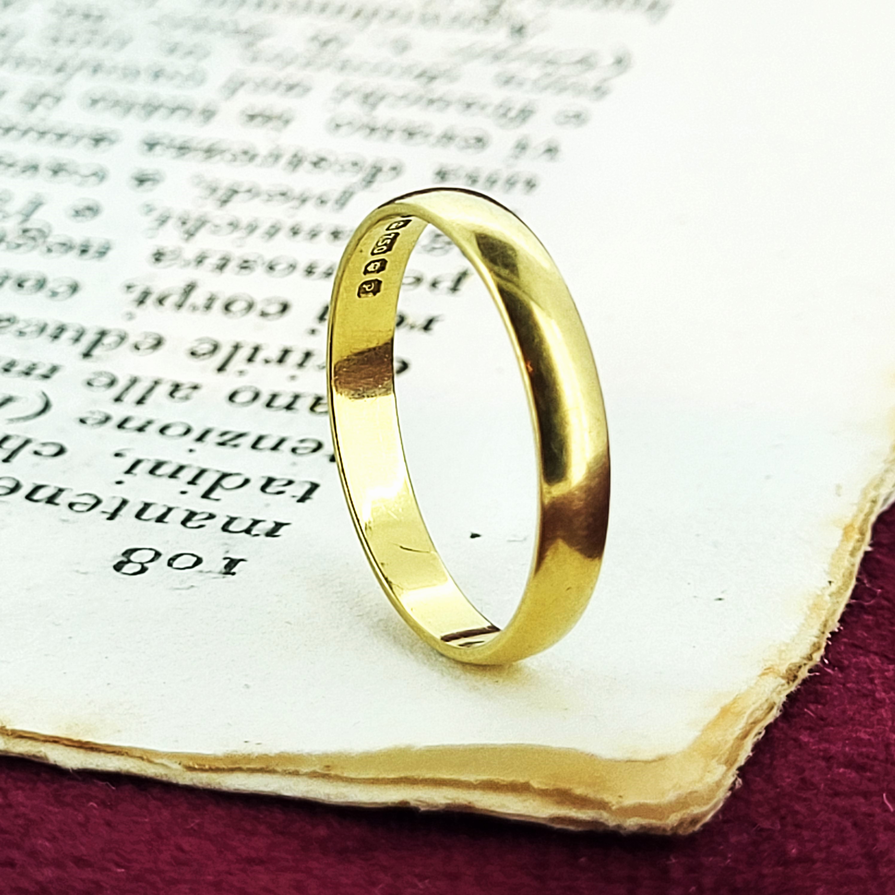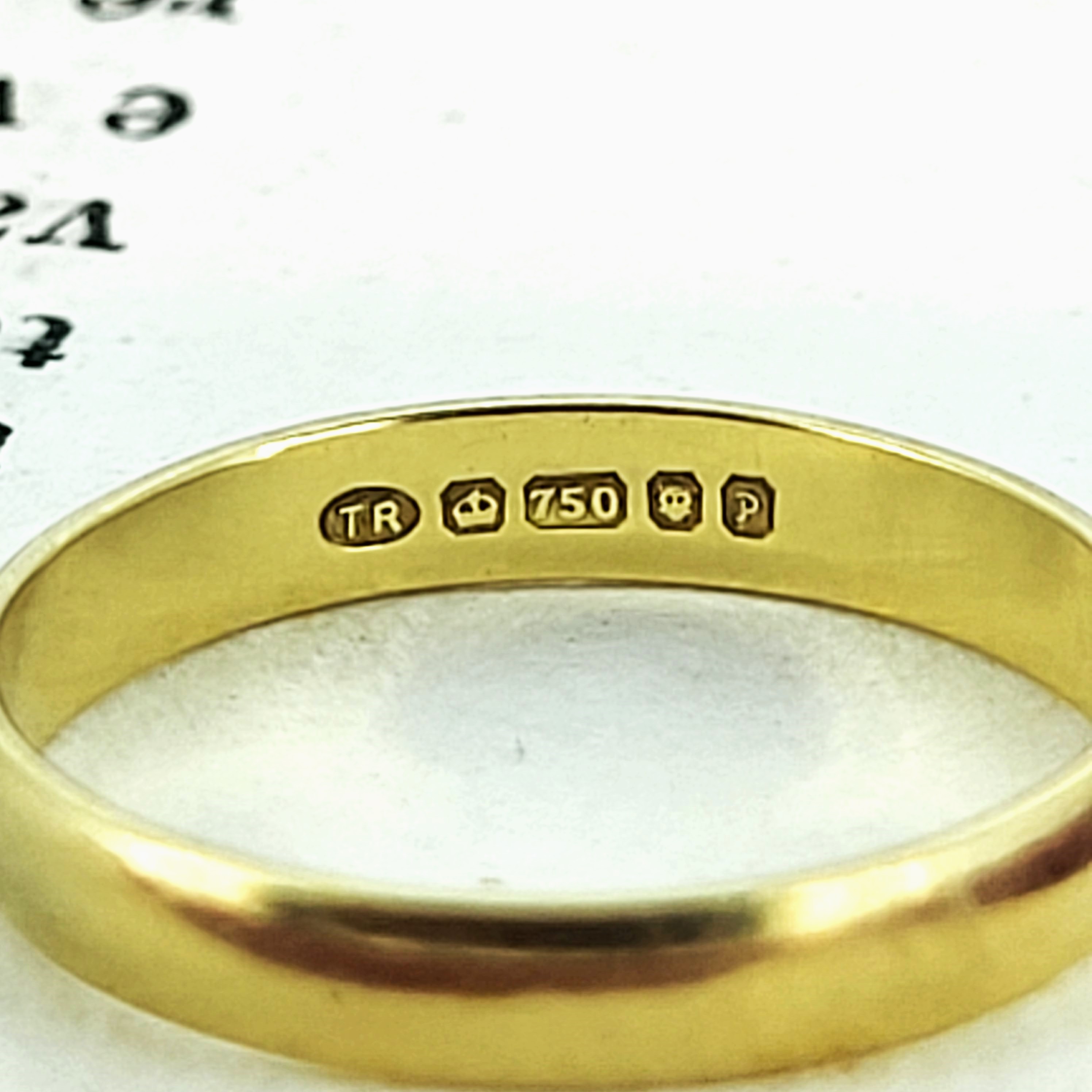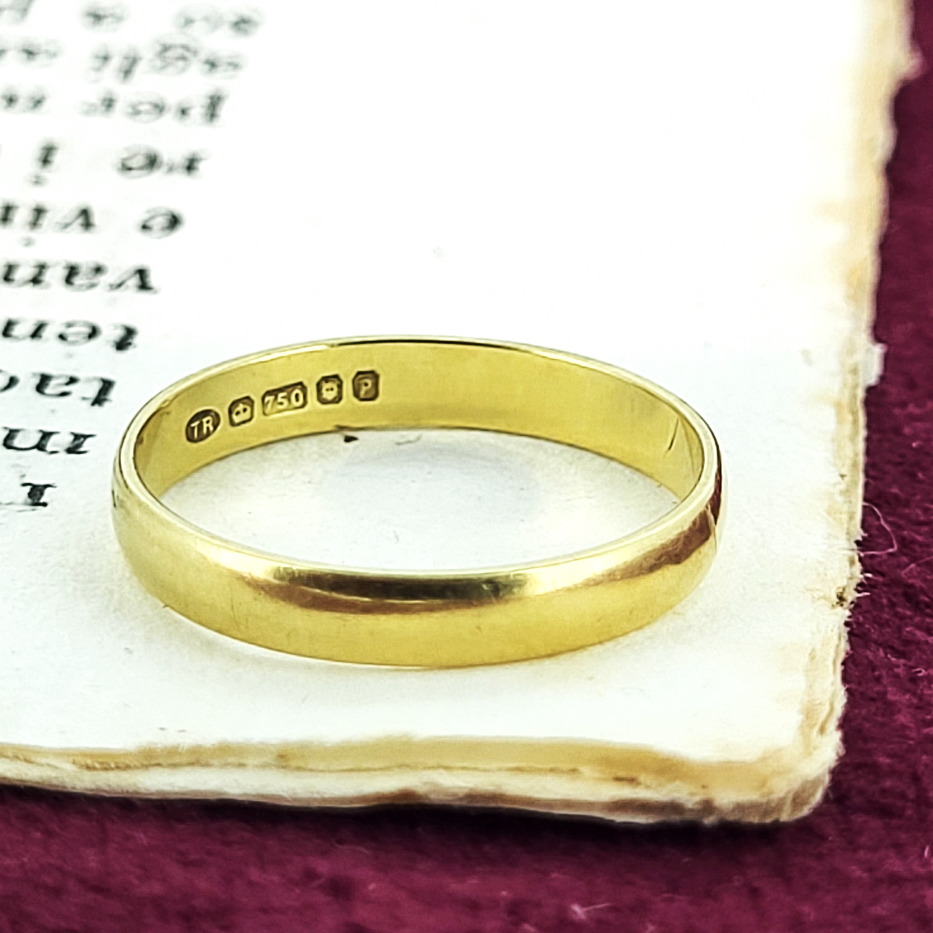 This sustainable 3mm D-Shape Wedding Ring was hallmarked in London in 1989 with a T R Makers Mark. It weighs 1.3 grams making it a light weight profile, meaning it sits flush to the finger and is a genuine joy to wear. The ring is made from 18ct Gold and is currently a Size K and can be sized.