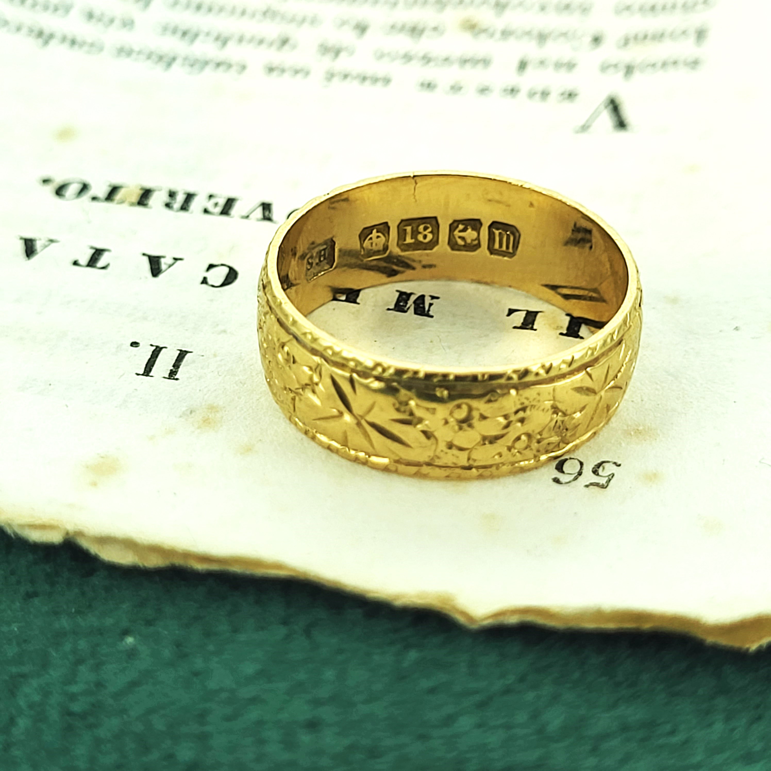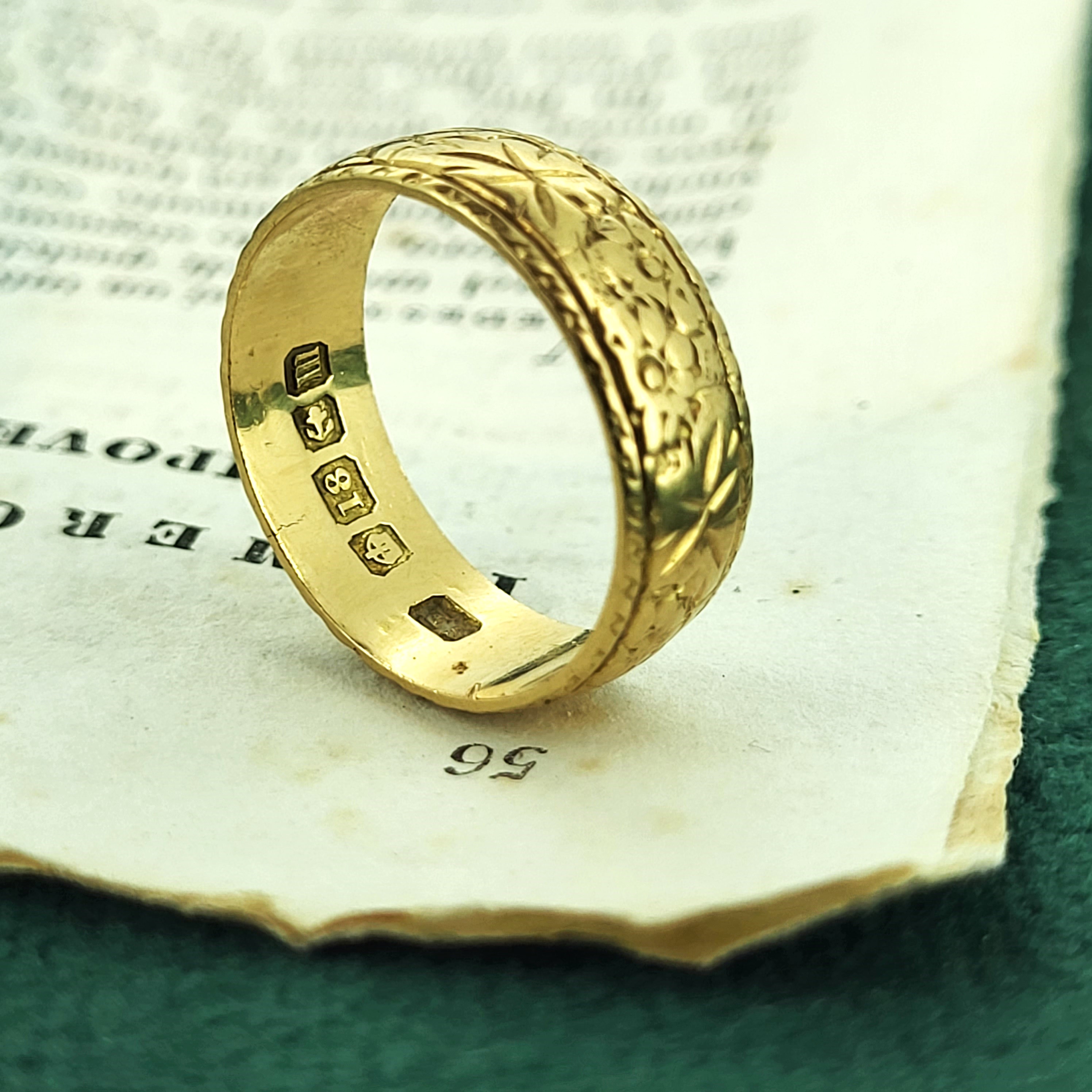 This 6mm Light Weight D-Shape has been crafted in 18ct Gold. It weighs 3.9 grams and has been fully hand engraved on the outside of the band.