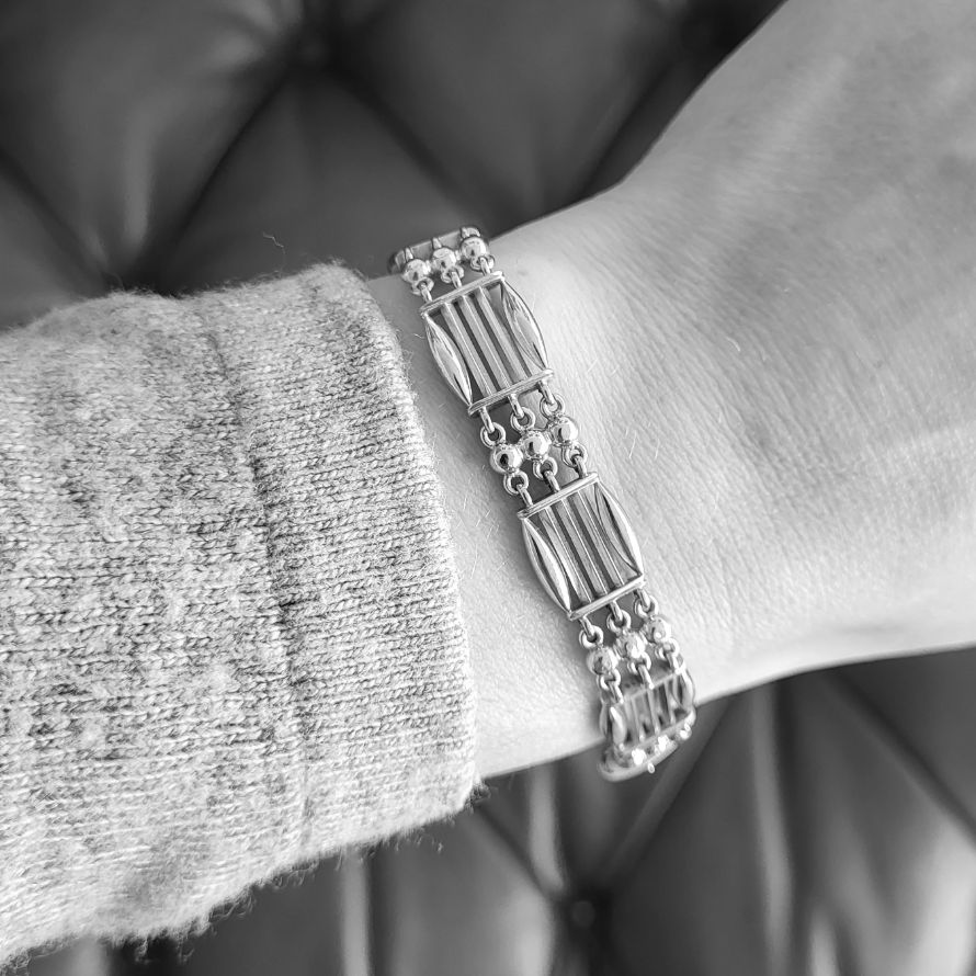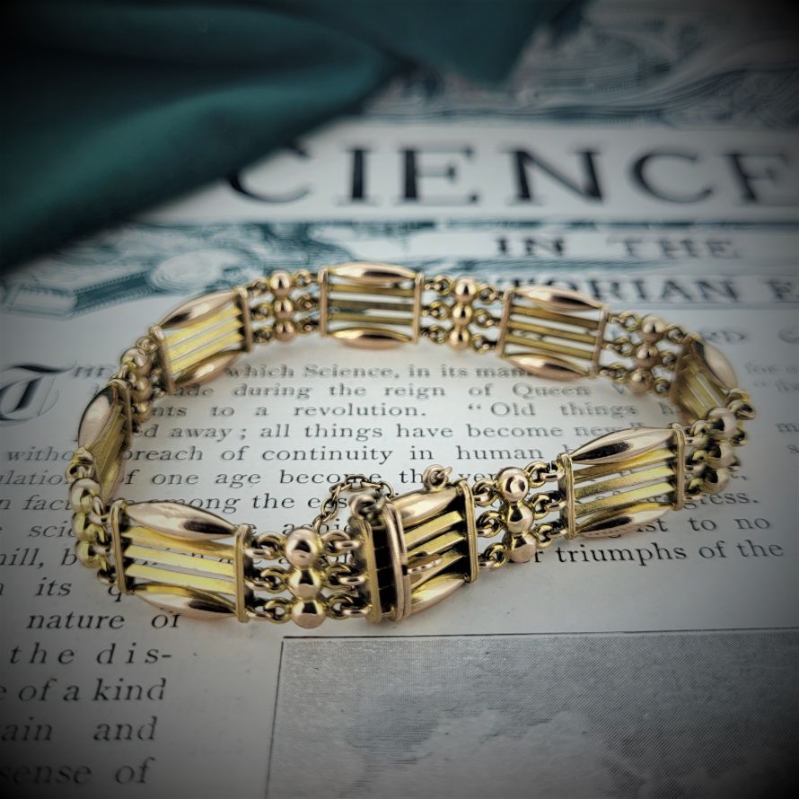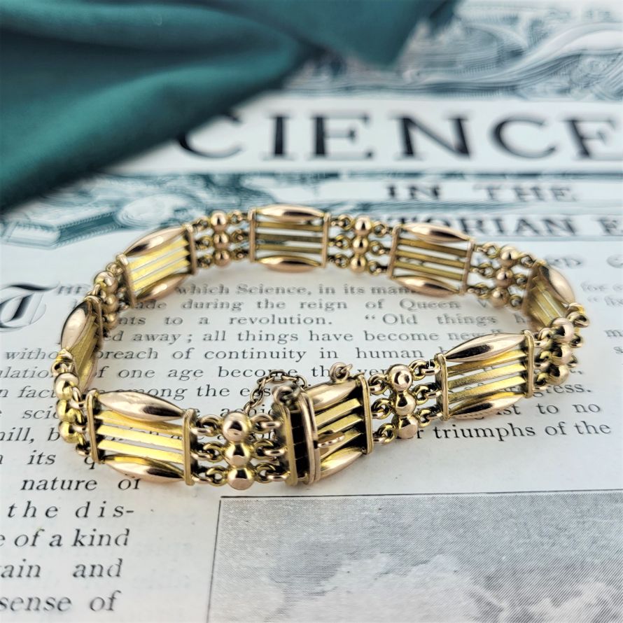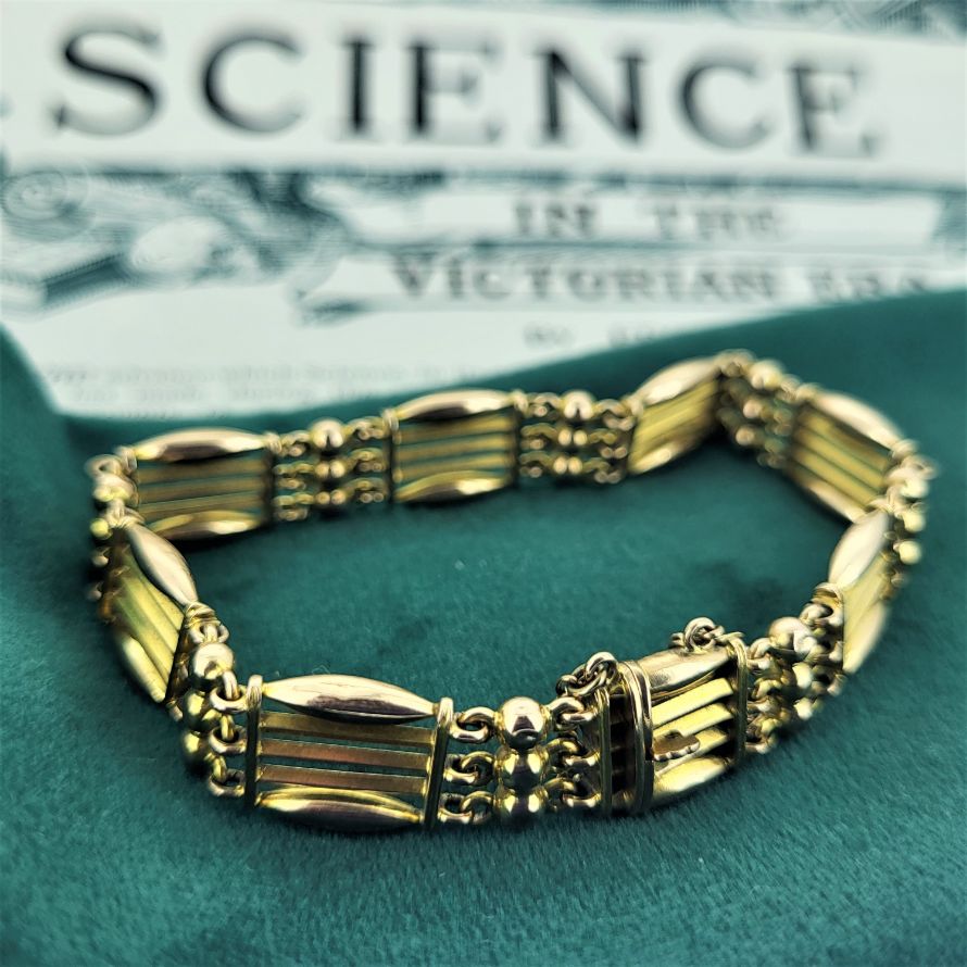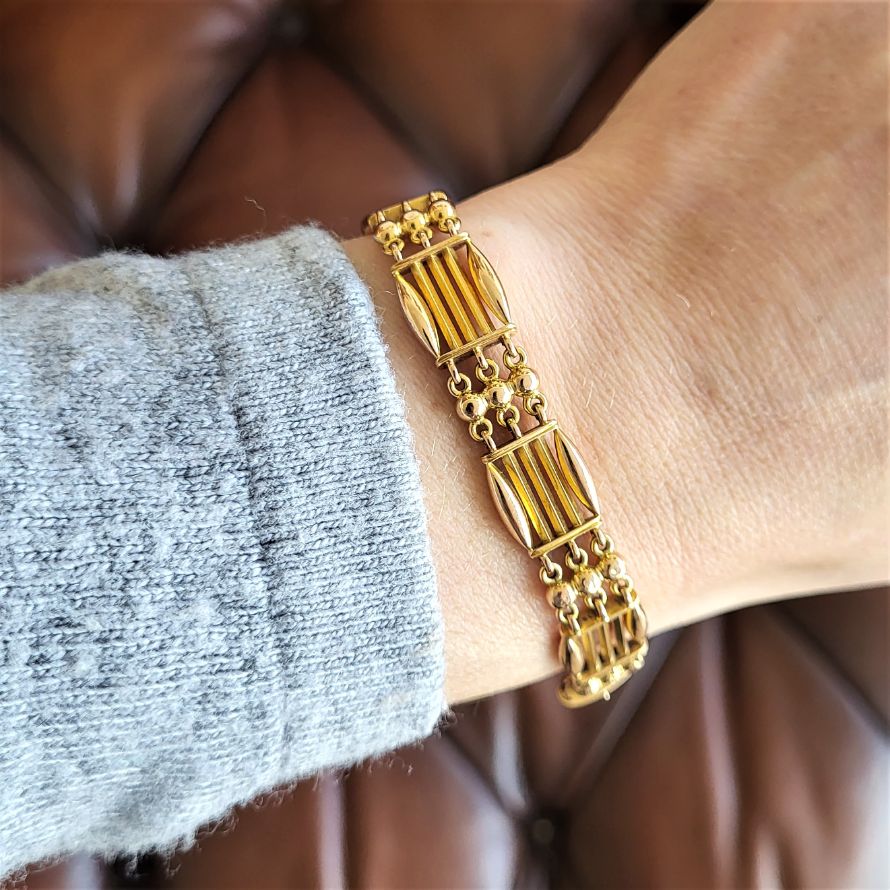 The bracelet will fit a 16cm wrist, weighs 18.1grams in 15ct gold and is fitted with a safety chain. We love it!