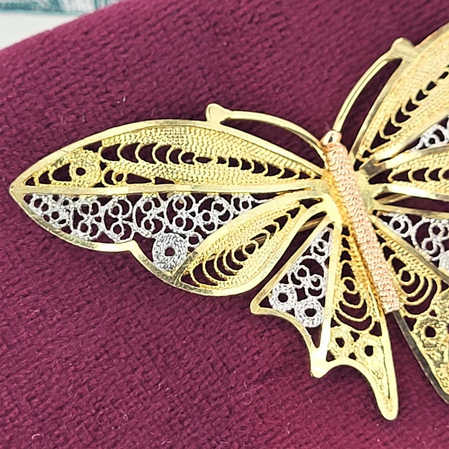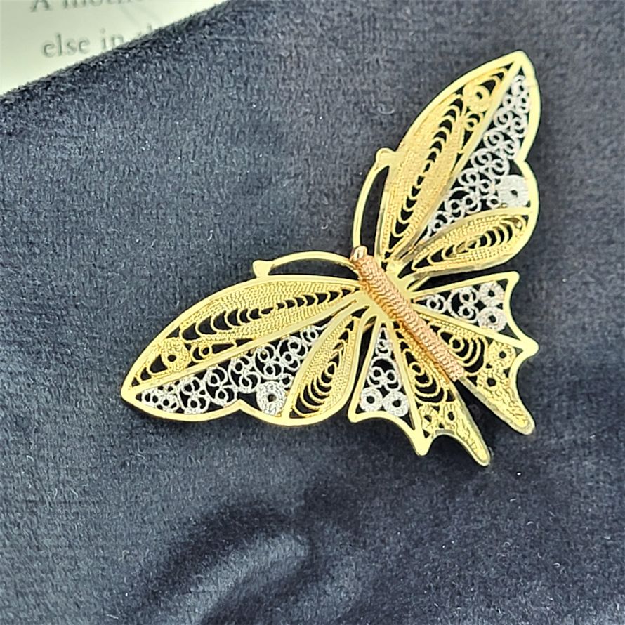 Here we present a wonderfully diamond cut butterfly brooch. Reflecting the vibrance of the real life Butterfly this brooch is crafted from 9ct white, yellow and rose gold. The diamond cut wings and body add a scintillating effect that dazzles in the light.