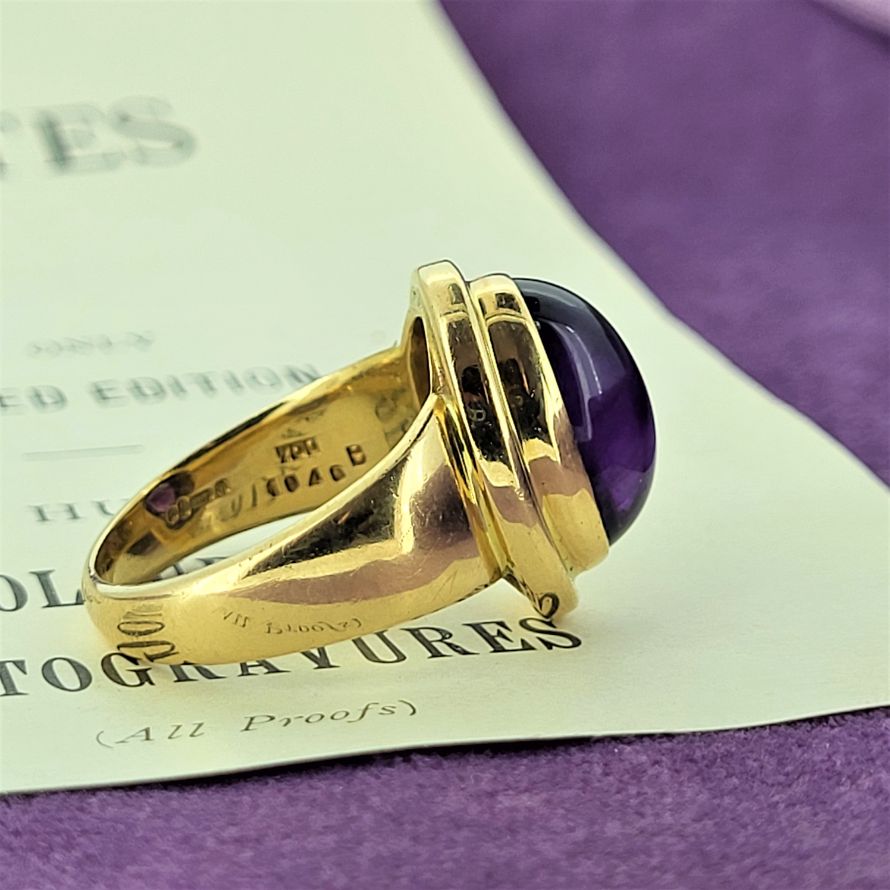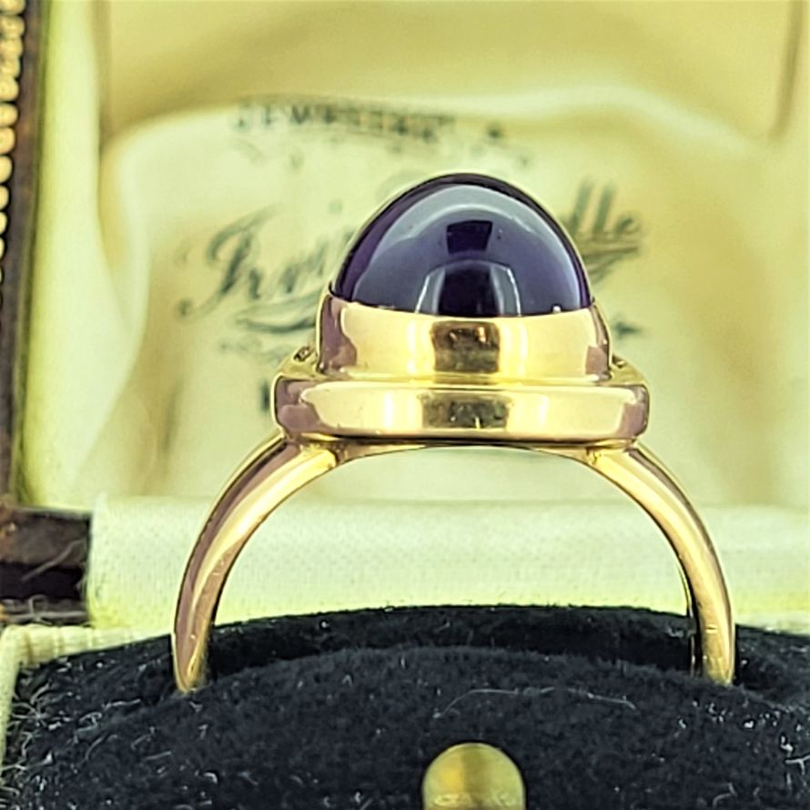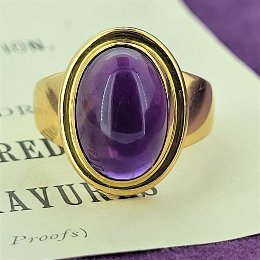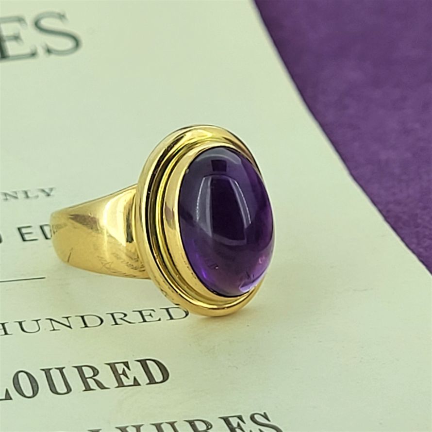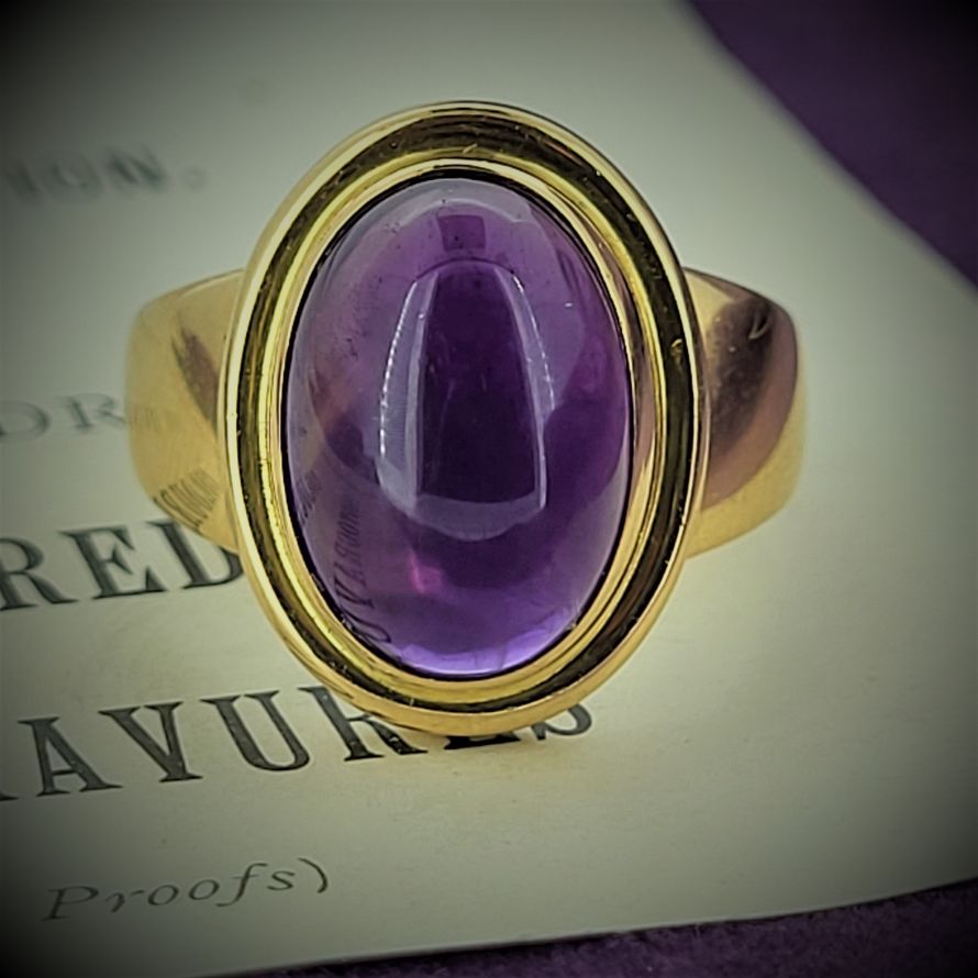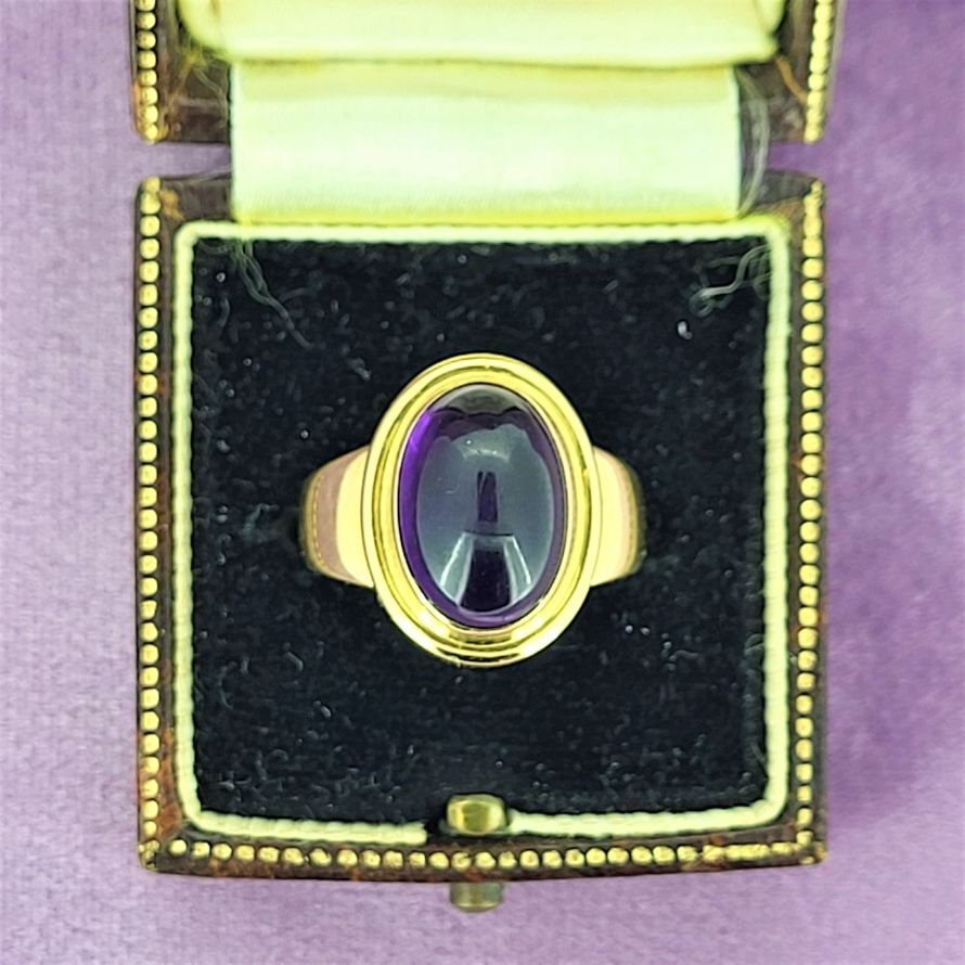 8.4 grams of 18ct Gold, a single piece that houses a spectacular deep purple cabochon Amethyst measuring 12mm by 9mm.