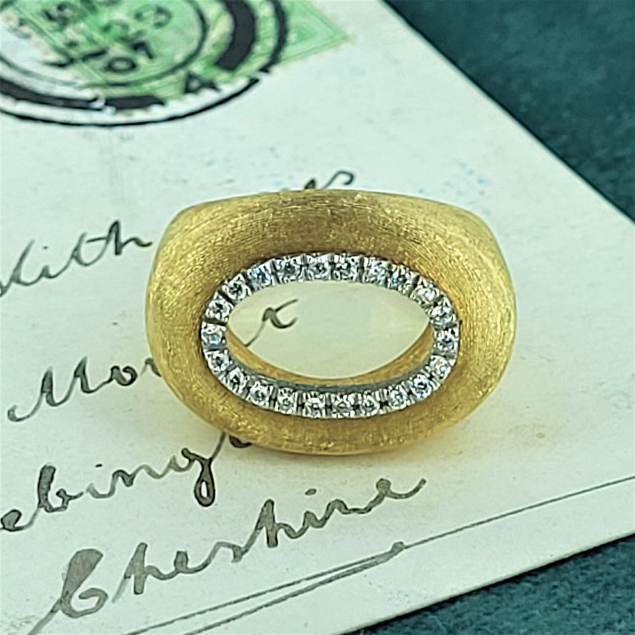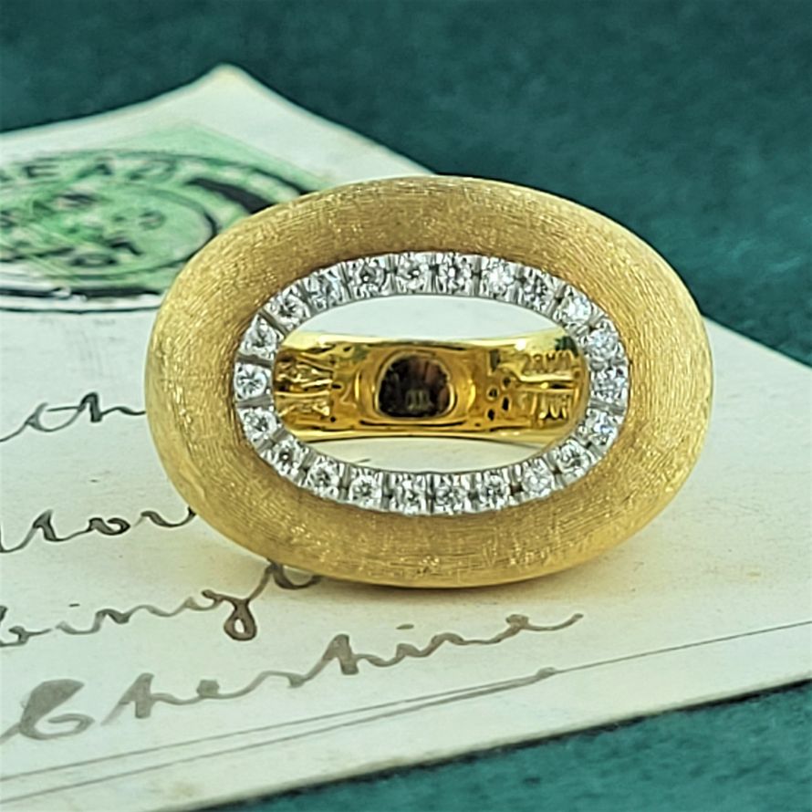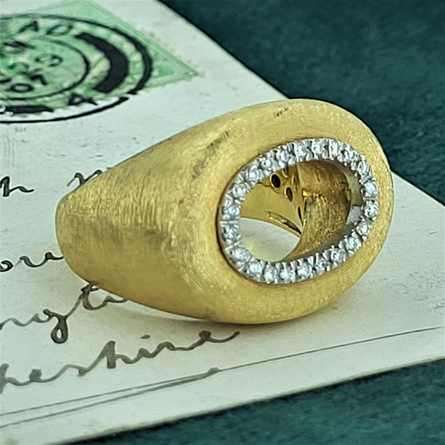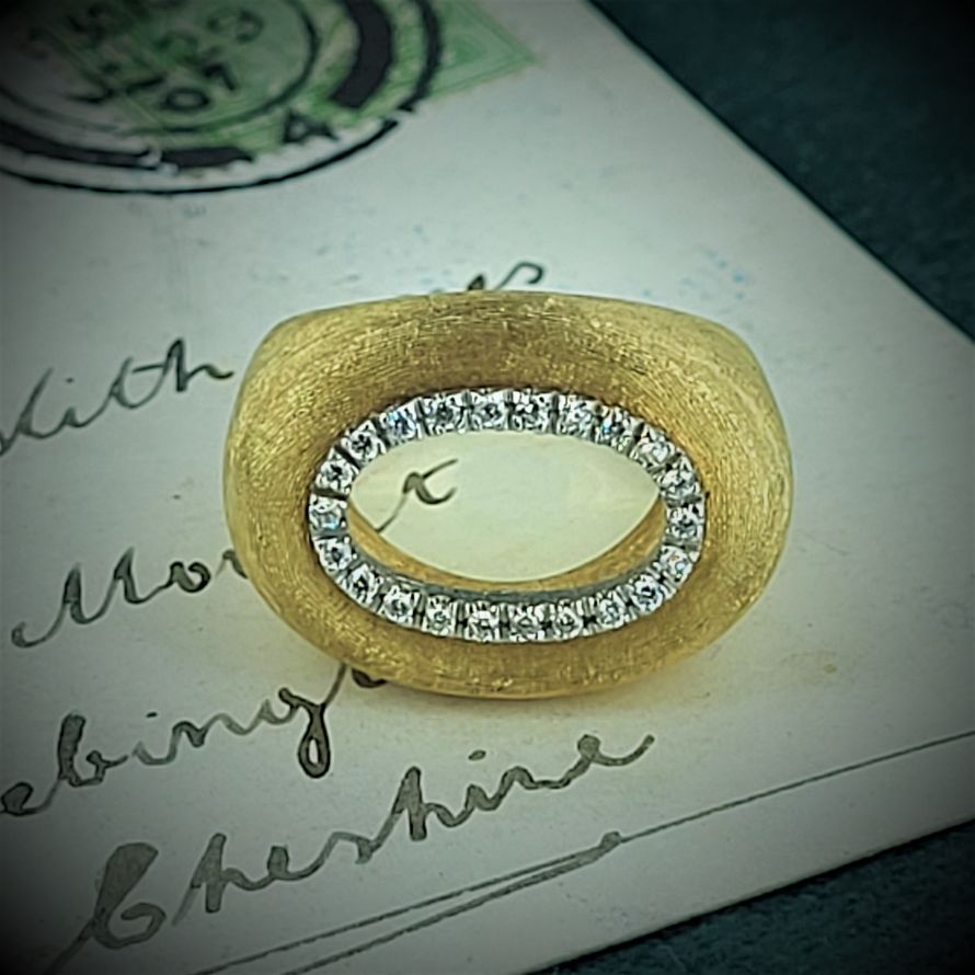 Italian (so already a firm favourite in our opinion) with brushed/frosted gold and diamonds. This dress ring is crafted to perfection.