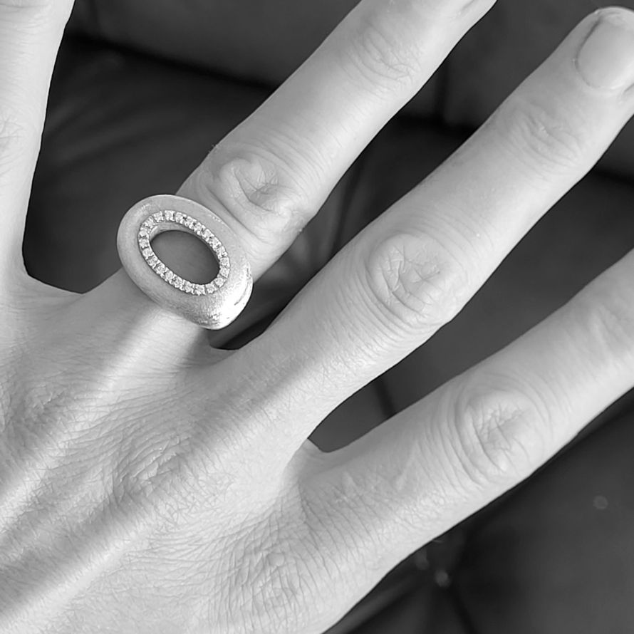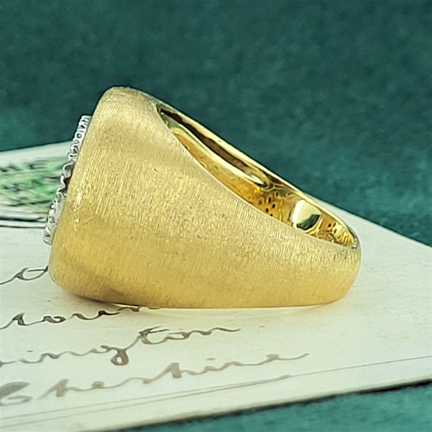 Weighing in at 15 grams of 18ct gold this is a heavy piece, it's brush effect means that even the most heavy handed of us can enjoy without too much care of a knock or a scrape. The diamond border around the center consists of 22 round brilliant cuts measuring 1.5mm each with a total estimated carat weight of 0.33ct. It's spread is impressive stretching to 23mm across the finger. And it's just so comfortable. The Italians do it well!