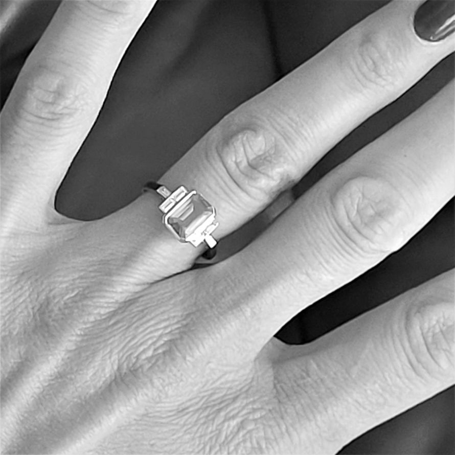 There are 0.25ct of baguette cut diamonds, all set in Platinum and the ring is currently size N 1/2. It can be sized easily, weighs 3.8grams and is stamped PLAT.