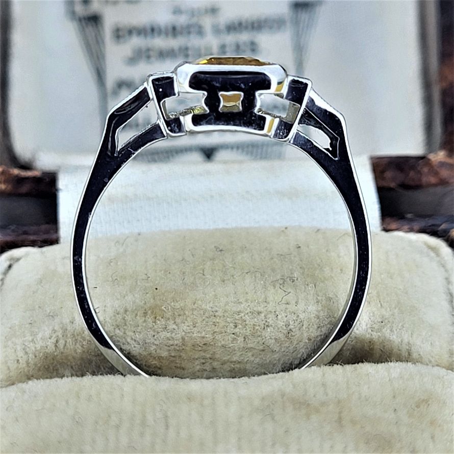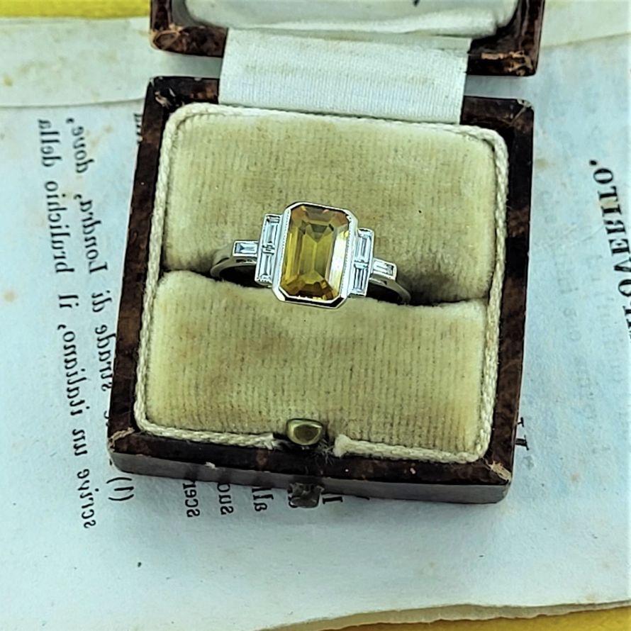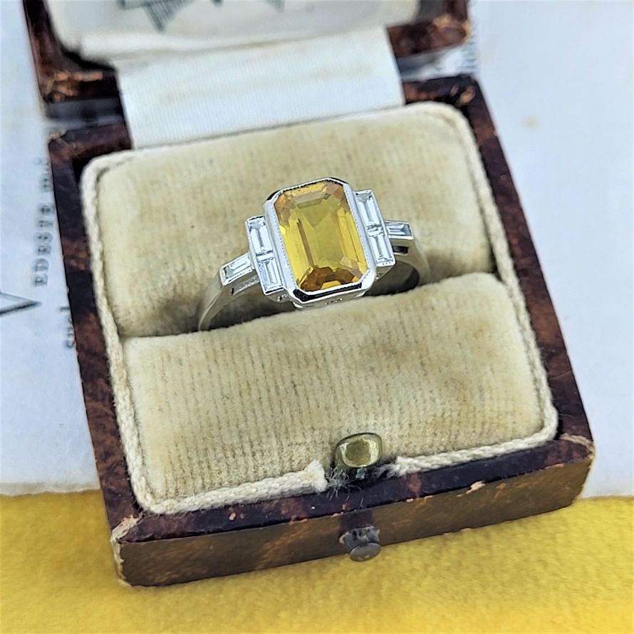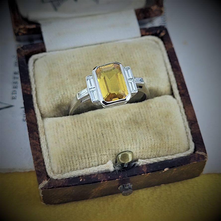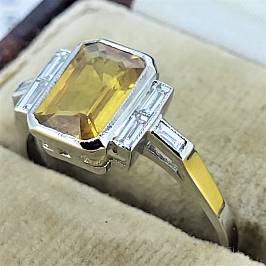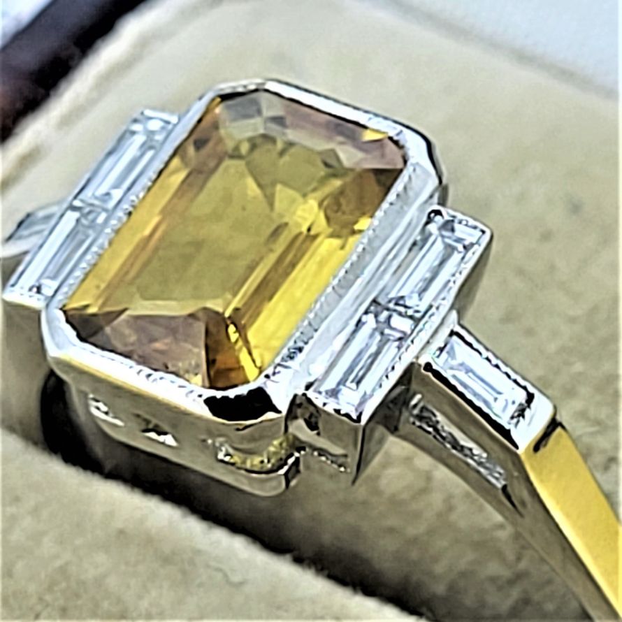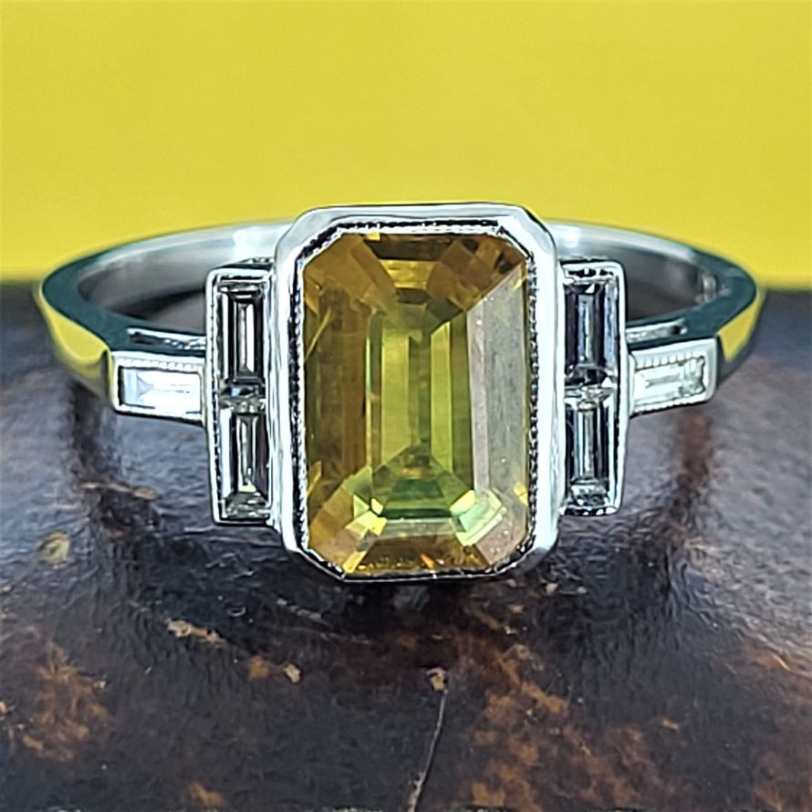 Yellow Sapphire and Baguette Cut Diamonds set in Platinum - an Art Deco inspiration!