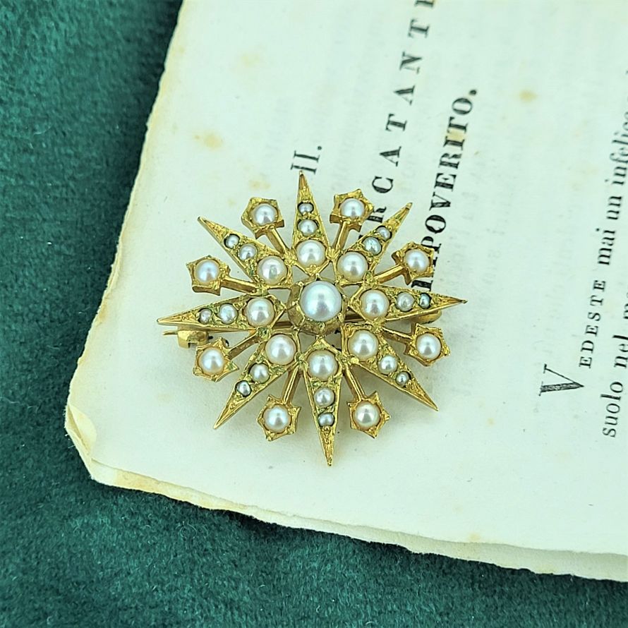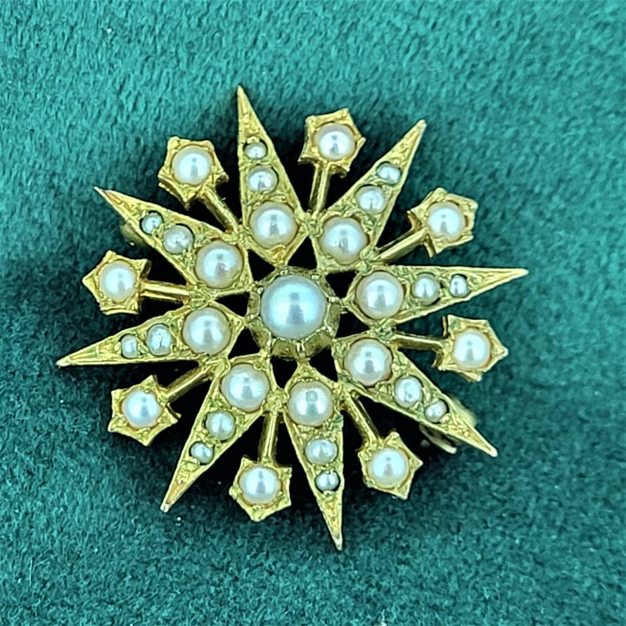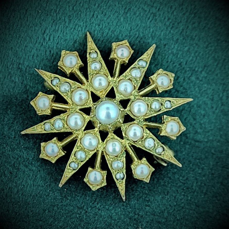 Typical of the Victorian Star this example shows graduated seed pearls tapering outwards. All pearls are intact. There is a makers mark for DHJ but unfortunately we cannot find any further information.