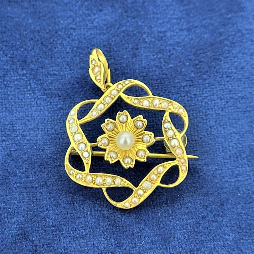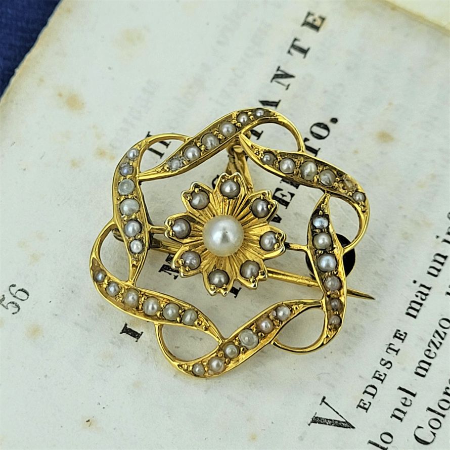 The central flower design is surrounded by a soft formation of pearls that flow around the outside surrounded in delicate 9ct gold.
