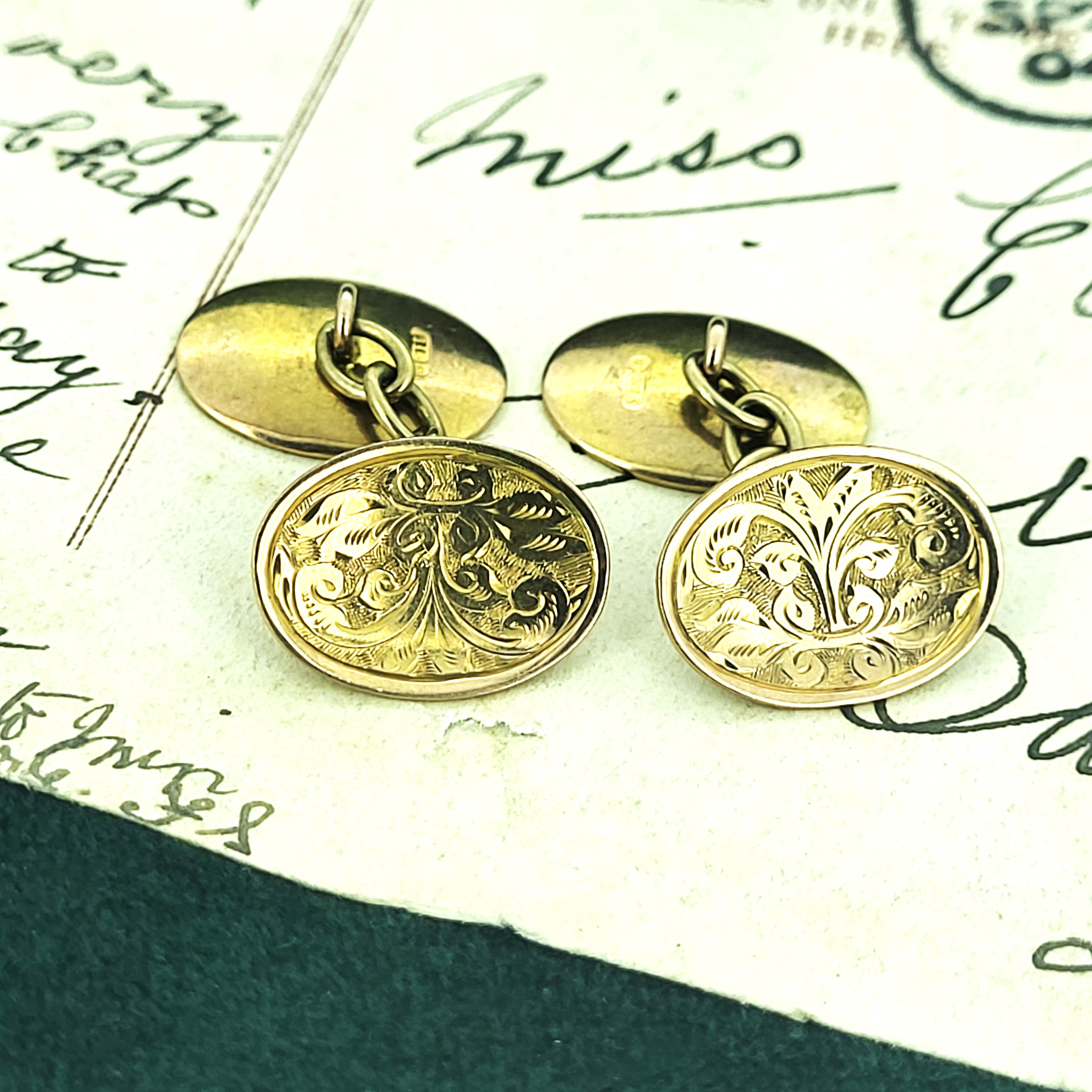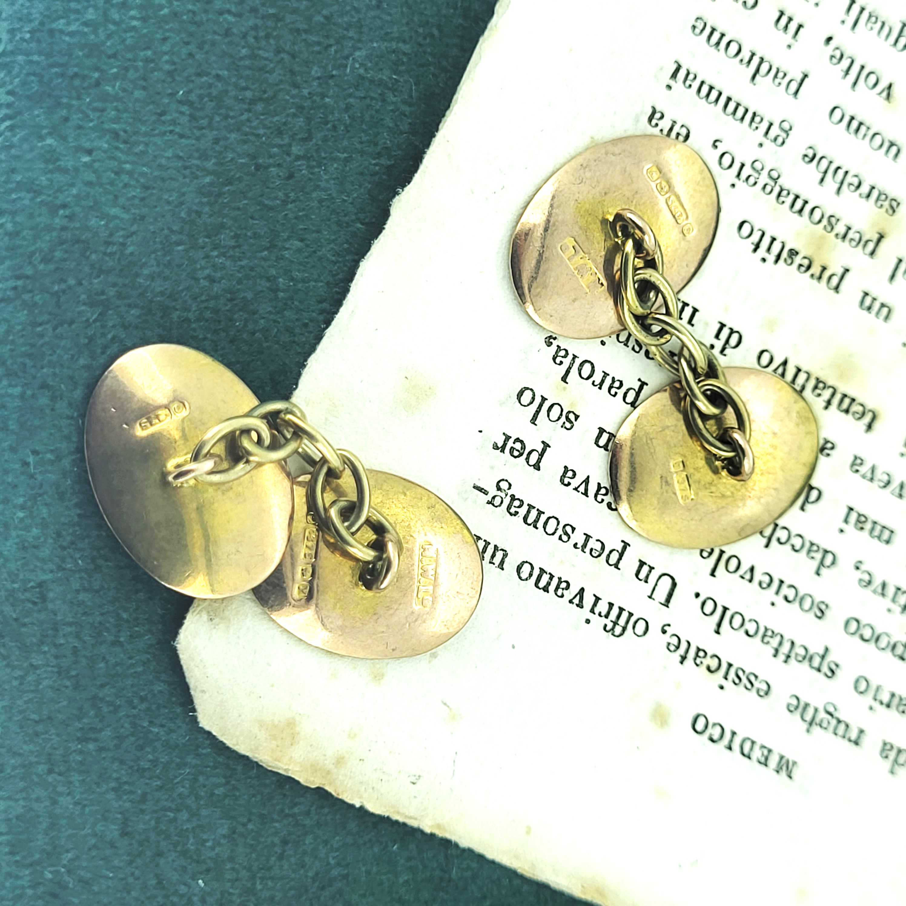 They are crafted from 9ct Gold and were hallmarked in Birmingham in 1923 with the Makers Mark N.W Ltd. They feature an oval chain link design, measure 11mm by 16mm and weigh 4.9 grams. You can be assured these timeless cufflinks add effortless style and elegance.