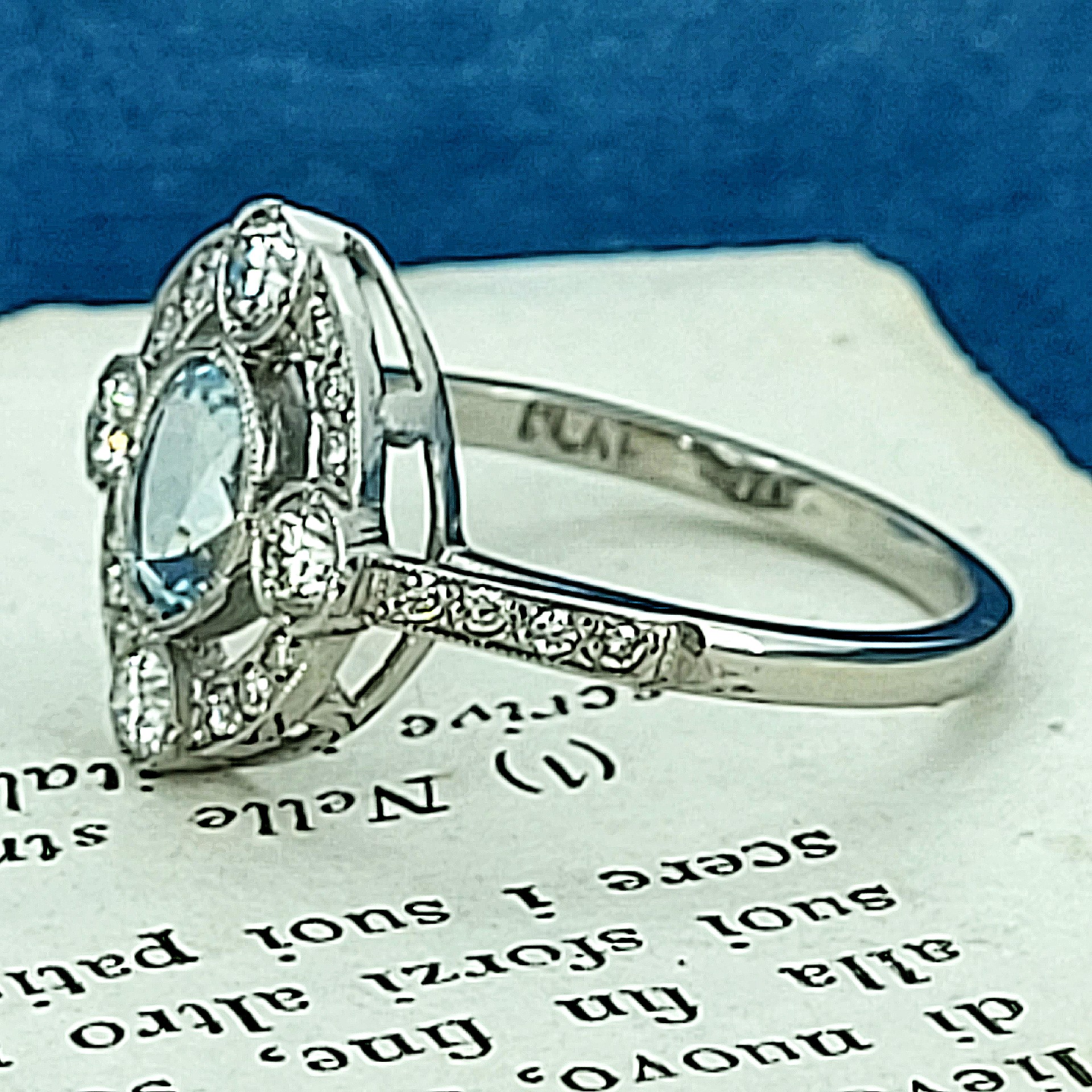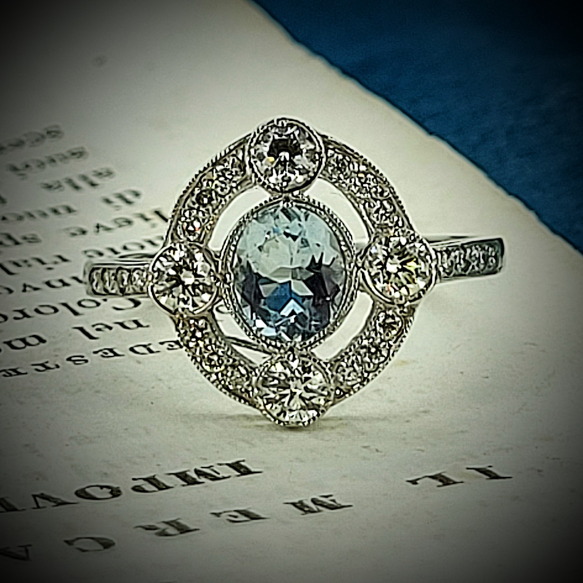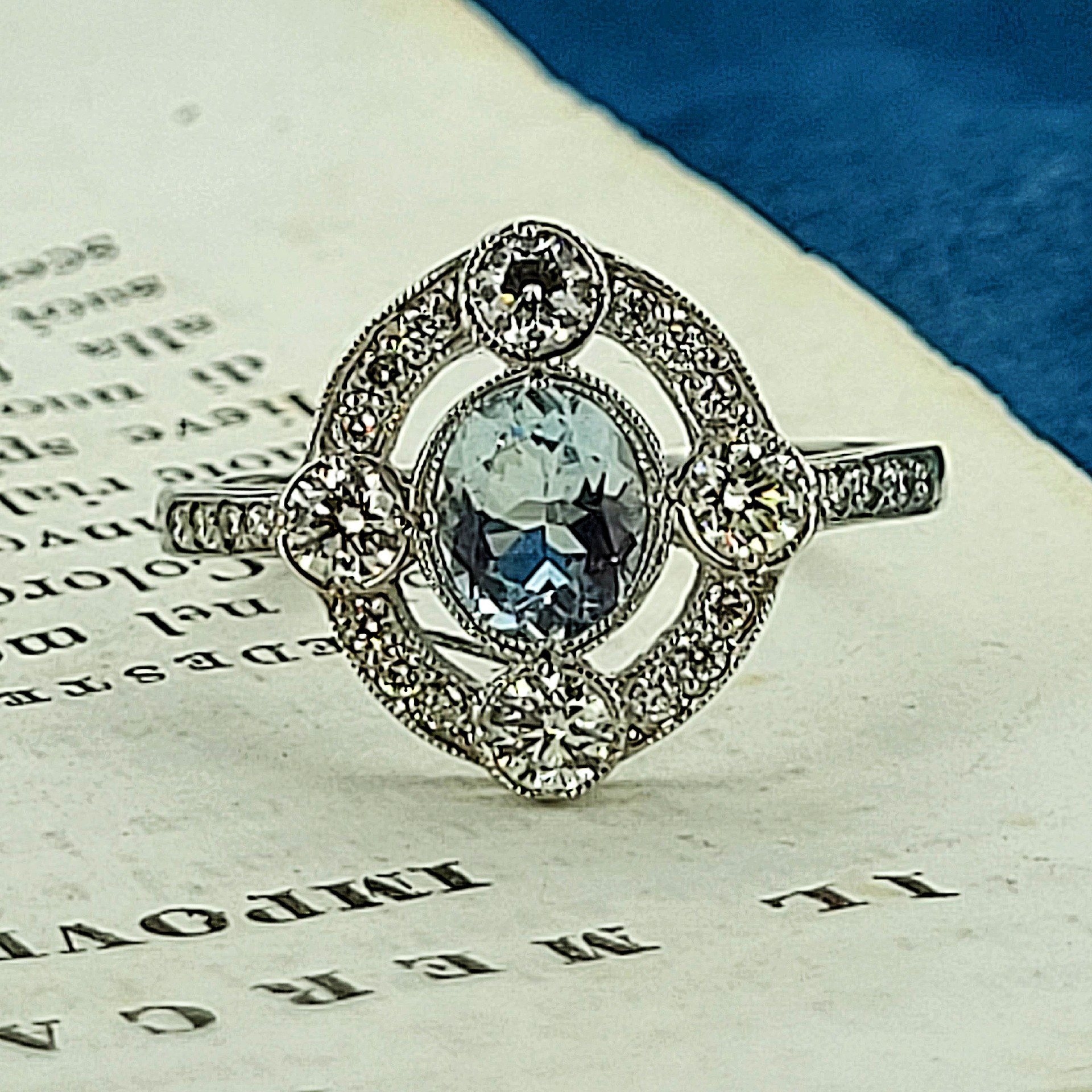 This elegant Aquamarine and Diamond Ring is one of our favourites. It is stamped Platinum and the oval Aquamarine weighs 0.75cts and is a beautiful sky blue colour. It has four round brilliant diamonds prominently rub-over set at N, E, S & W which really illuminate the colour of the Aquamarine. The Diamond surround and Diamond set shoulders set the ring off wonderfully. The total Diamond weight is 0.50cts.