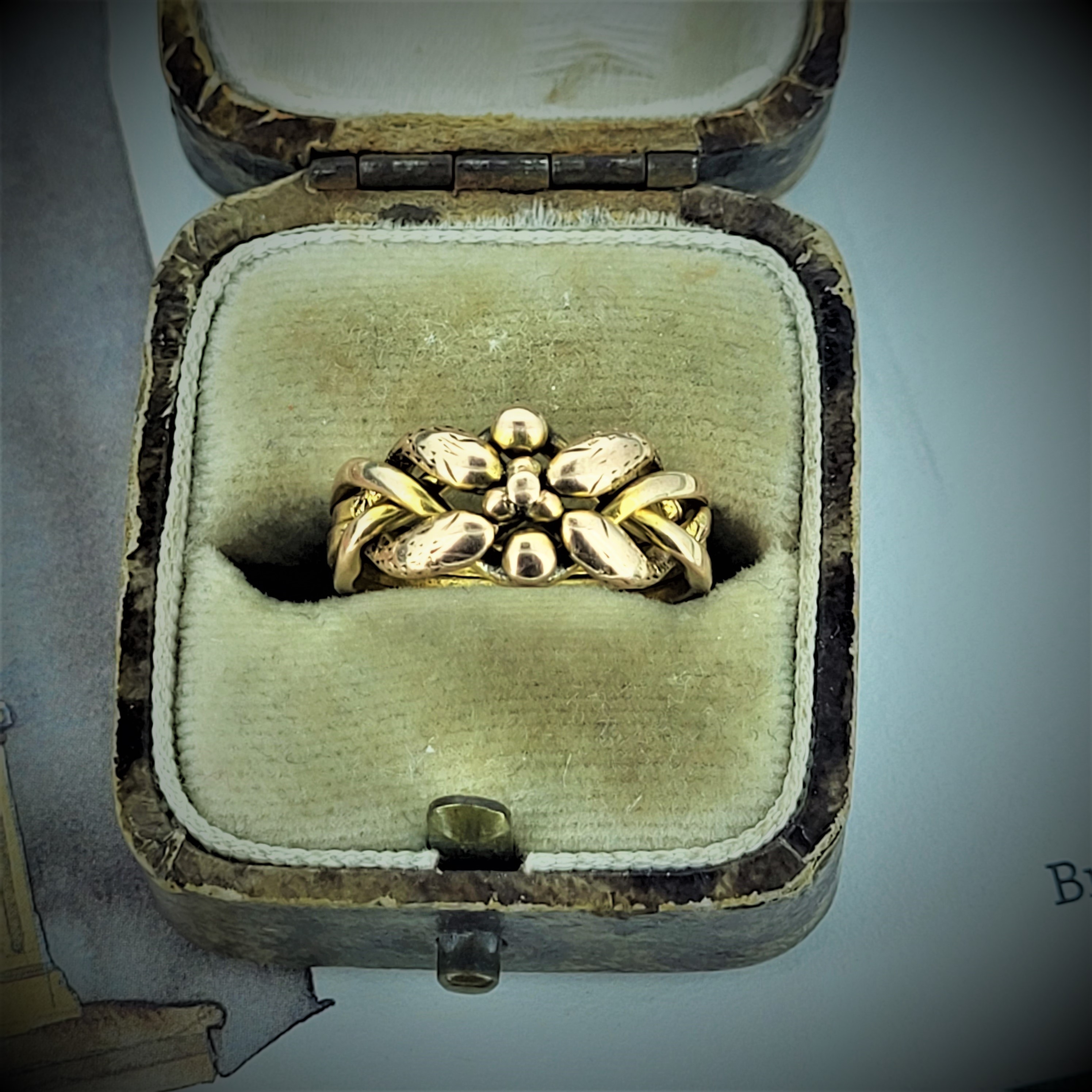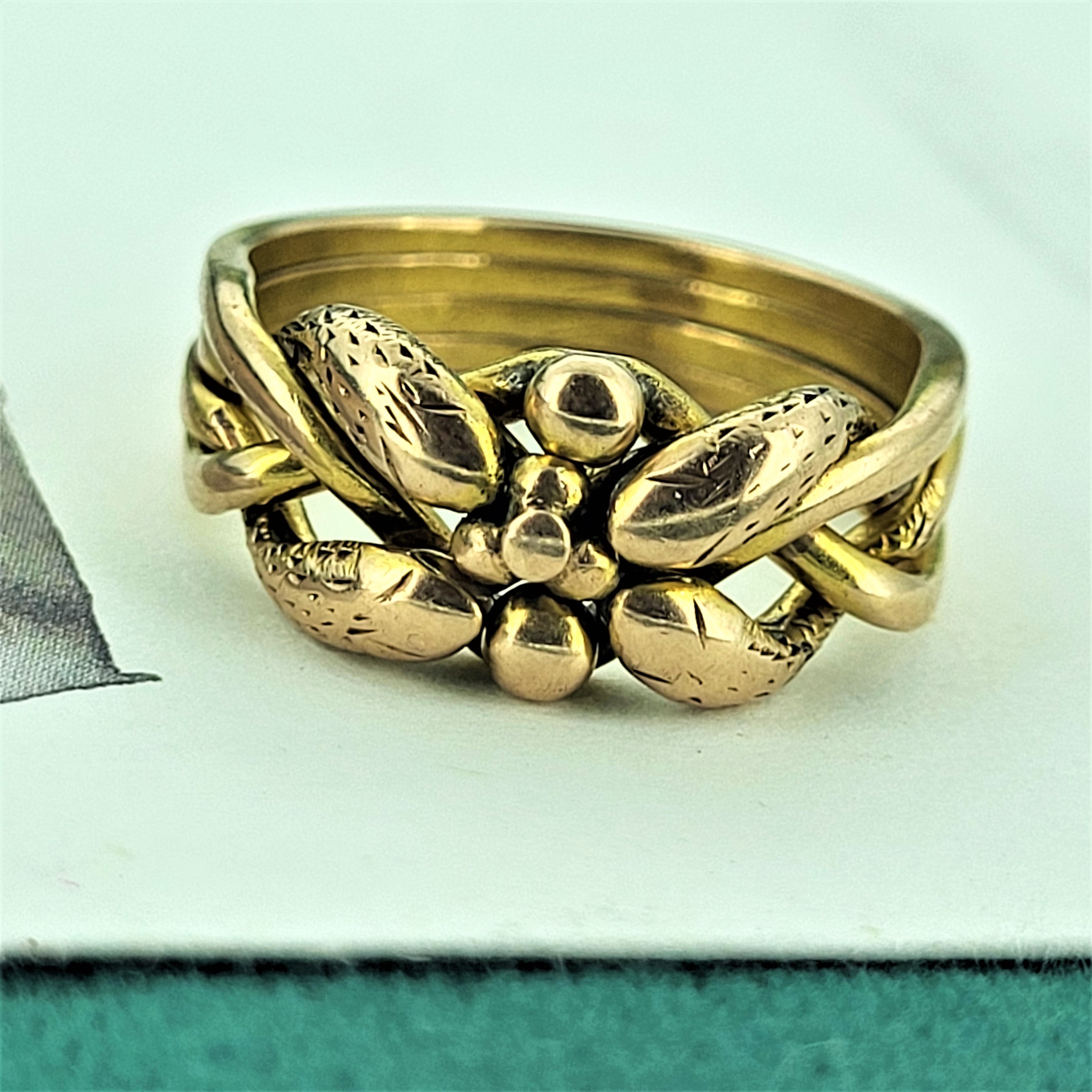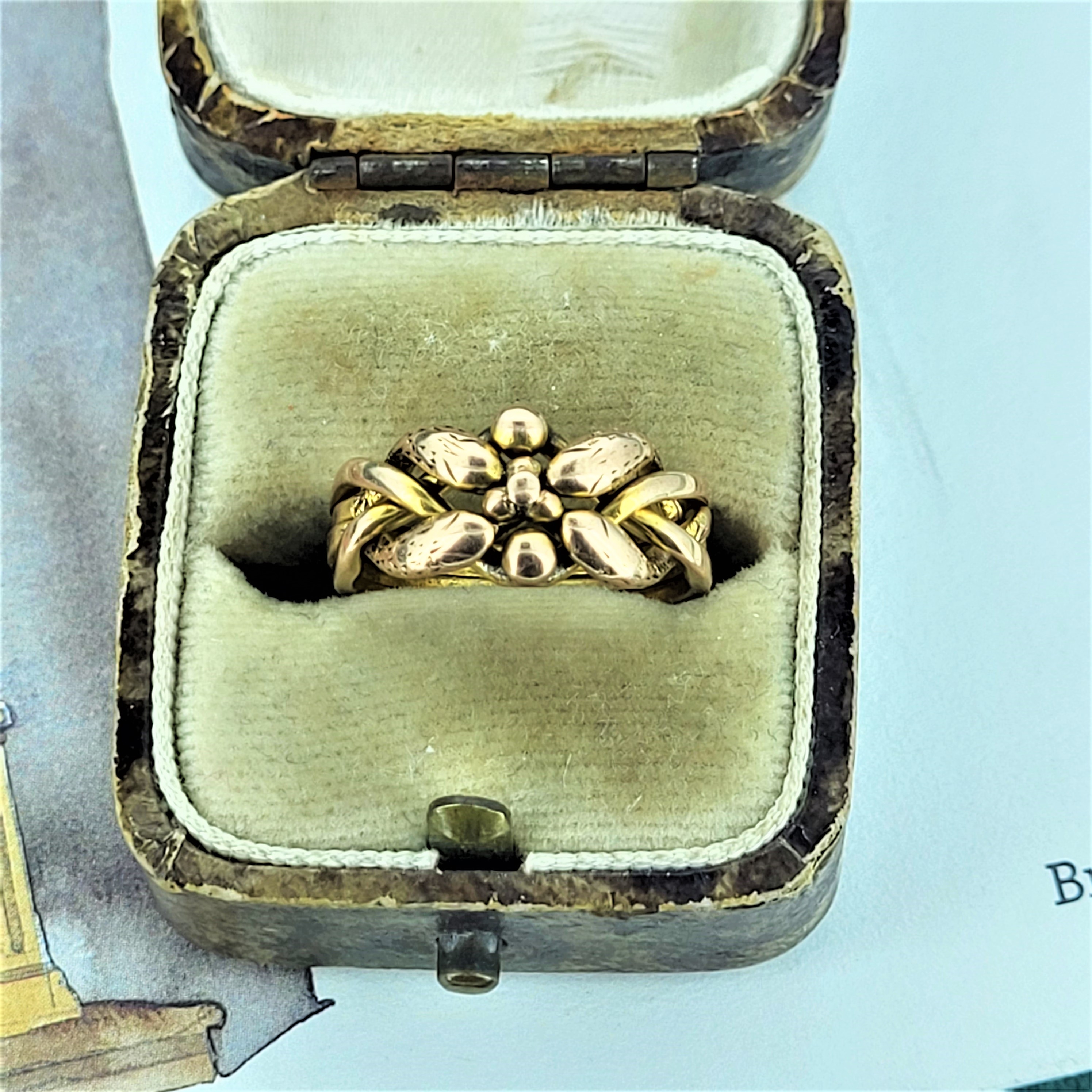 This charming 9ct Rose Gold Puzzle Ring features intricate polished bands that entwine together to create a classic puzzle design! This ring is from the mid 20th century, is comfortable, beautifully finished and unusually ornate.