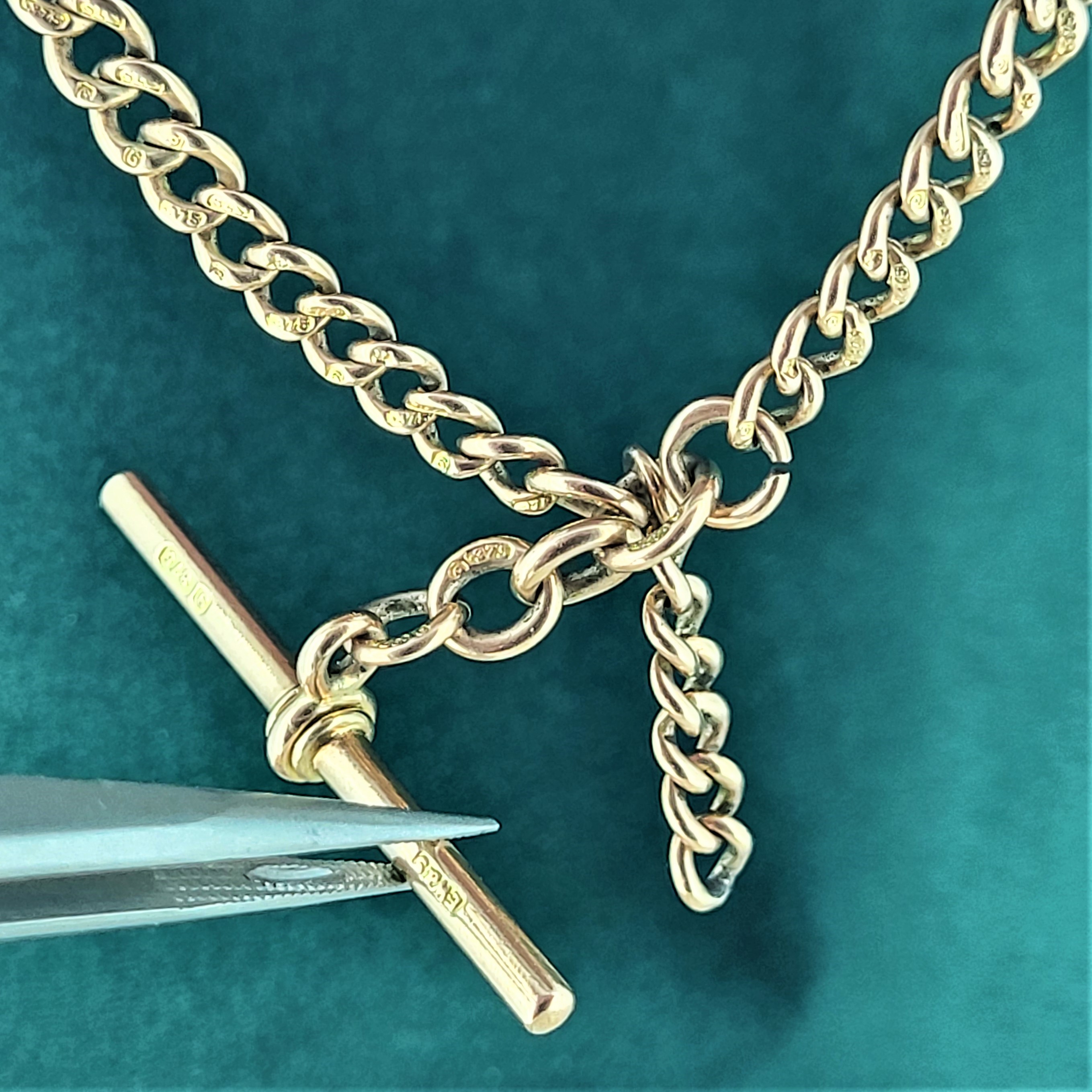 This piece is crafted from 9ct Rose Gold with solid curb chain which graduates from 4mm to 6mm and each link is individually stamped. The chain is fitted with a central rounded ring loop, from which a hallmarked T-bar suspends which is 3.5cms in length and hangs at an additional 3/4 inch. The chain is 16 inches and the extra links next to the T-bar could attach a fob, medal or another beautiful piece of jewellery which can can be removed to suit.