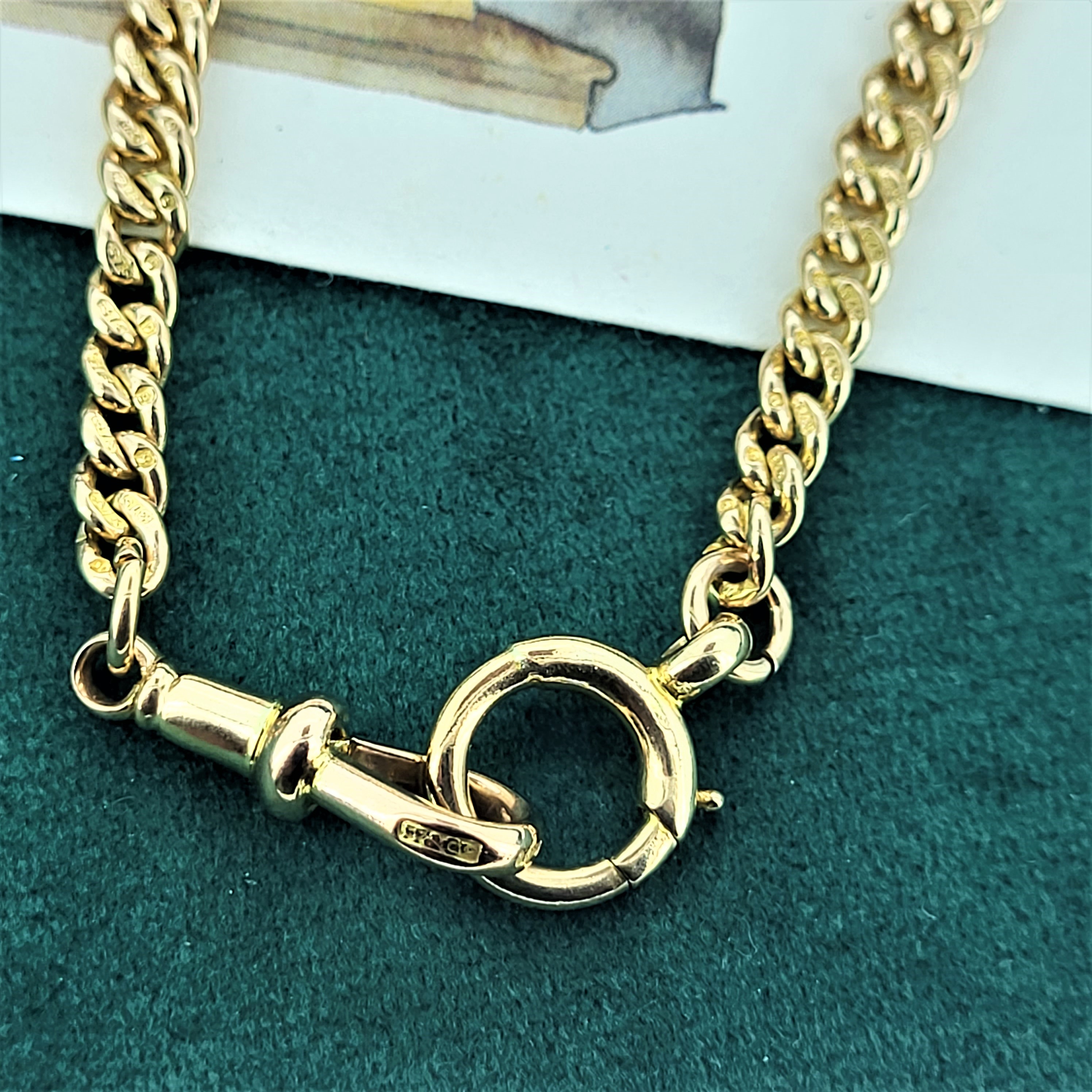This stylish piece is crafted from 9ct Rose Gold with solid graduated curb chain (graduated from 4.5mm to 7.5mm) and each link is individually stamped, giving it that extra traditional feel. This albert chain is secured by swivel and jumbo bolt ring fittings.