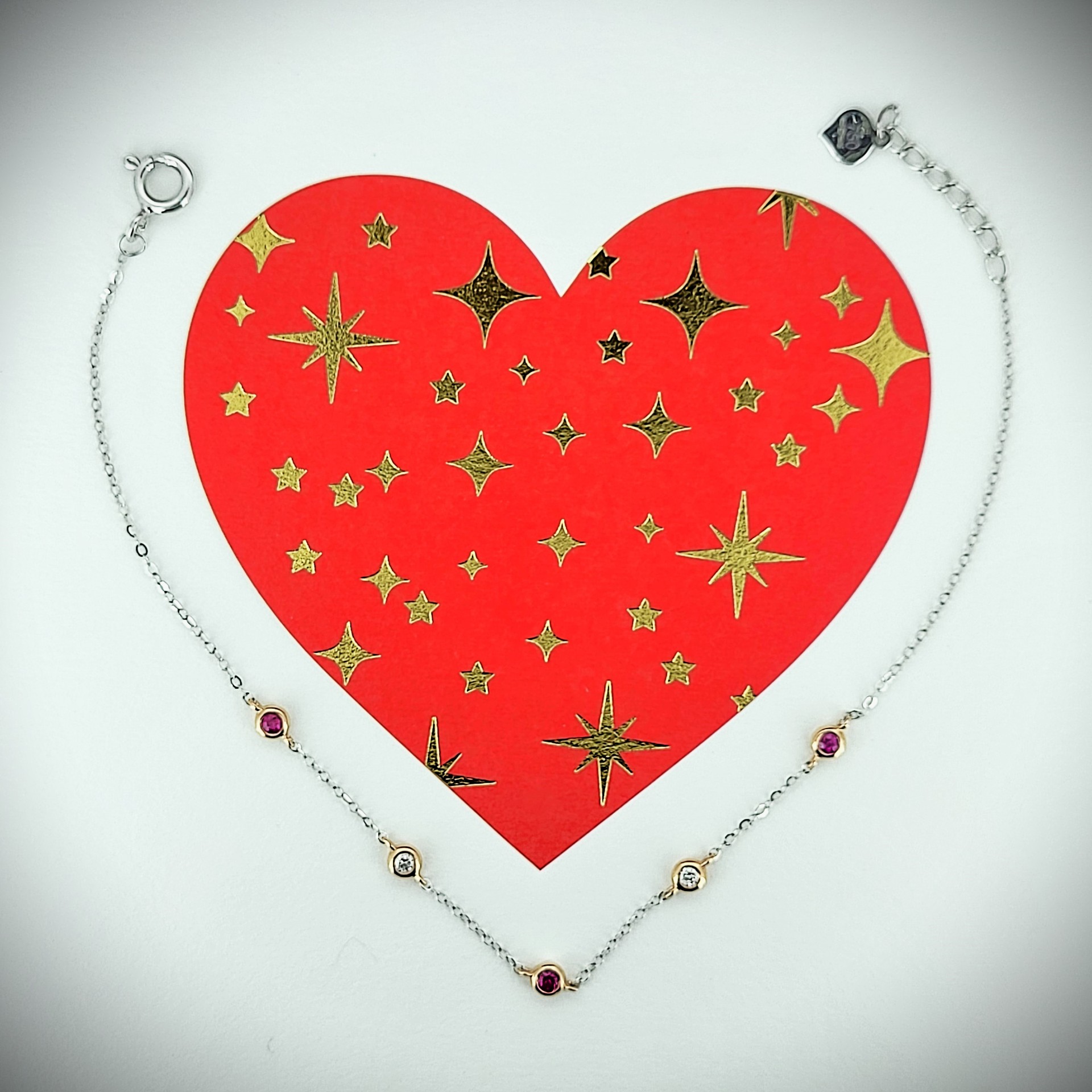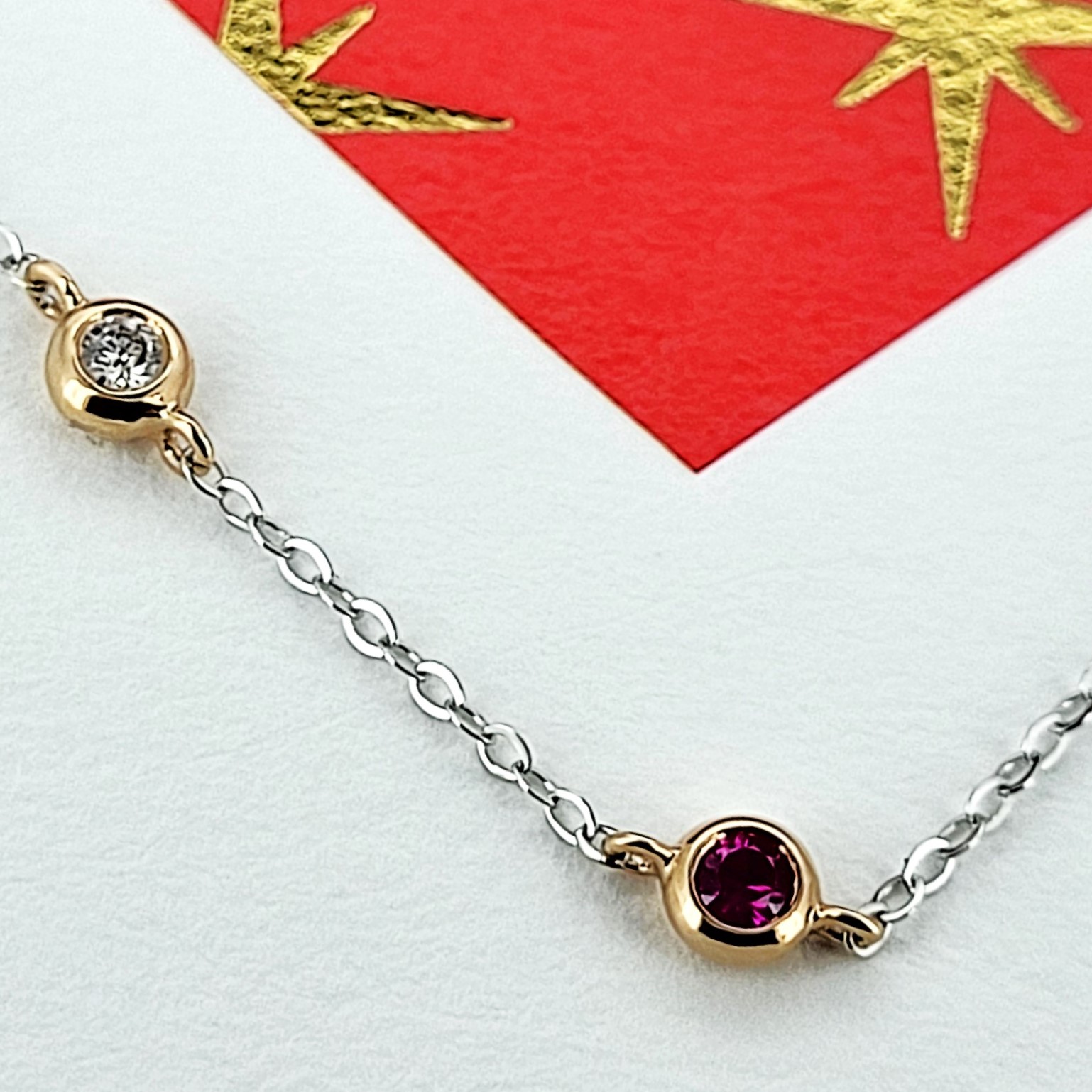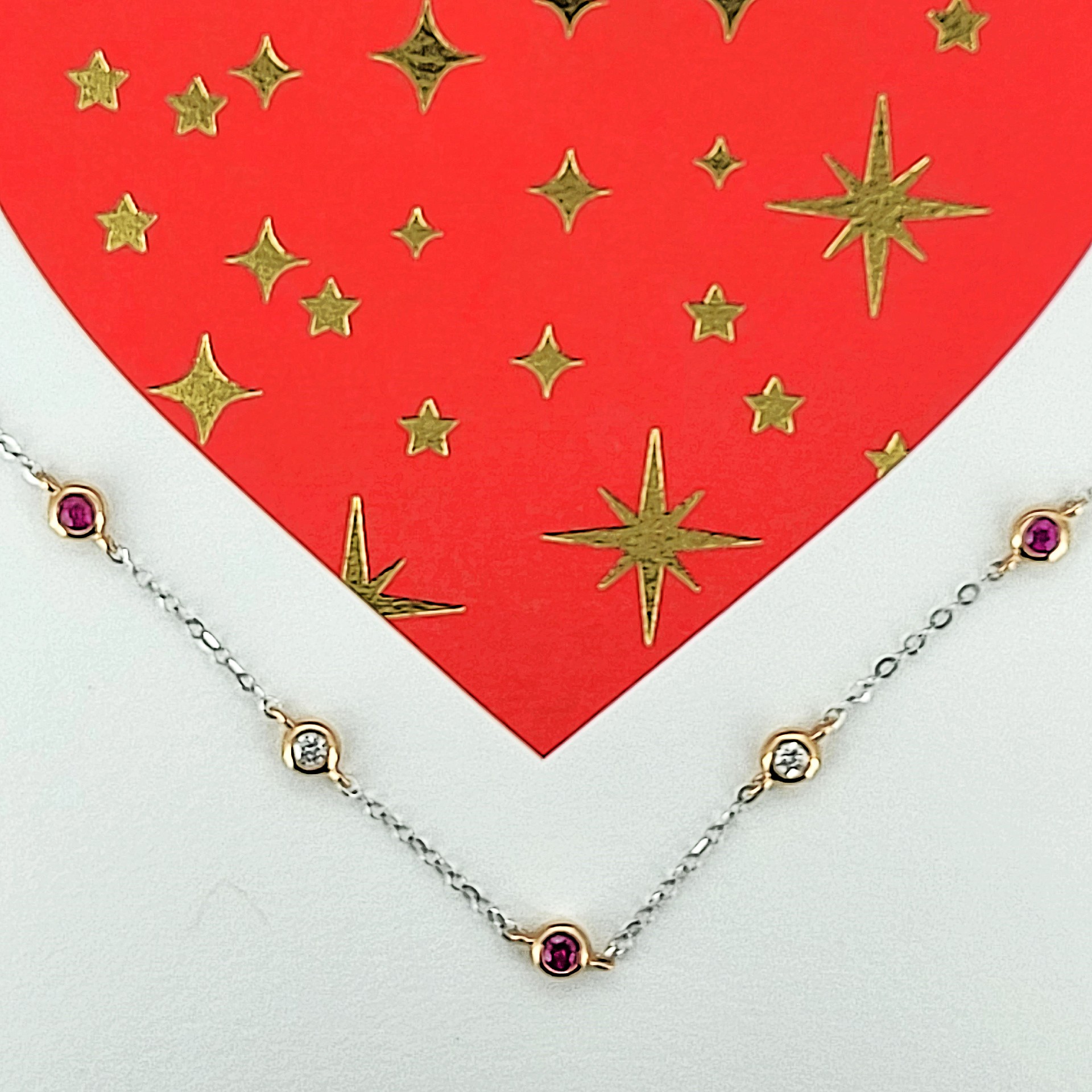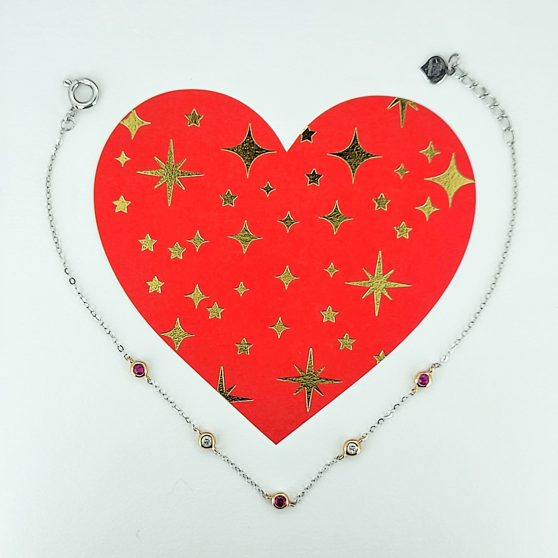 This bracelet is hallmarked 18ct, the diamonds weigh 0.05cts and the rubies weigh 0.15cts. The gemstones are set in yellow gold which give the perfect contrast between themselves and the white gold trace chain.