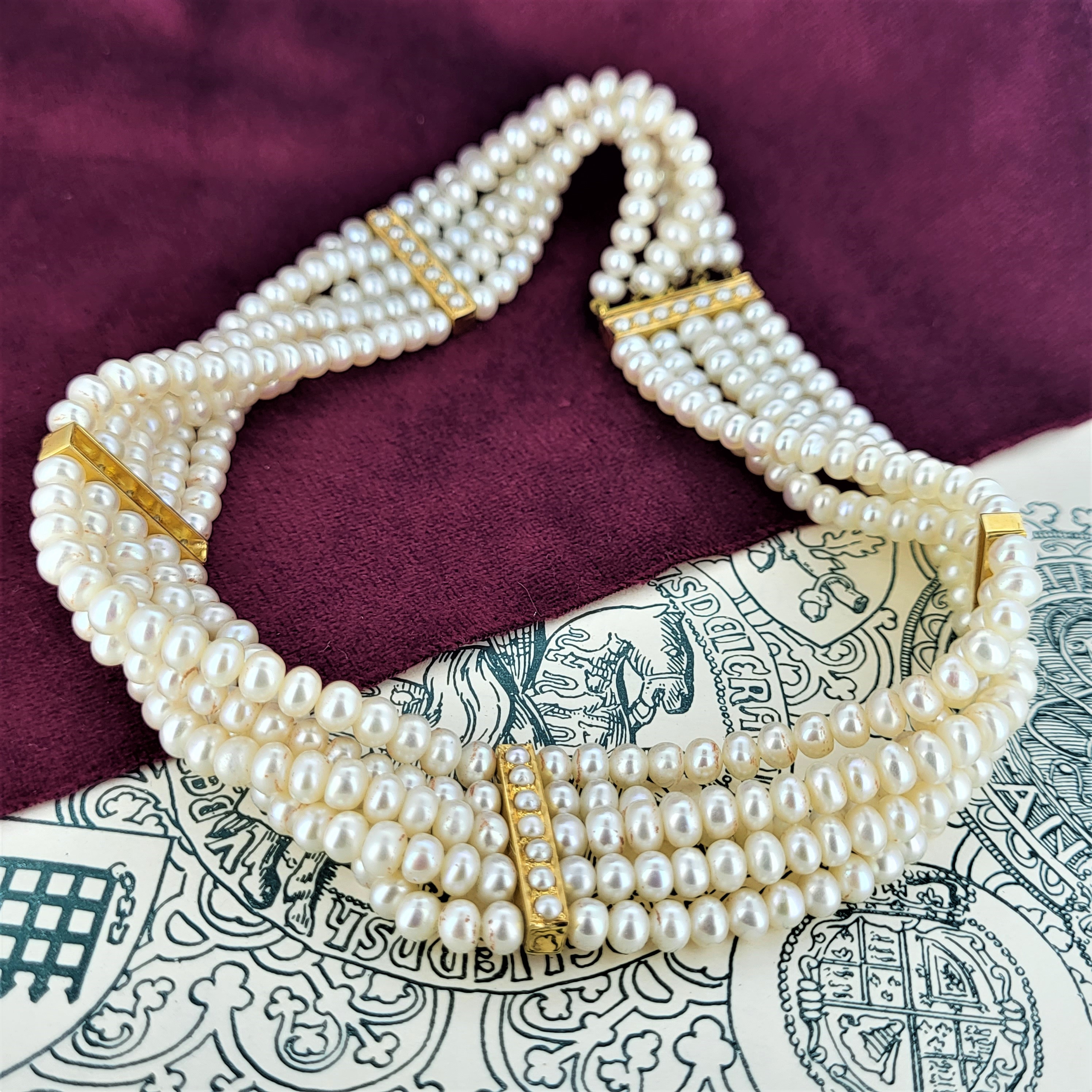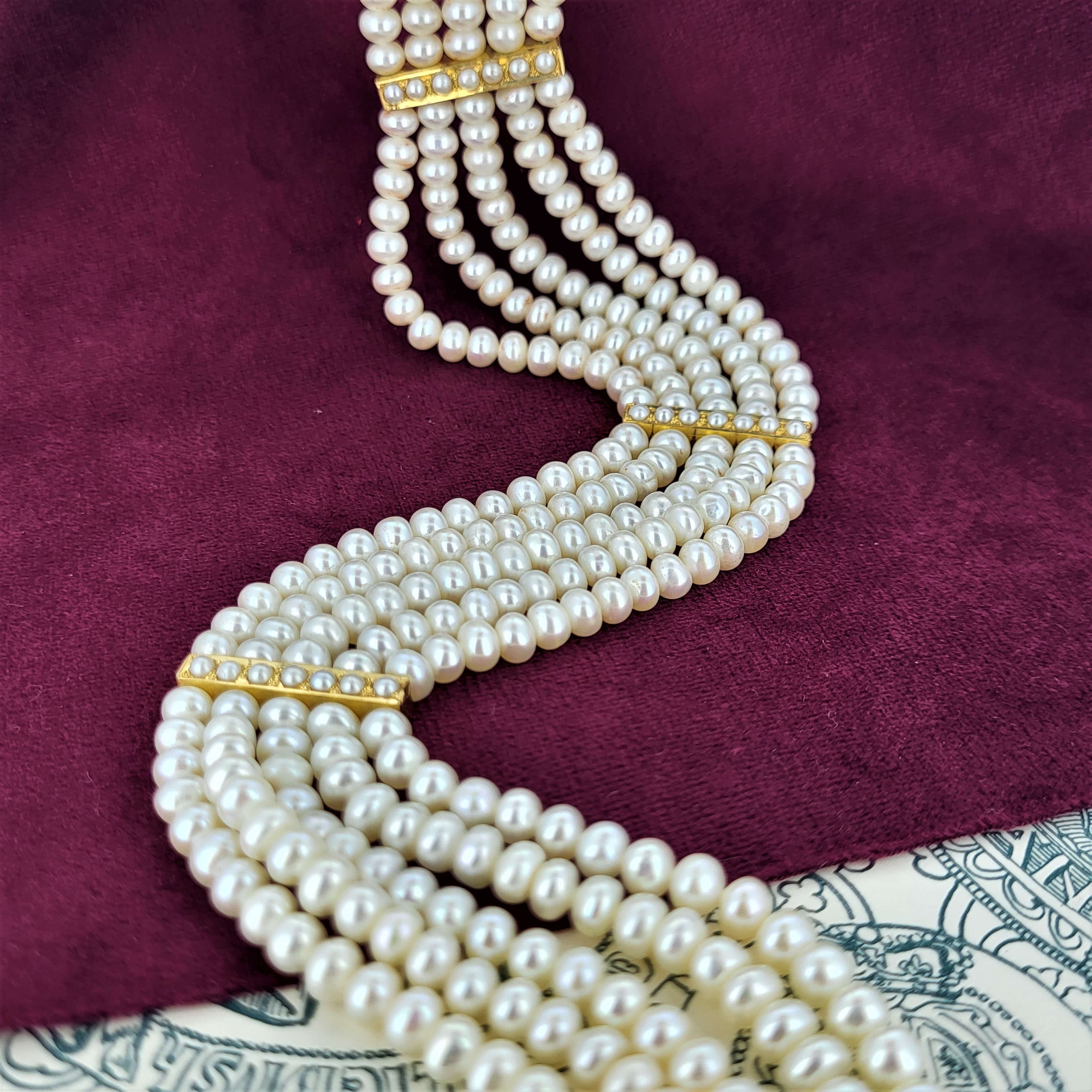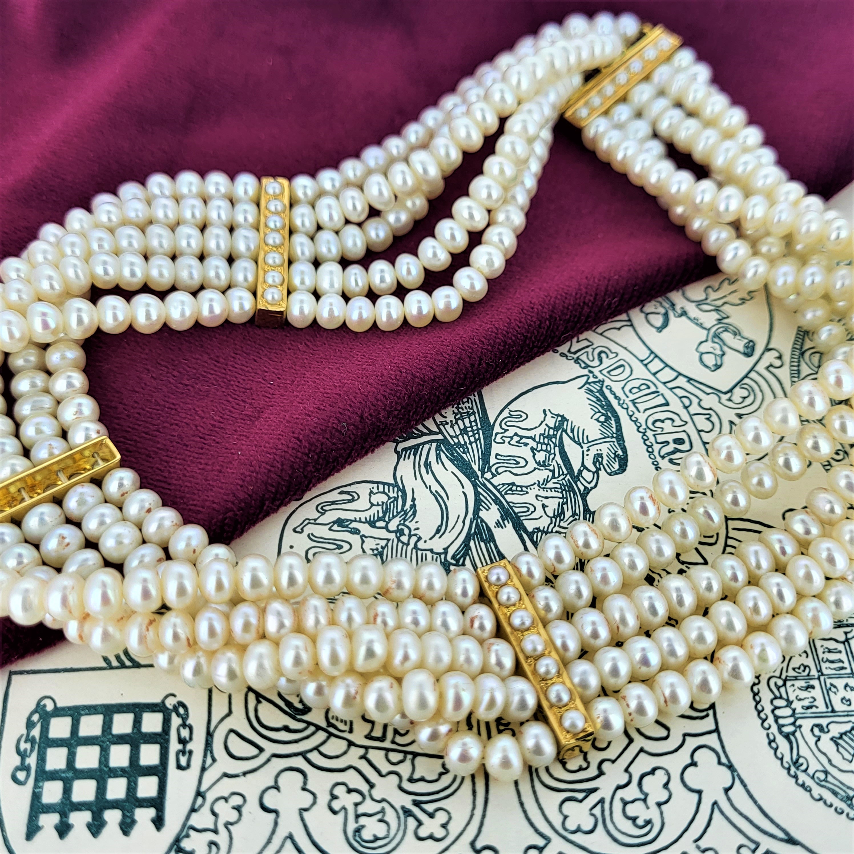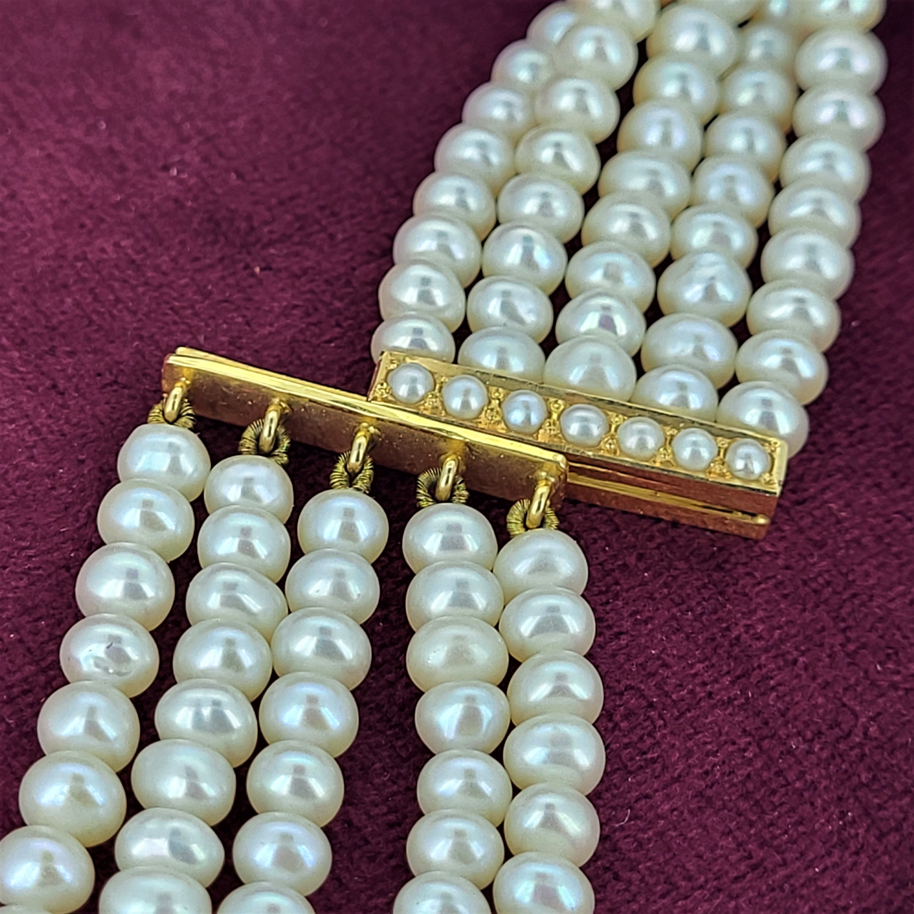 The pearls are well matched and most are oval in shape rather than round with each strand measuring 4.5mm in diameter. Each section is separated by 18ct Gold and seed pearl detailing.