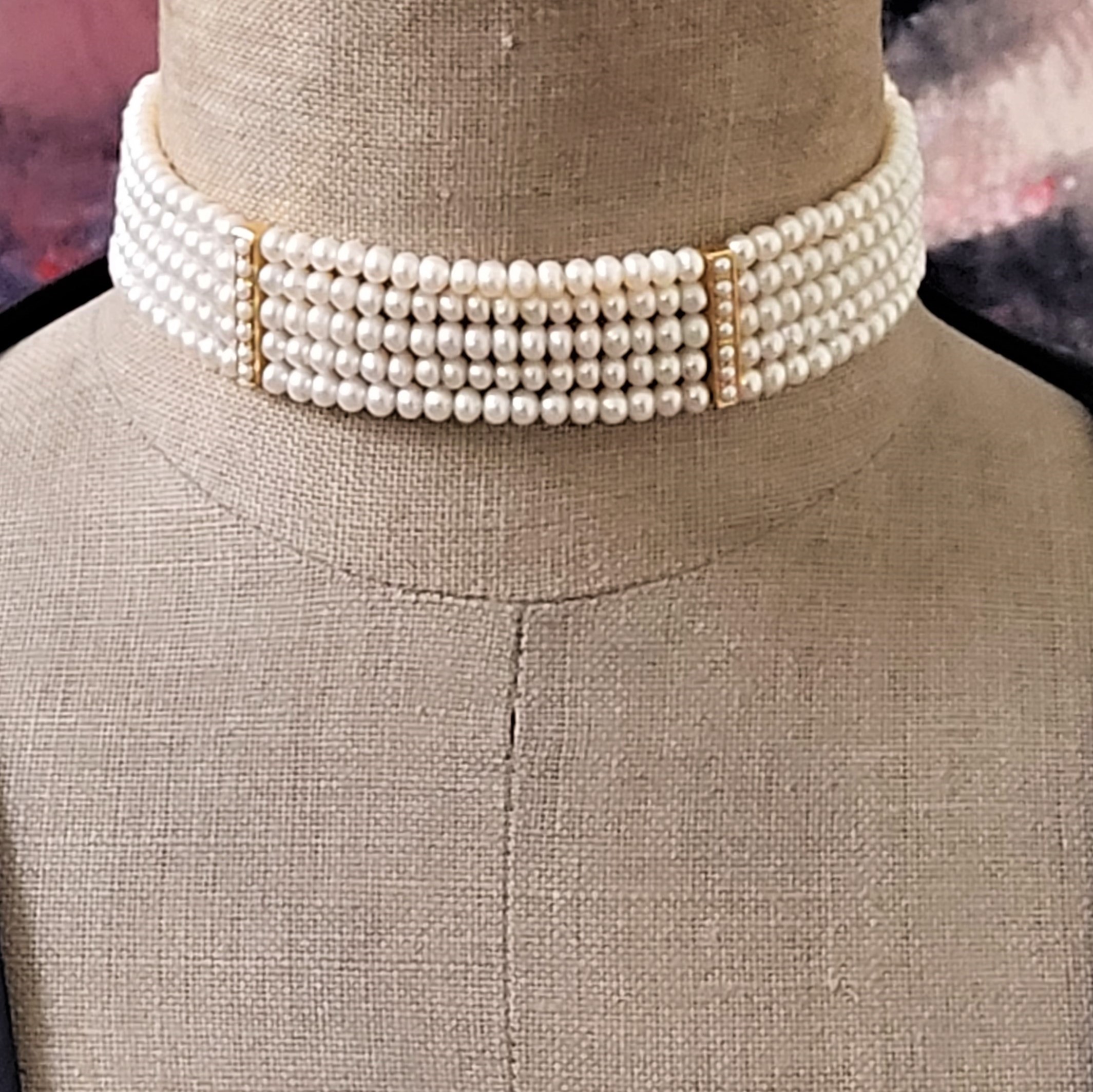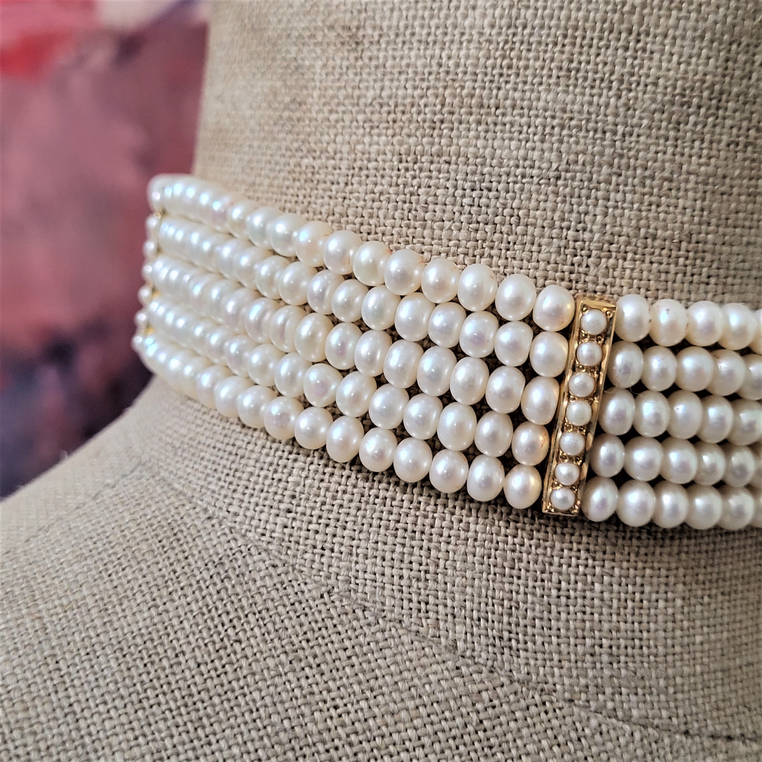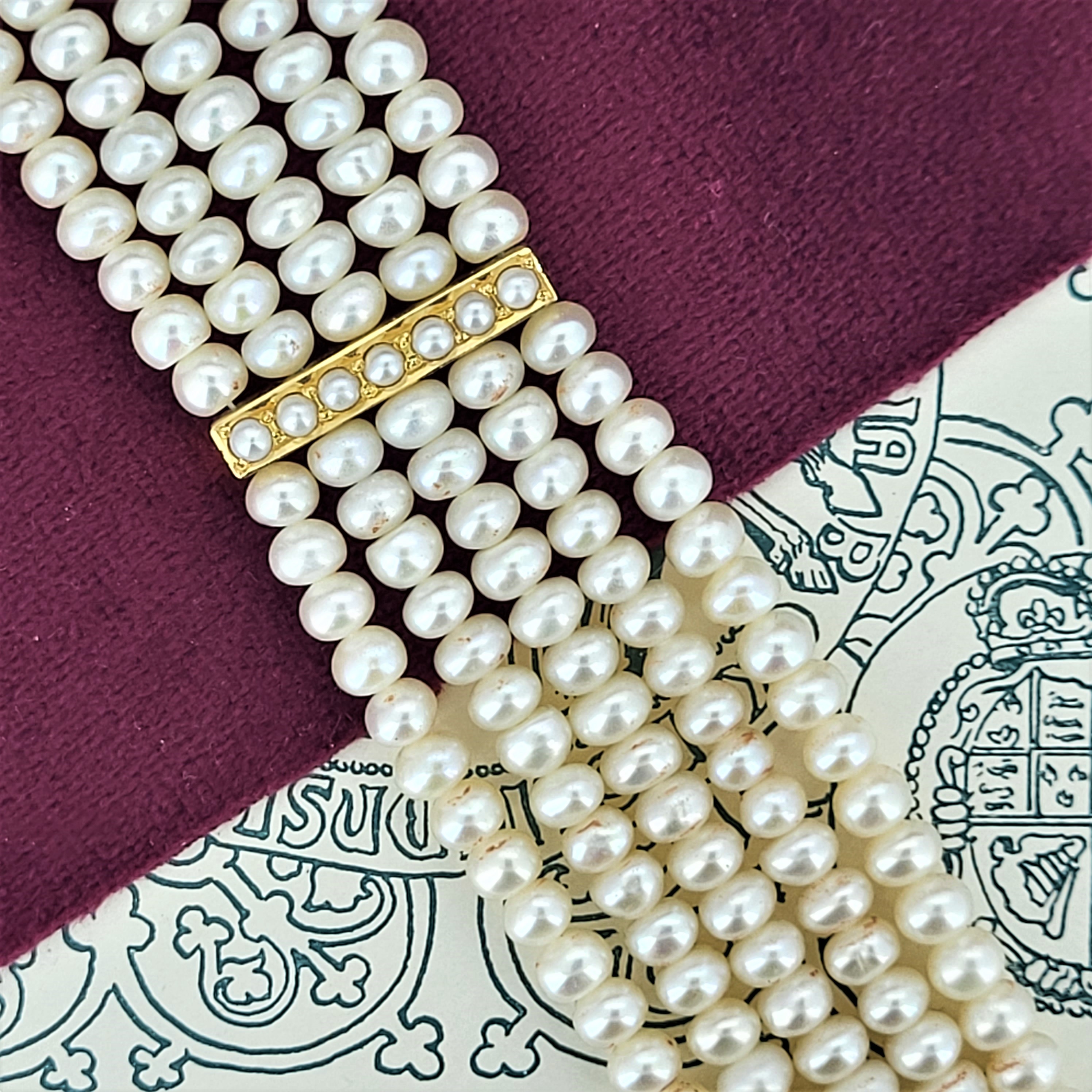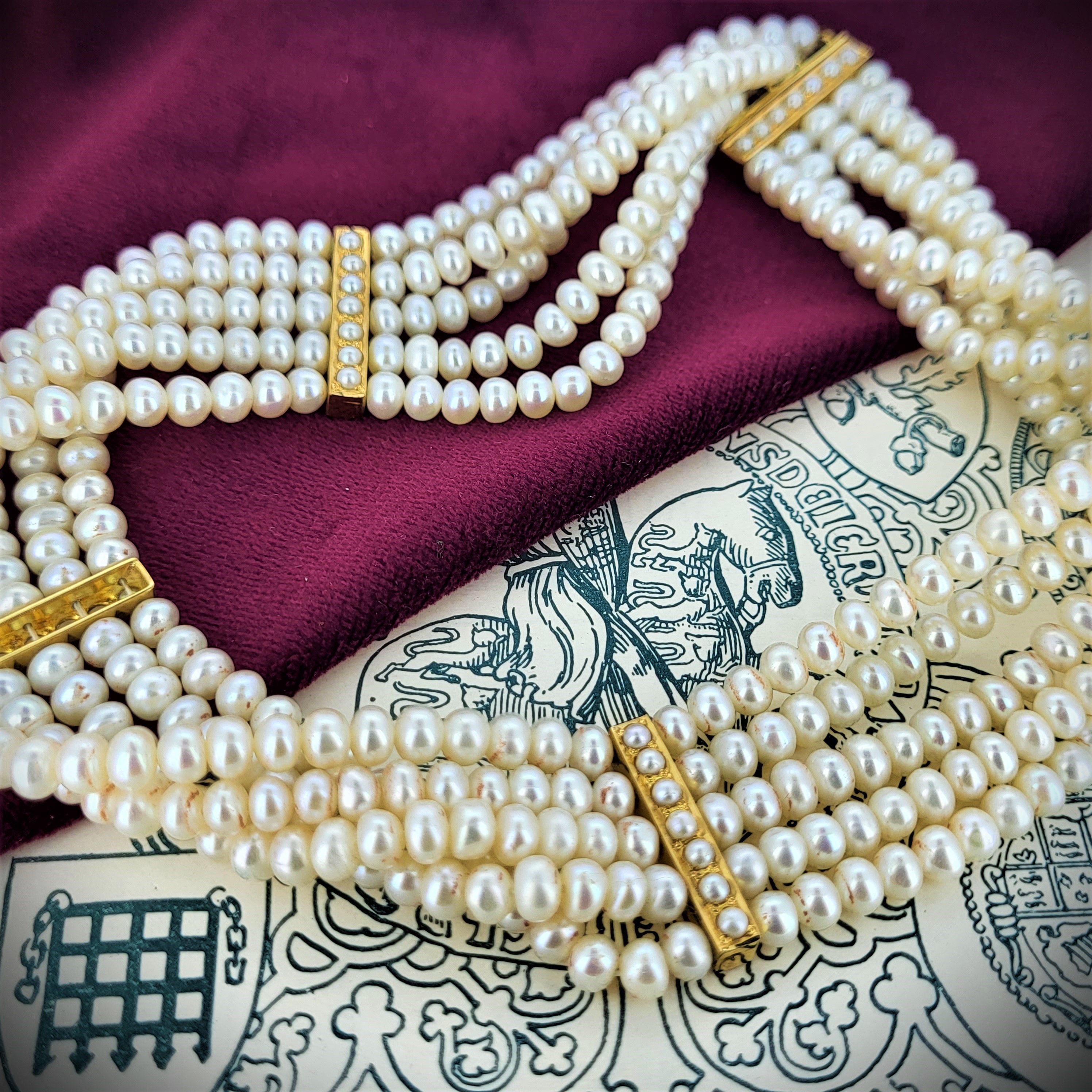 The pearls are well matched and most are oval in shape rather than round with each strand measuring 4.5mm in diameter. Each section is separated by 18ct Gold and seed pearl detailing.