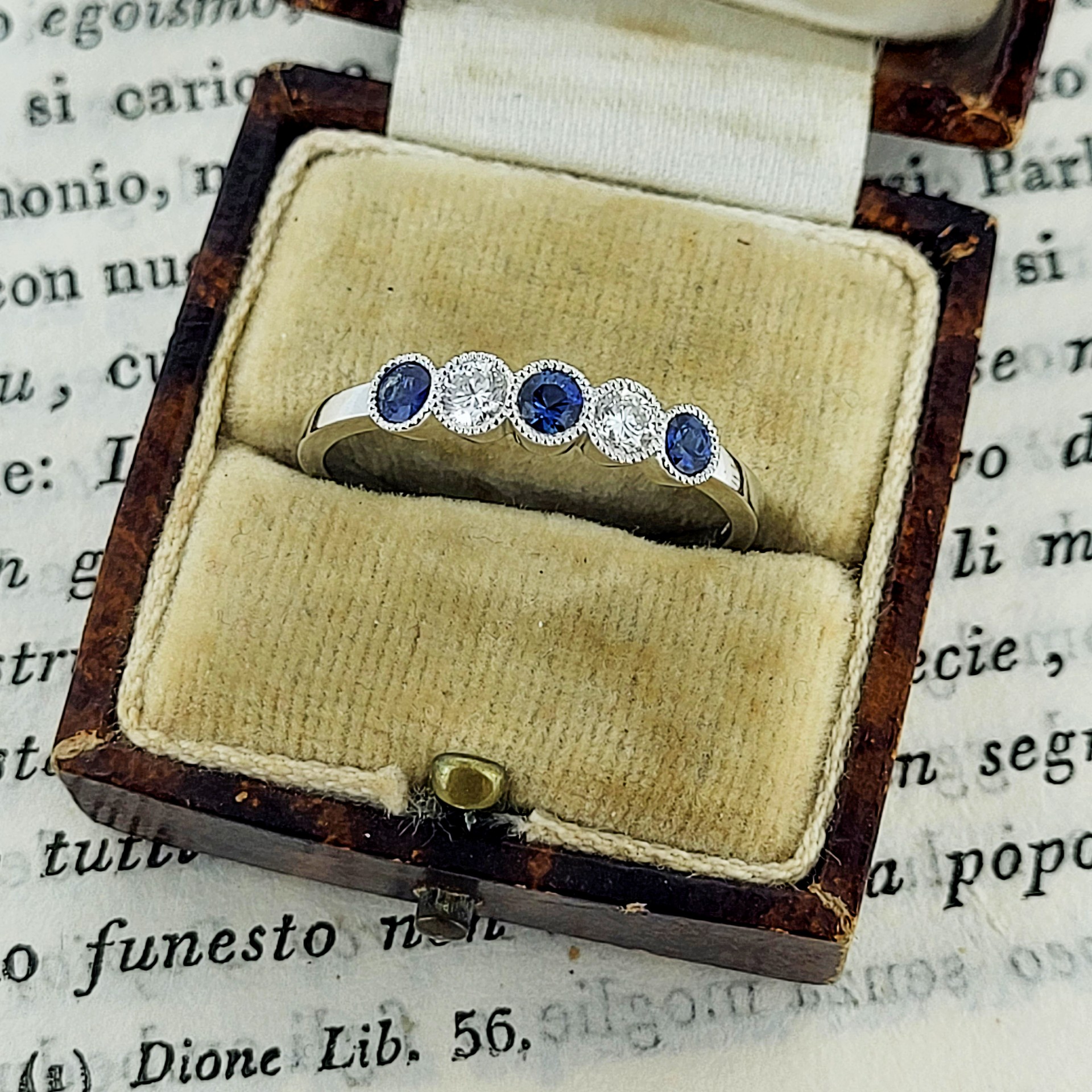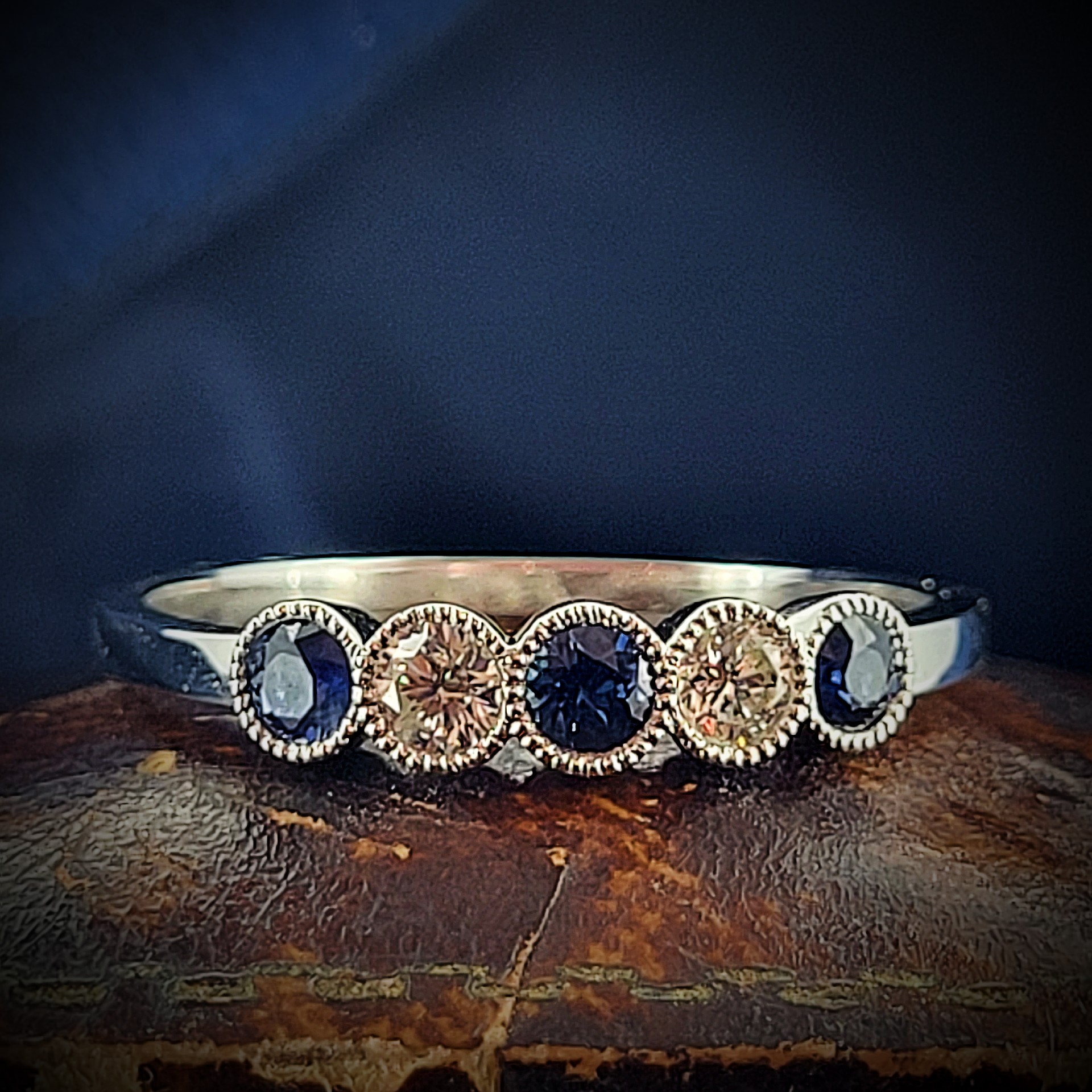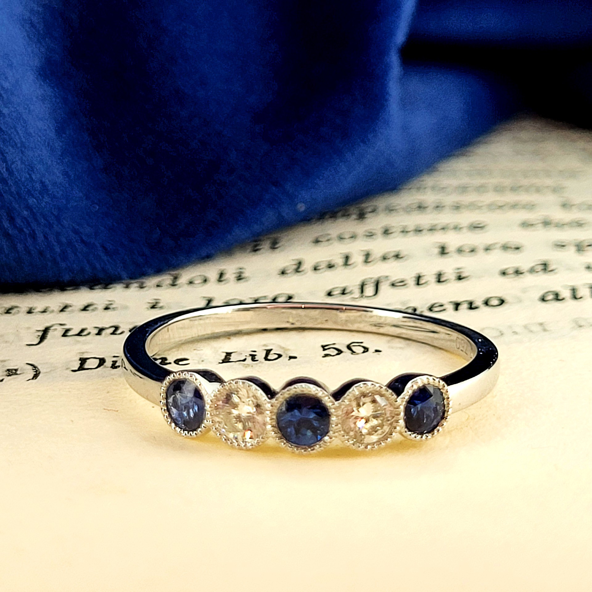 A stunning Five Stone Ring which is set with alternating Round Brilliant velvety blue Sapphires and Diamonds in a lovely rub-over setting.