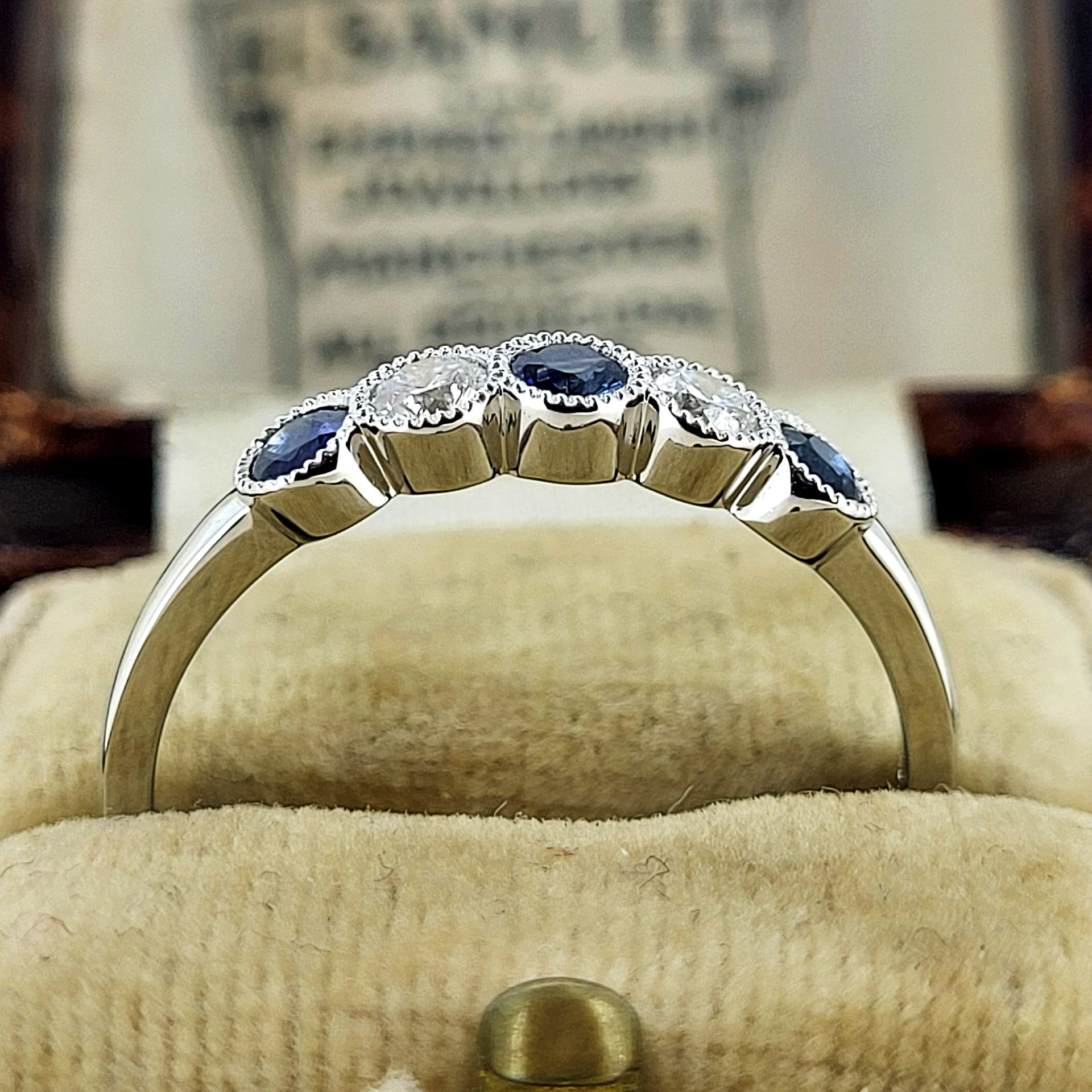 The 18ct White Gold setting really accentuates the deep colour of the Sapphires. The Sapphires weigh 0.36cts and the total Diamond weight is 0.24cts. The setting is complimented by a hand engraved milled edge.